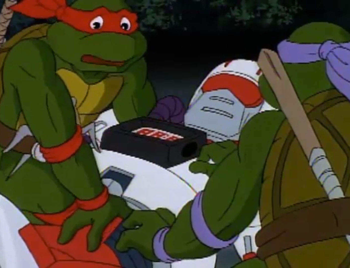 Les tortues supposaient que leur frère était retenu prisonnier dans les souterrains du parc. Leonardo essayait de pénétrer par un petit local, mais la porte était fermée. Impossible également de contacter ses frères, quelque chose brouillait la fréquence de son tortuecom’. Soudain, un motard du futur arrivait sur son véhicule. Il s’agissait du chef des robots ! La tortue l’esquivait jusqu’à le faire tomber. Elle s’emparait du bolide et traversait la porte. Le ninja n’était pas au bout de ses peines, il se cachait dans une conduite d’aération à la vue du chevalier noir.