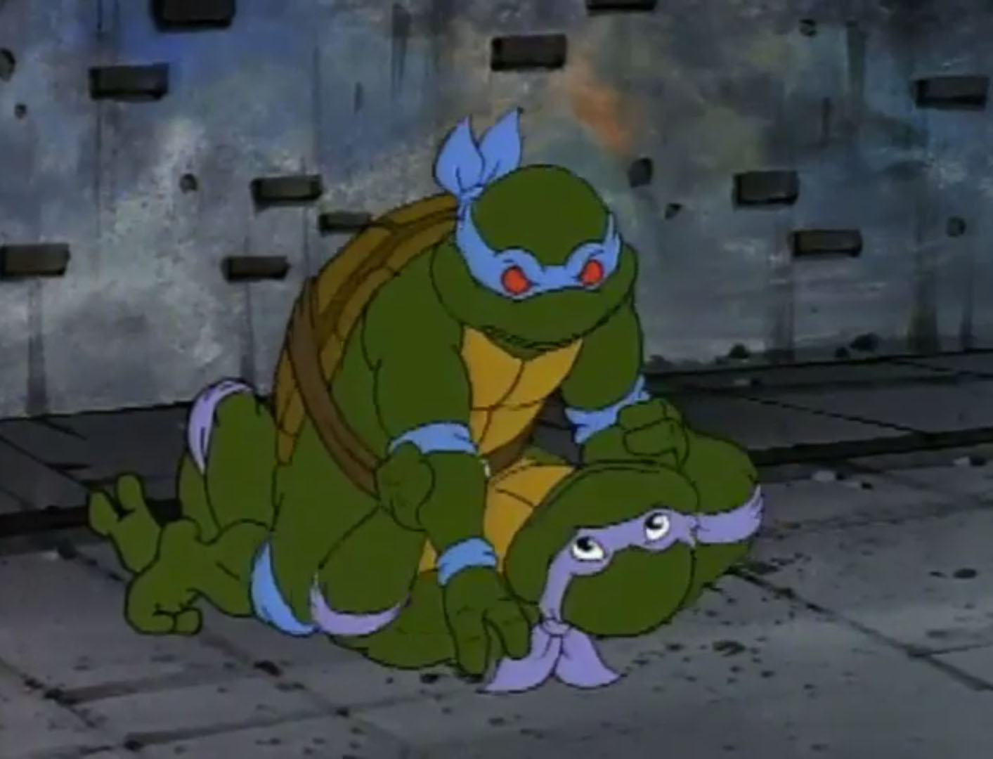 La tortue avait été placée dans une pièce, attachée. L’assistant de Stressbar avait réalisé une étude du ninja pour en faire un clone. Il acceptait que son prisonnier soit détaché. Michaelangelo filait au plus vite vers la sortie, mais son chemin était barré par les scientifiques qu’il avait croisés dans les égouts.