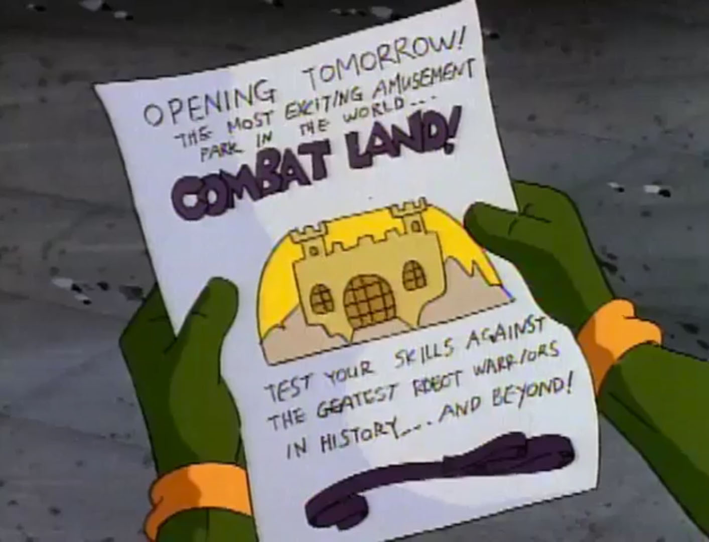 justement un reportage sur Combat Land. Son directeur, M. Stressbar, présentait les trois zones dédiées du parc d’attraction. Shogun land, Medieval Land et Futur Land. Chaque zone était protégée par des robots de combat propres à ces périodes et univers. Impossible de faire du mal aux visiteurs, ils s’autodétruiraient avant de risquer quoi que ce soit. Toutefois, l’homme avouait aux journalistes que son parc ne pourrait pas ouvrir le lendemain. Ses robots n’avaient pas encore subis tous les tests et pouvaient encore se montrer dangereux. Pour ne pas que son reportage tombe à l’eau, Irma suggérait à April d’inviter les tortues. Elles pourraient se battre contre les machines et valider, ou non, l’ouverture. Voilà qui l’intéressait au plus haut point !
