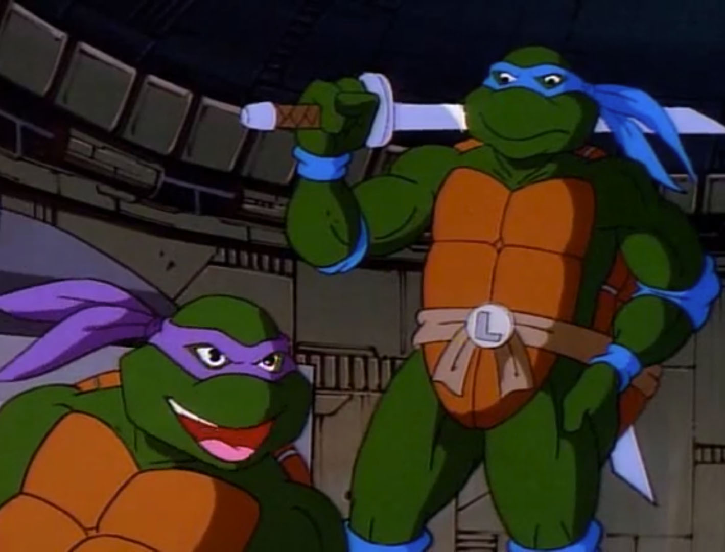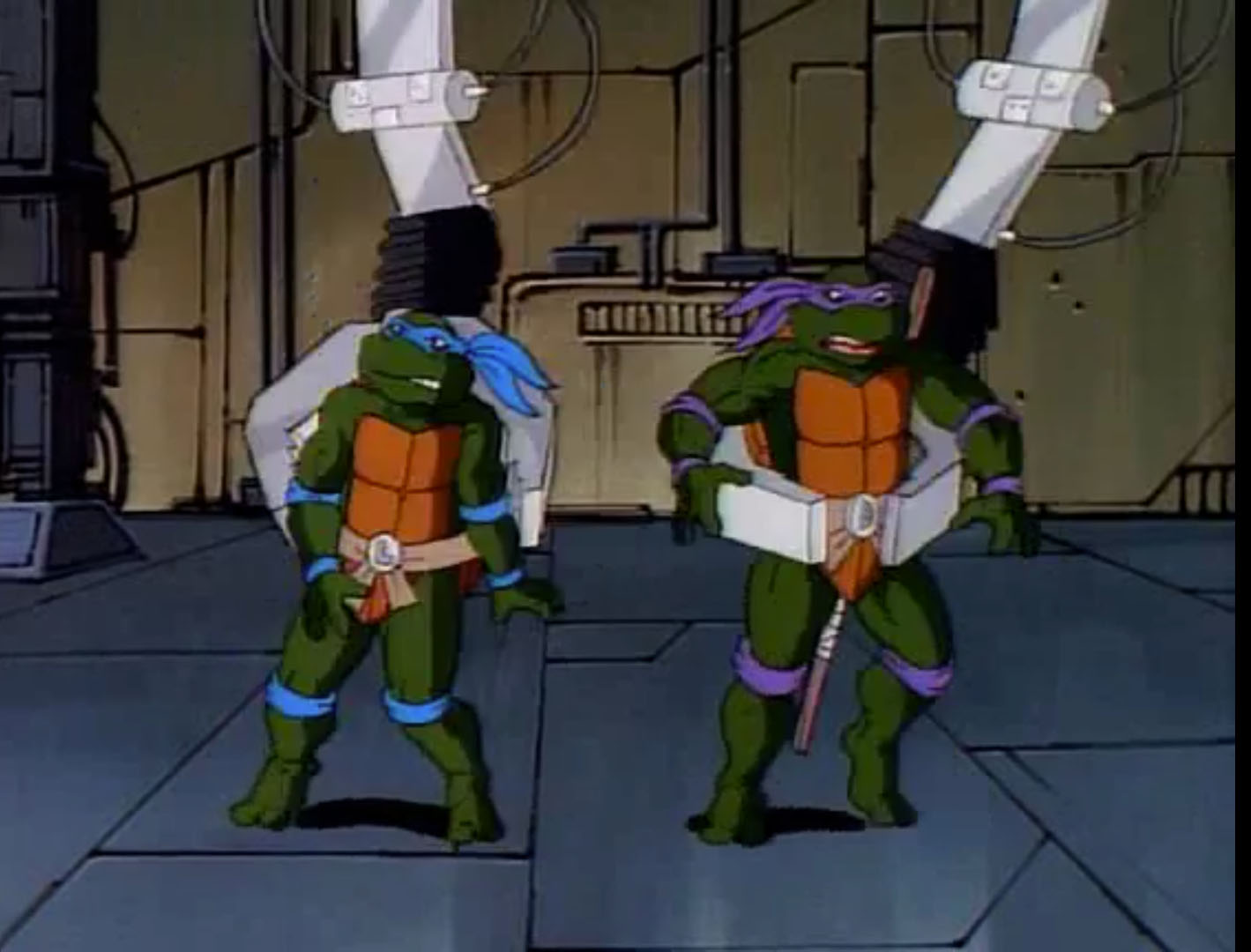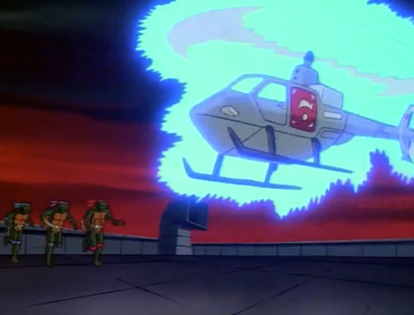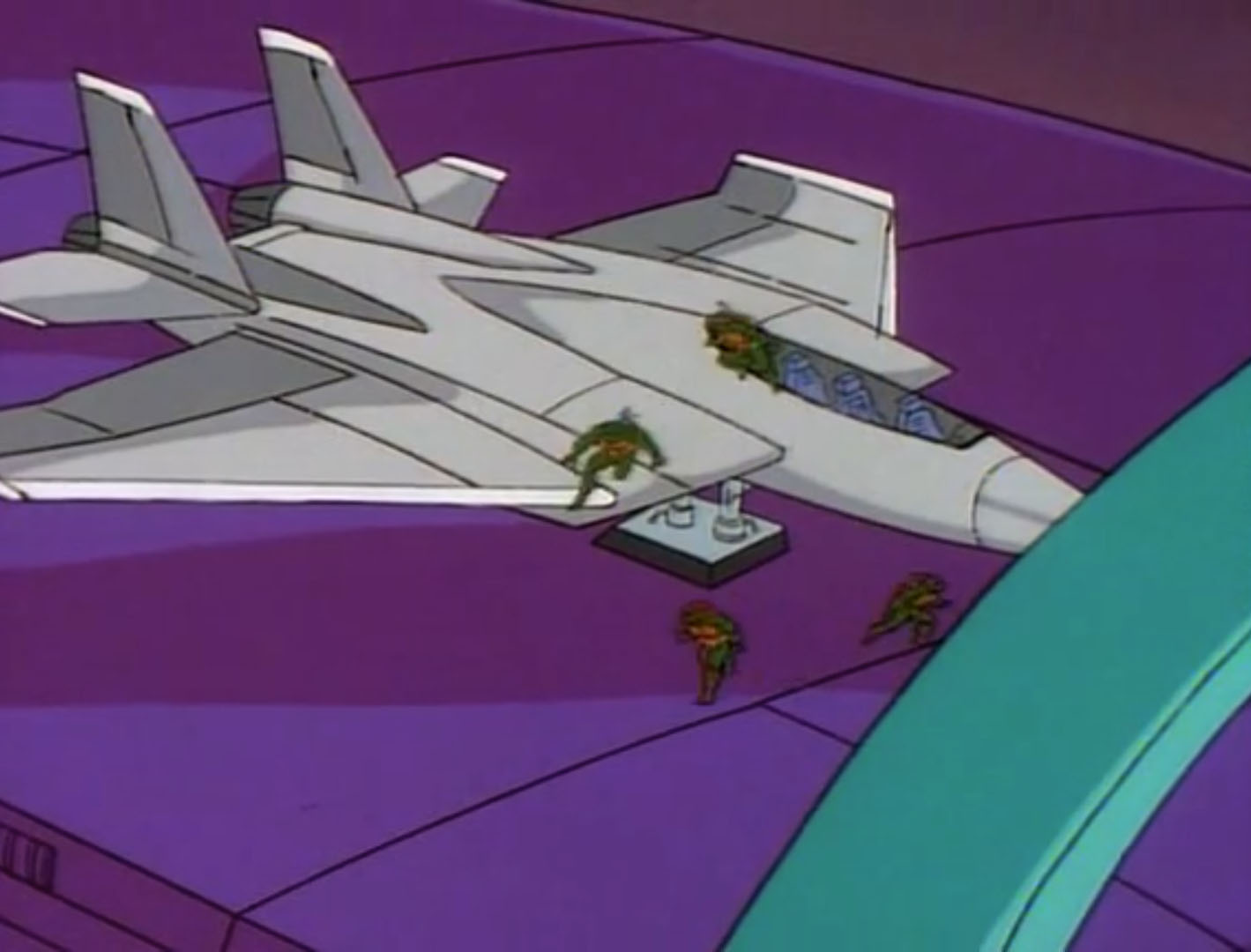Une fois le combat terminé, Leonardo recevait un appel de Michaelangelo qui les avertissait que leurs ennemis avaient mis au point une sorte de « soucoupe volante ». Son comportement récent n’aidait pas à être crédible. Heureusement pour ses frères, il les avait retrouvés à bord d’un avion de chasse. Il les interceptait, et ensemble, partaient à la recherche de leurs ennemis. Au bout de quelques minutes, ils retrouvaient la plateforme volante de Titanus. Michaelangelo posait l’avion sur le vaisseau et les quatre tortues l’abordaient.