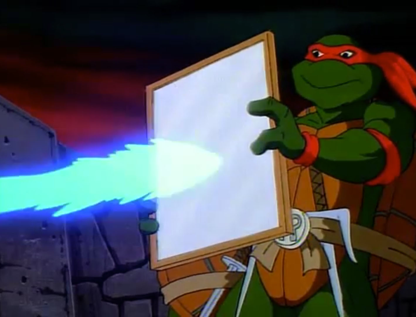 là son point faible et s’emparait d’un miroir. Les surfaces réfléchissantes devaient leur permettre de venir à bout de la boule d’énergie ambulante. Mieux encore, le génie de l’équipe voyait dans la cour de l’entreprise une antenne de radio. Raphael et Leonardo repoussaient les attaques de Synapse, tandis que leur frère terminait de configurer l’antenne. Leur ennemi se dirigeait vers lui et plongeait dans la console de l’appareil. Il était immédiatement envoyé dans l’espace. C’en était terminé de ce mutant qui terminerait sa vie dans les ondes radio. Il ne serait plus un danger pour personne.