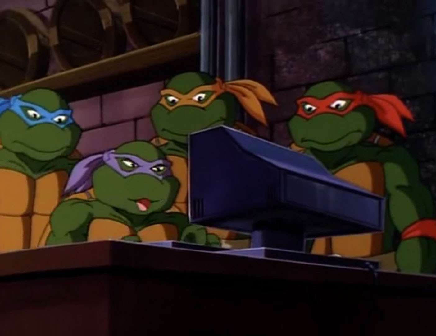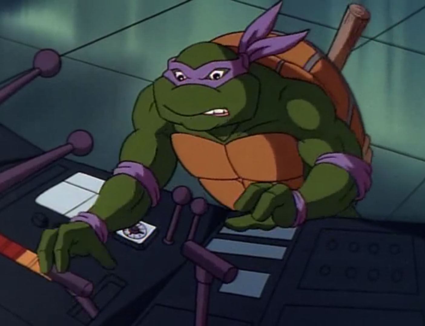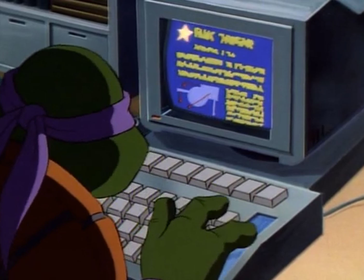 Les tortues passaient par les égouts et arrivaient dans le bâtiment voulu. Donatello s’empressait de trouver un ordinateur. Après quelques minutes à pianoter sur la machine, il trouvait le fichier désiré. Pour y accéder, il avait besoin d’un mot de passe. Les tortues n’avaient pas le temps de chercher, le génie forçait l’accès. Les alarmes retentissaient au même moment. Il dégainait une disquette pour enregistrer les données. Un premier militaire entrait dans la pièce. Les tortues le poussaient à l’aide d’un bureau et quittaient le lieu.
