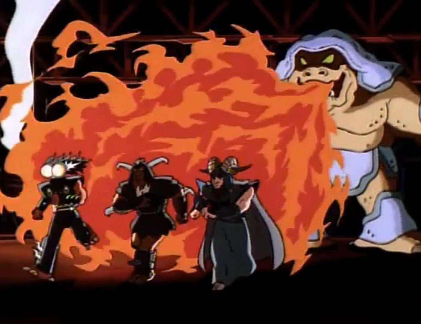 Leur course était arrêtée par Krakus, qui pensait que les reptiles travaillaient pour Titanus et leur tirait dessus. Ils prenaient la fuite. Le policier retrouvait leurs traces dans une centrale. Les installations étaient touchées par les rafales de Krakus. Une poutrelle se décrochait et s’effondrait sur les tortues, qui n’avaient d’autres choix que de se cacher dans les égouts. Les infrastructures étaient en proie aux flammes. Le policier était persuadé du succès de sa mission. Soudain, les quatre ninjas sortaient d’un souterrain pour le prendre par surprise. Leonardo sautait dans les airs et de son sabre, endommageait le jet-pack de leur adversaire.