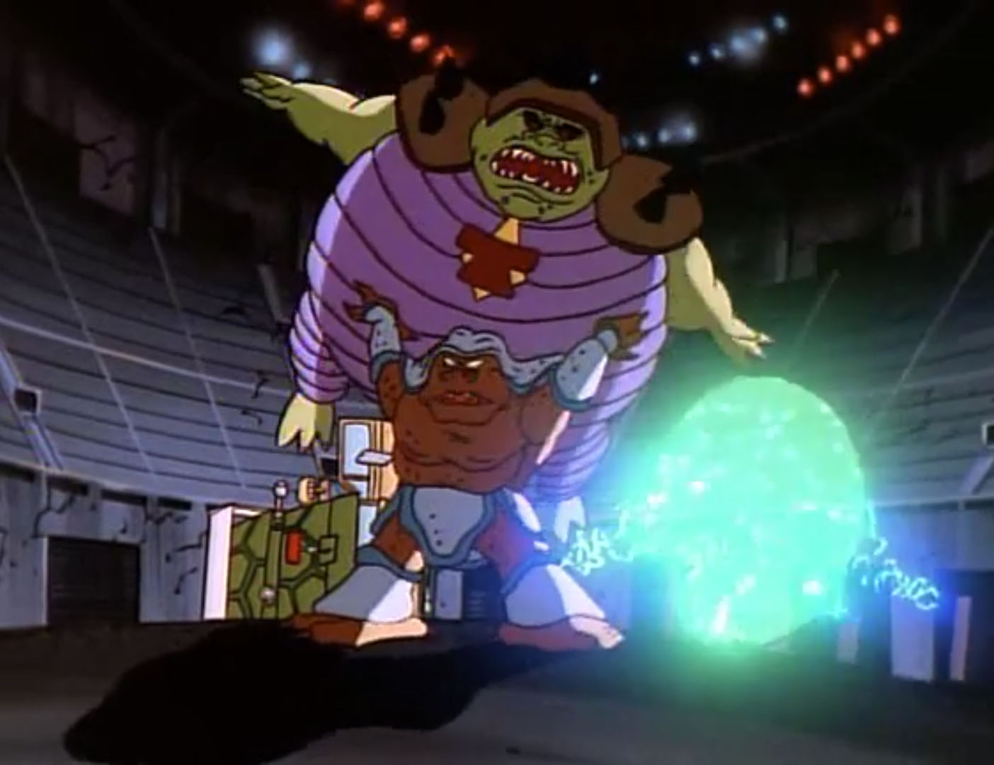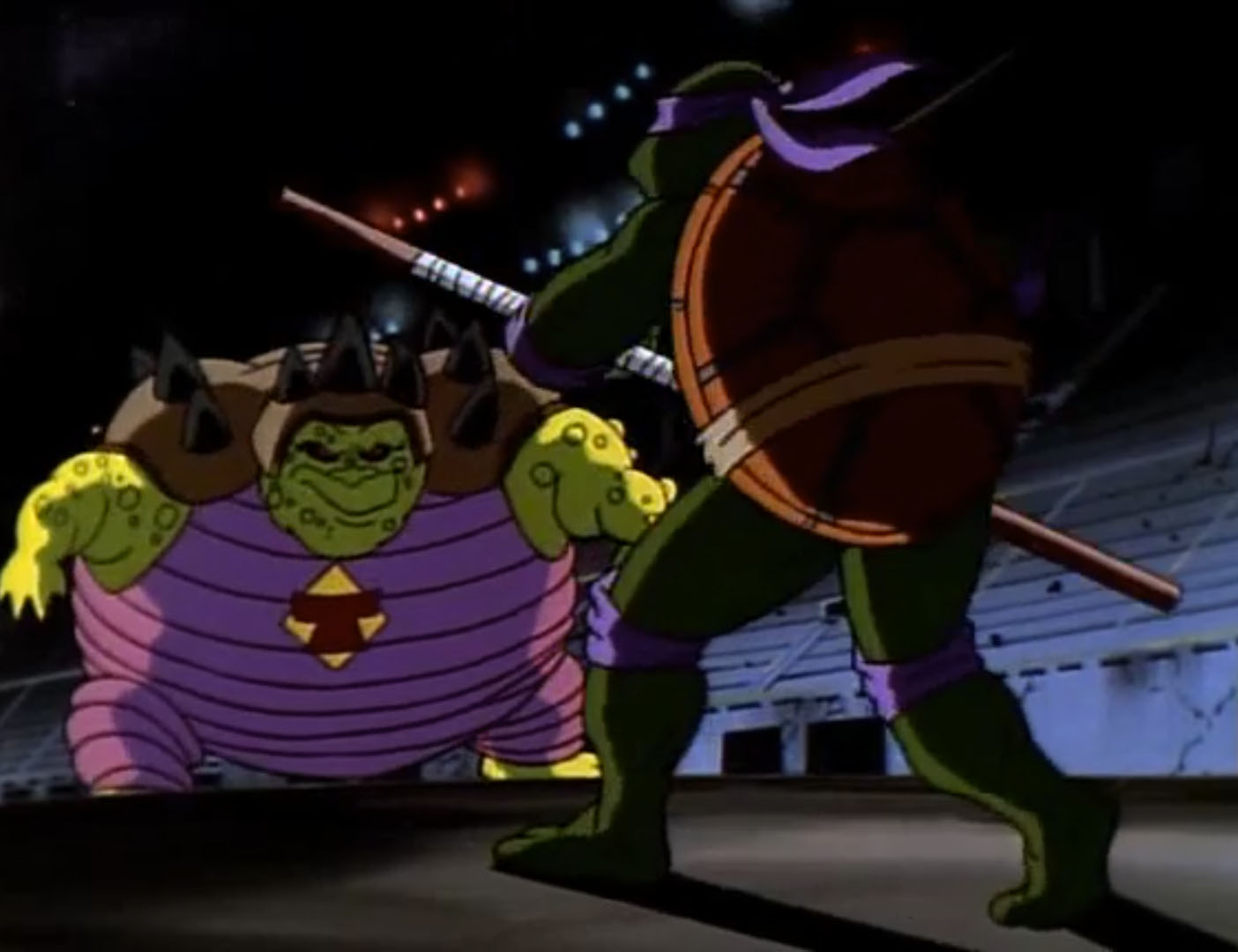 Pendant ce temps, Titanus était réfugié dans un vieux stade en ruines. Il venait d’ouvrir un portail vers son futur, pour s’entourer de son armée de mutants fidèle. Les tortues arrivaient au même moment. Mais trop tard. Raphael et Leonardo essayaient de retenir les nouveaux venus à proximité du portail tandis que les deux autres frères s’occupaient de Titanus. Ce dernier les repoussait sans mal. Les mutants du colosse étaient bien trop puissants et de dimensions impressionnantes. Ils retournaient même le Turtle van ! Heureusement, Krakus arrivait. Il était de taille à se mesurer à l’armée de Titanus et les faisait reculer vers le portail à l’aide de son souffle de feu. Donatello profitait de cette distraction pour débrancher le transformateur de flux. Krakus saisissait Titanus pour l’envoyer à travers le portail avant qu’il ne se referme. Mais soudain, le mutant émettait une lueur et disparaissait sous l’impressionnante carrure de Titanus. Il avait recouvré son apparence humaine. Sans perdre de temps, Leonardo chargeait leur ennemi à l’aide d’un transpalette et le faisait traverser le portail.