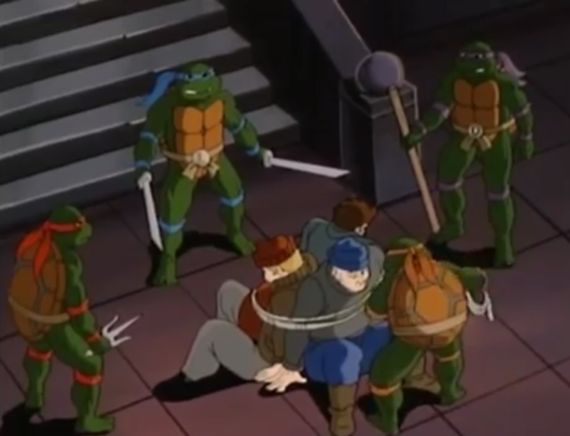 Un groupe de cambrioleurs essayait de s’attaquer à un bâtiment. Les tortues n’étaient pas loin et les maîtrisaient sans plus tarder. April avait tout filmé. Ses amis mutant espéraient que ce nouveau geste héroïque puisse jouer en leur faveur pour faire changer l’avis de Burne Thompson, les accusant toujours de la destruction de l’immeuble de Channel 6 (À la recherche de Shredder, S8 E1).