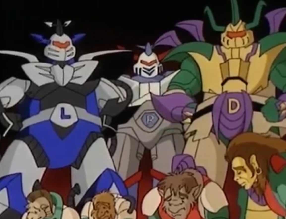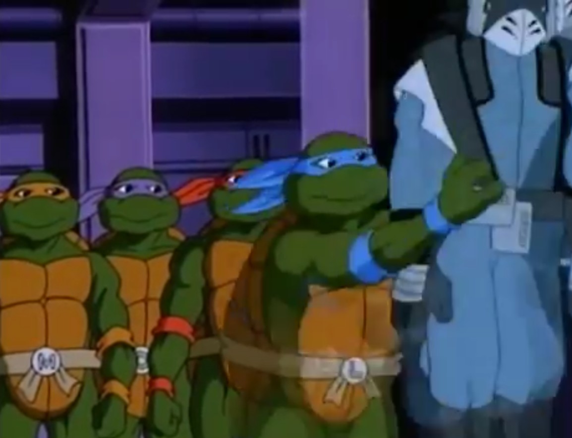 Le temps pressait. Donatello utilisait la partie réfléchissante de sa boucle de ceinture pour neutraliser les rayons des barreaux lasers de leur cellule. Les ninjas pouvaient voler au secours de la ville. S’emparant des costumes des glaxxons, les tortues allaient pouvoir leur livrer une bataille titanesque. Revêtant ces tenues, elles devenaient gigantesques à leur tour. Chaque ninja se trouvait dans un cockpit, rattaché à des câbles animant les armures démesurées.