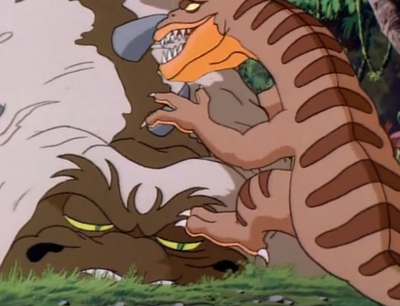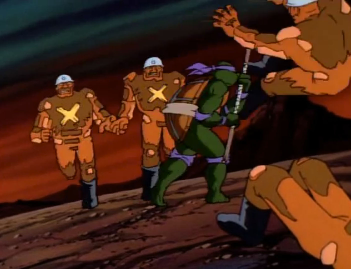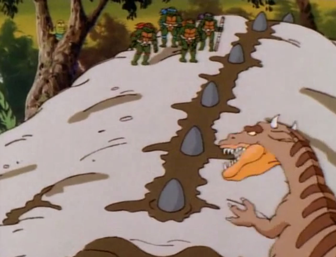 Une fois sorti de sa cage, Gargon et les tortues arrivaient en Dimension X. Ils se trouvaient sur une planète étrange et plutôt primitive de prime abord. À peine arrivés là, ils faisaient face à une créature reptilienne rappelant un dinosaure. Les tortues se cachaient au sommet d’un immense rocher. Soudain, Michaelangelo entendit quelque chose. Comme si le rocher respirait. Il s’agissait, une fois encore, d’une autre créature endormie. Les tortues sautaient sur son dos pour la réveiller. Ouvrant les yeux, elle faisait fuir l’agresseur. Les cinq compagnons pouvaient reprendre leur route. Gargon expliquait aux tortues avoir entendu Shredder et Krang vouloir se rendre sur la planète Balaraphon. Ils auraient donc besoin d’un vaisseau pour atteindre ce lieu décrit comme aride.