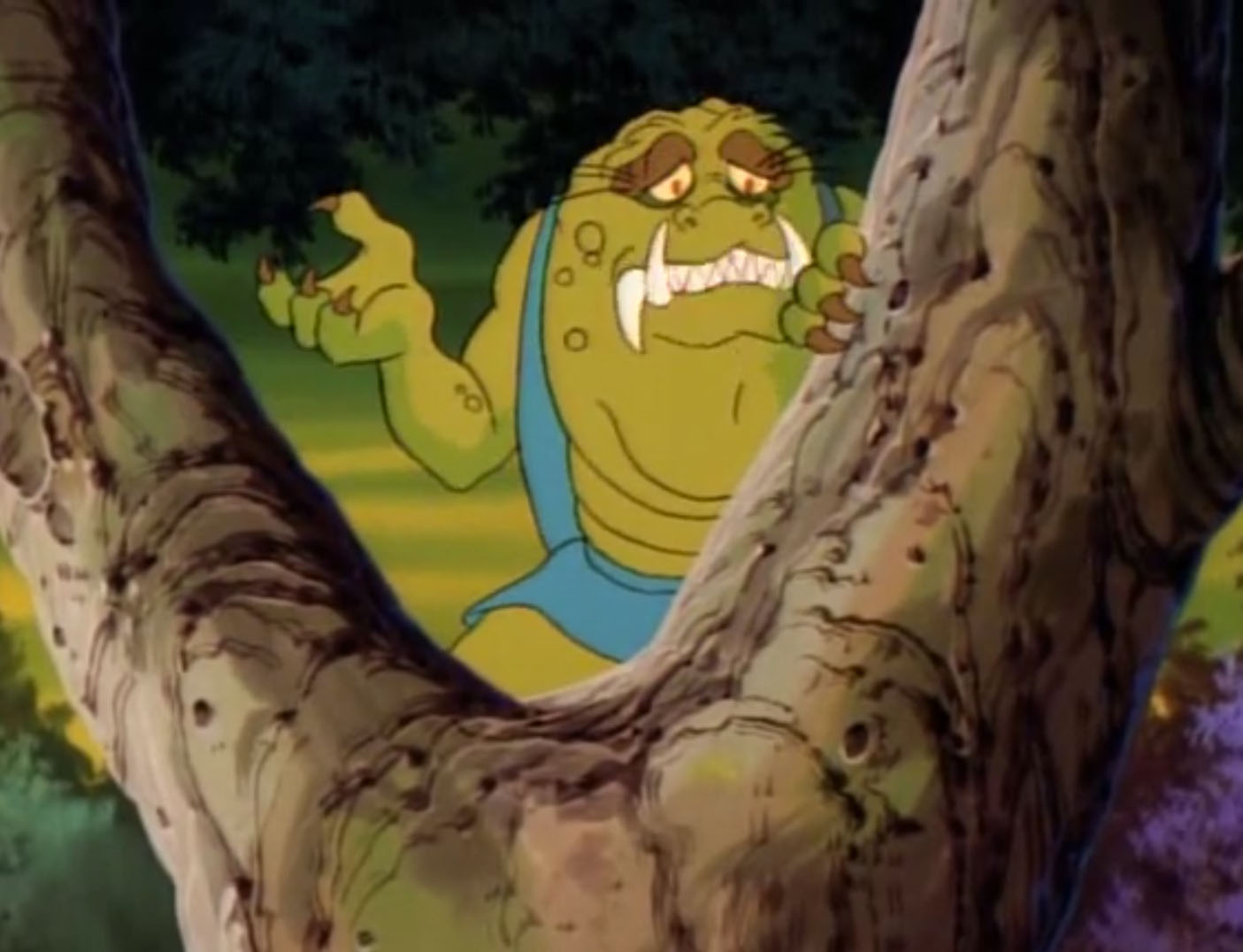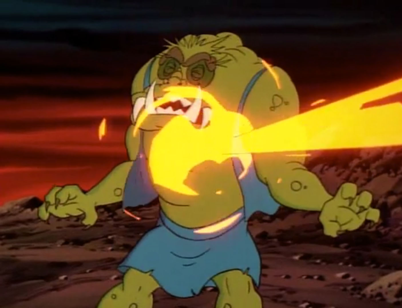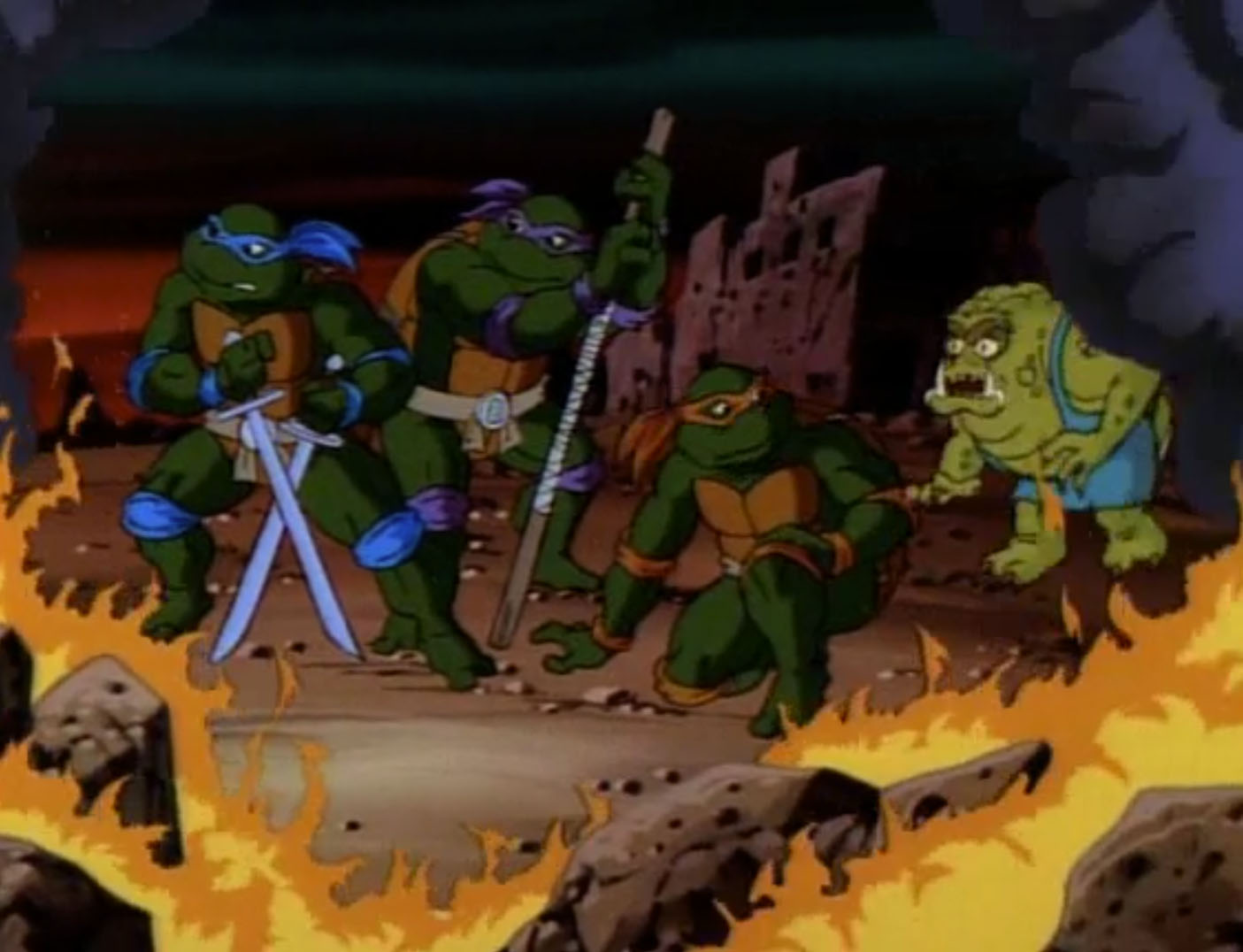Ou plutôt, un canon à retro-mutagène. Il les tenait en joue tout en félicitant Gargon. Pour le remercier de son travail, il tirait avec son arme, lui faisant recouvrer son apparence originelle. Celle de l’un des habitants du village précédemment attaqué par les soldats de pierre. Tout s’expliquait… Le laser était ensuite dirigé vers les tortues. Mais Gargon se précipitait sur l’homme au masque de fer, lui faisant dévier son tir. Les tortues avaient le temps de se dégager des tentacules à l’aide du sabre de Leonardo. Les ninjas montaient à bord de leur vaisseau et détruisaient le canon rétro-mutagène. Shredder était lancé dans une cuve d’un liquide visqueux.