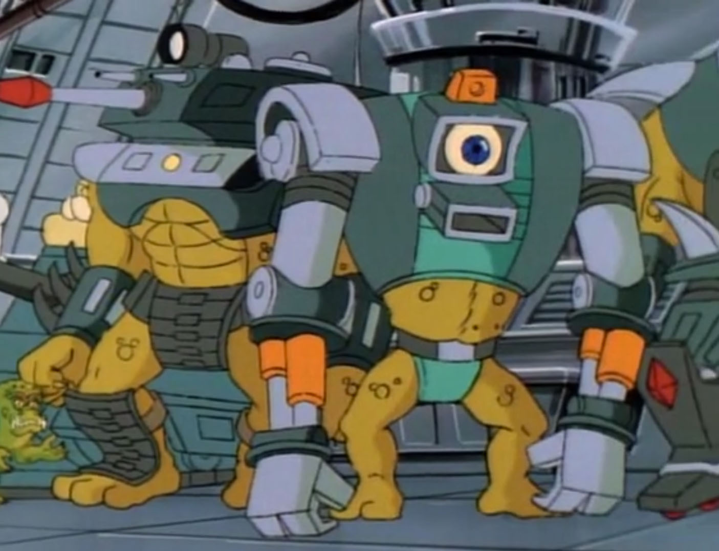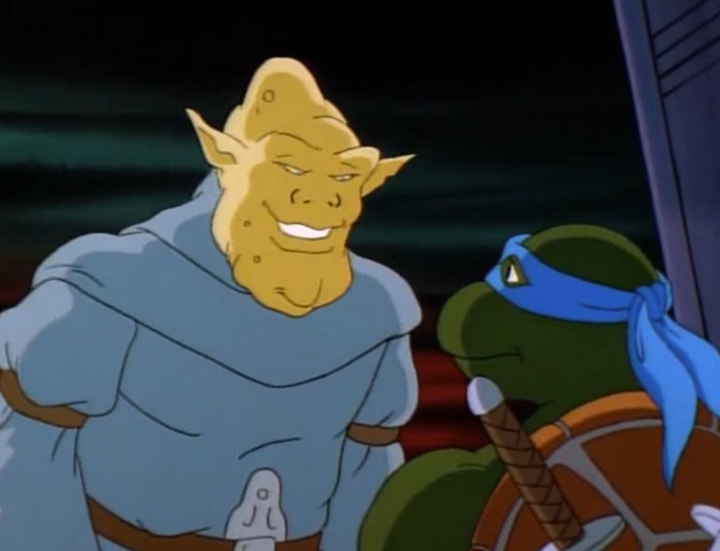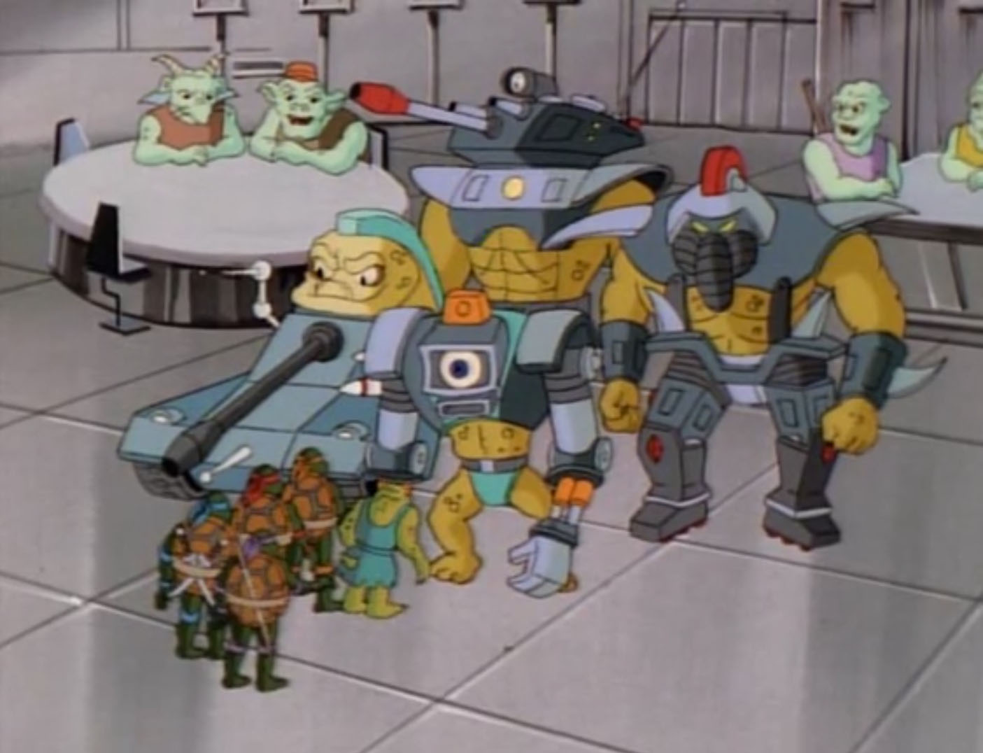 Malgré la déroute de Shredder et de ses sbires, Krang était ravi. Cette fois, les tortues n’avaient pas arrêté leurs plans. L’antenne était toujours installée dans une station relai. Ils auraient bientôt suffisamment d’énergie pour ouvrir le portail. Il s’en frottait les tentacules. En quelques instants, un halo lumineux s’emparait de l’écran. Le portail s’ouvrait. Krang et ses trois larbins traversaient l’horizon pour chercher les soldats de pierre.