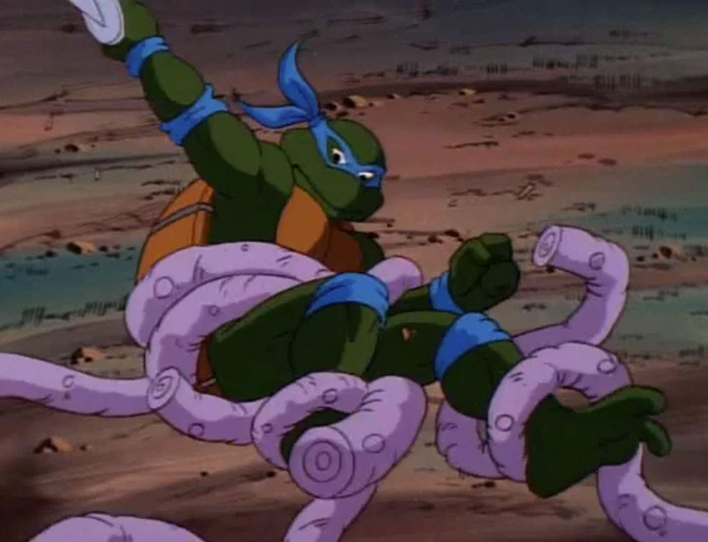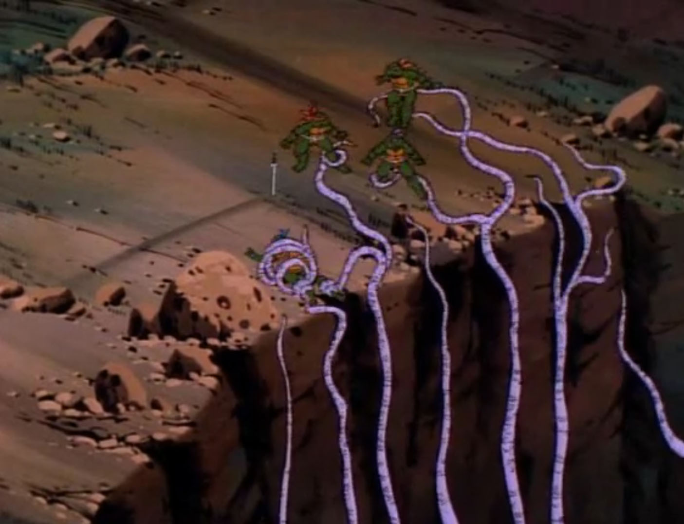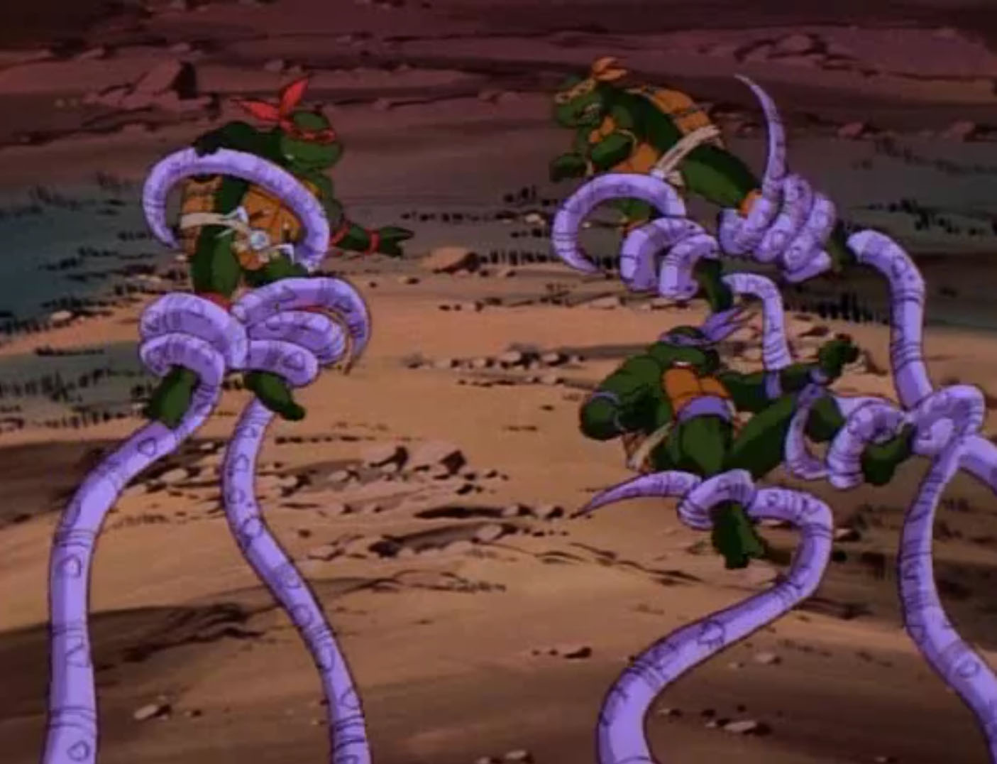 Les reptiles partaient à la recherche de Krang et de Shredder à bord de l’un des derniers vaisseaux des soldats de pierre encore en état de fonctionner. Gargon emmenait les quatre reptiles vers un étrange cratère dans le sol. Seul Michaelangelo ne se montrait pas méfiant. Leonardo en avait surtout assez d’entendre ses frères toujours en train de se disputer pour tout et n’importe quoi. Principalement savoir si leur guide était digne de confiance ou non. Raphael, lassé, dégainait ses saïs face à un Leonardo méfiant. C’est alors que les tortues se faisaient happer par quelque chose. Les longs membres violets et visqueux sortaient de la crevasse. Gargon était le seul à ne pas être entravé et refusait d’aider ses « amis ». C’était un piège. Bientôt, le sol se mettait à trembler. Le Technodrome faisait son apparition derrière une falaise. La porte principale s’ouvrait, laissant apparaître Shredder sur un immense laser.