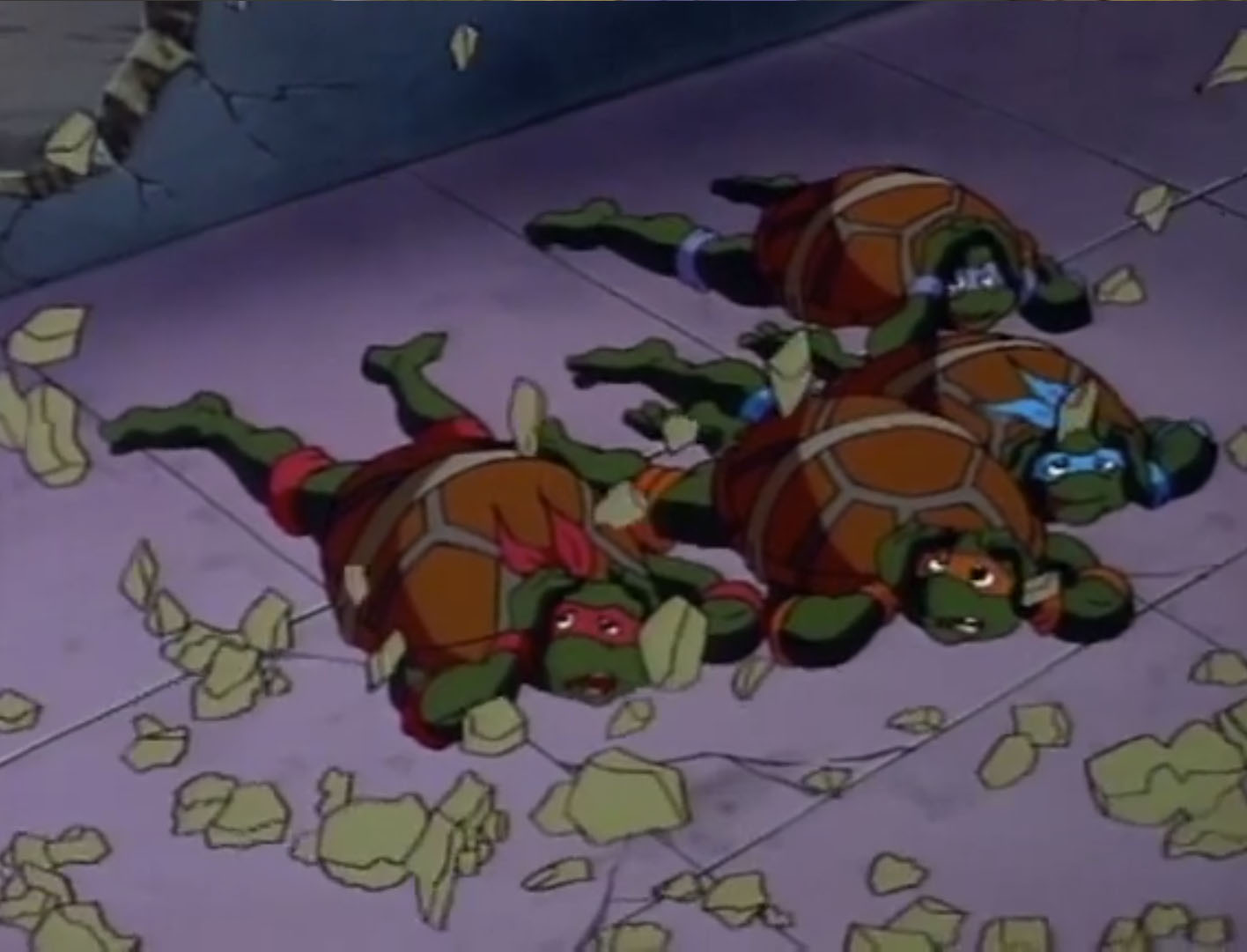 Ni une ni deux, il neutralisait le TecnoGang. Hi-Tech répondait en tirant, jusqu’à se faire raviser par son supérieur. Il risquait de tout faire exploser en manquant sa cible. Raphael renversait Dregg au sol. Le seigneur de guerre essuyait les moqueries des tortues, ce qui le rendait fou. Elles l’incitaient à leur tirer dessus. Ce qu’il faisait, aveuglé par la colère. Il tirait dans des missiles, faisant exploser la pièce. Le sol sous les pieds d’April s’affaissait. Précipitée dans le vide, la journaliste se faisait retenir de justesse par les tortues. Hélas, sa caméra n’avait pas eu la même chance. Les preuves contre Dregg s’écrasaient plusieurs mètres plus bas. Les six compagnons parvenaient à s’enfuir de la tour avant qu’elle n’explose totalement. Au-dessus de leur tête, le Dreggnaught prenait lui aussi la fuite.