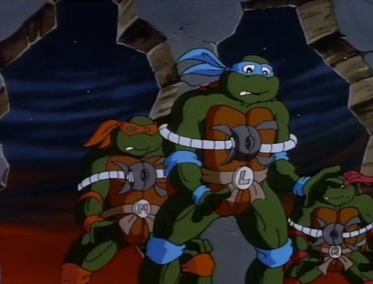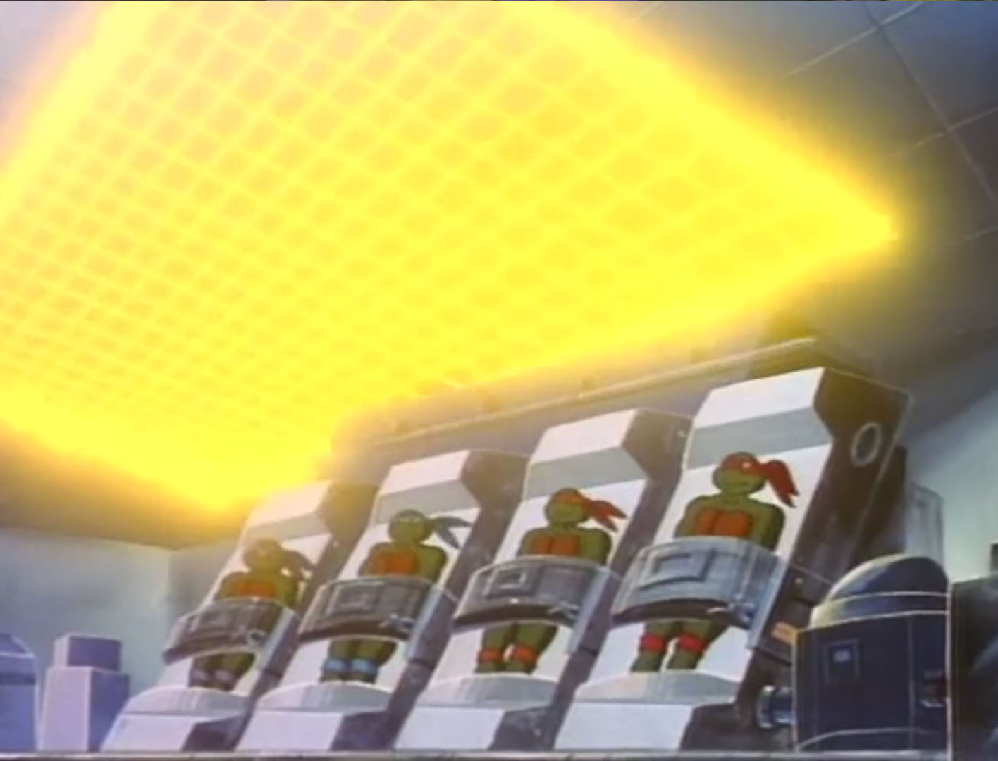 Les tortues étaient amenées dans une pièce où elles étaient retenues par des sangles de métal. Dregg fustigeait sa victoire. Mais ne pouvait s’empêcher de leur proposer de se joindre à sa cause. Elles étaient bien meilleures que ses soldats, plus fortes et douées. Les avoir à ses côtés s’avèrerait être un véritable avantage pour ses desseins. À son grand regret, l’extraterrestre essuyait un cuisant refus. Il quittait la pièce, activant une grille d’énergie. Les tortues risquaient une fois encore de se faire trancher en rondelles. Leonardo essayant d’atteindre le levier qui leur permettrait de se libérer. Soudain, la main de la tortue se transformait, des griffes poussaient, sa musculature devenait plus imposante. Il en était de même pour Raphael. Leur mutation était de plus en plus instable ! Et d’aucune aide, leur apparence revenait à la normale. Au même instant, Carter entrait dans la pièce pour délivrer les captifs. Ils sortaient de là à temps.