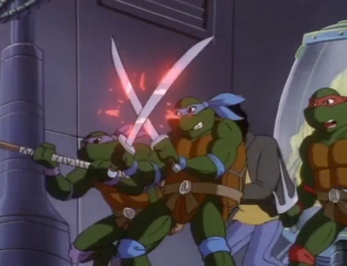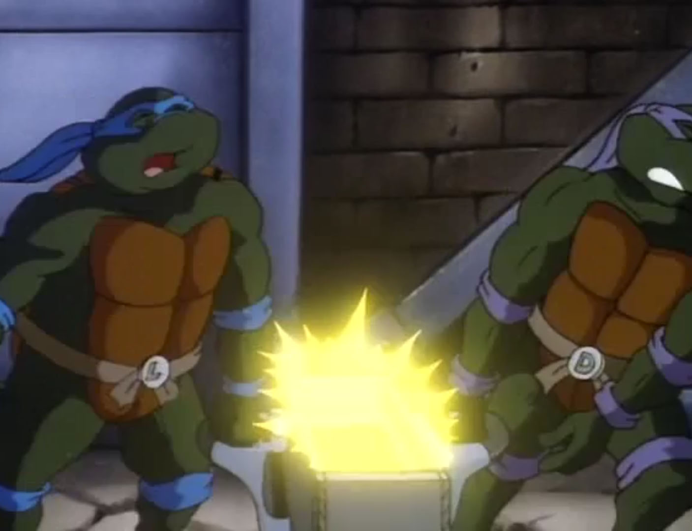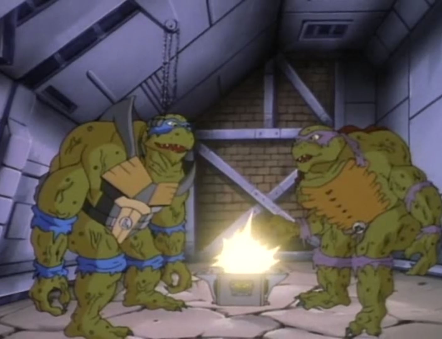 Leonardo et Donatello poursuivaient l’exploration du lieu et découvraient Hi-Tech, avec un petit contingent, prêts à enclencher les canons à l’aide du X-Fire. Le génie de l’équipe craignait le pire. Ils devaient trouver où était entreposé le carburant pour le faire exploser et ainsi empêcher les desseins de Dregg. Après quelques minutes de recherche, ils mettaient la main sur un caisson, qu’ils transportaient délicatement. Un simple choc pourrait tout faire