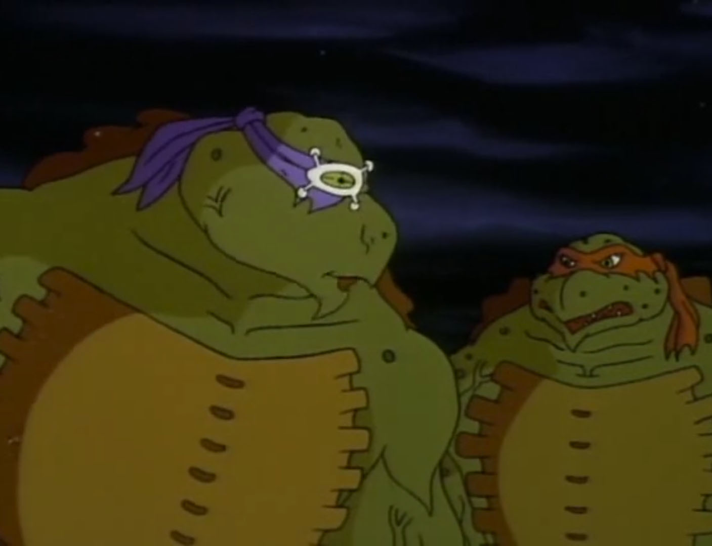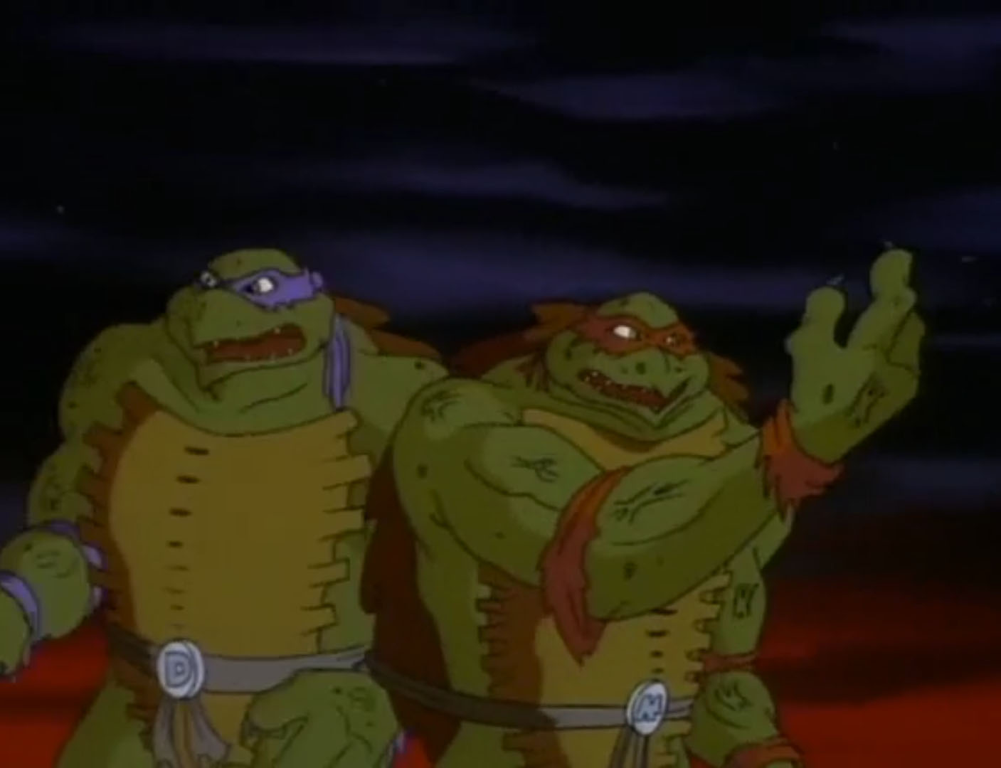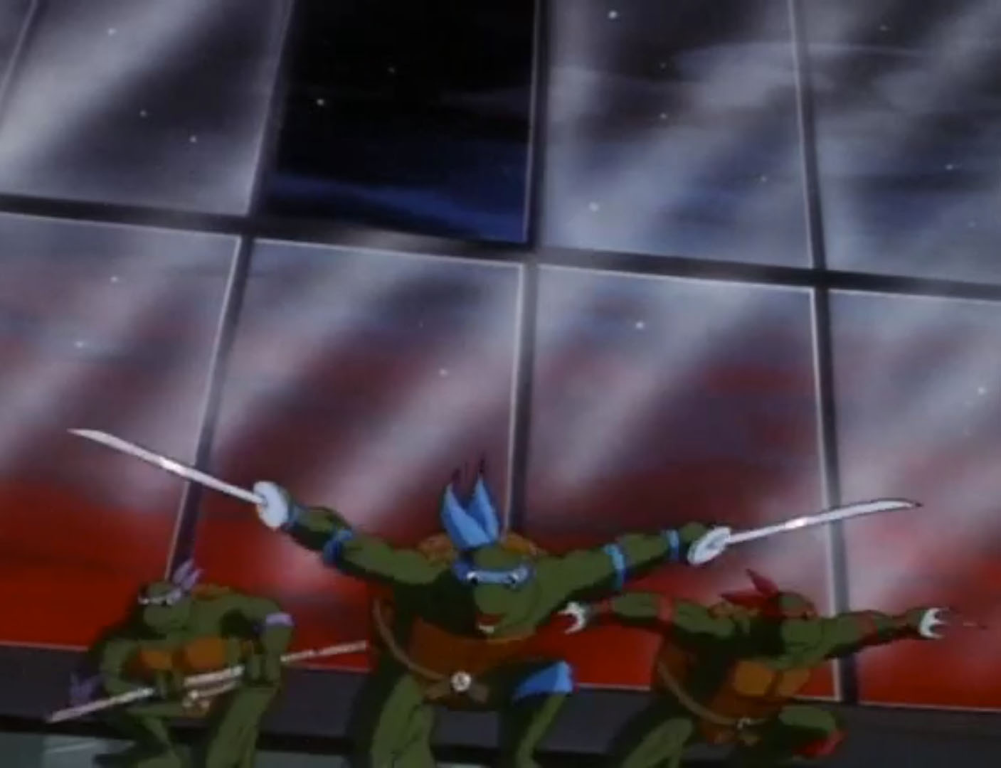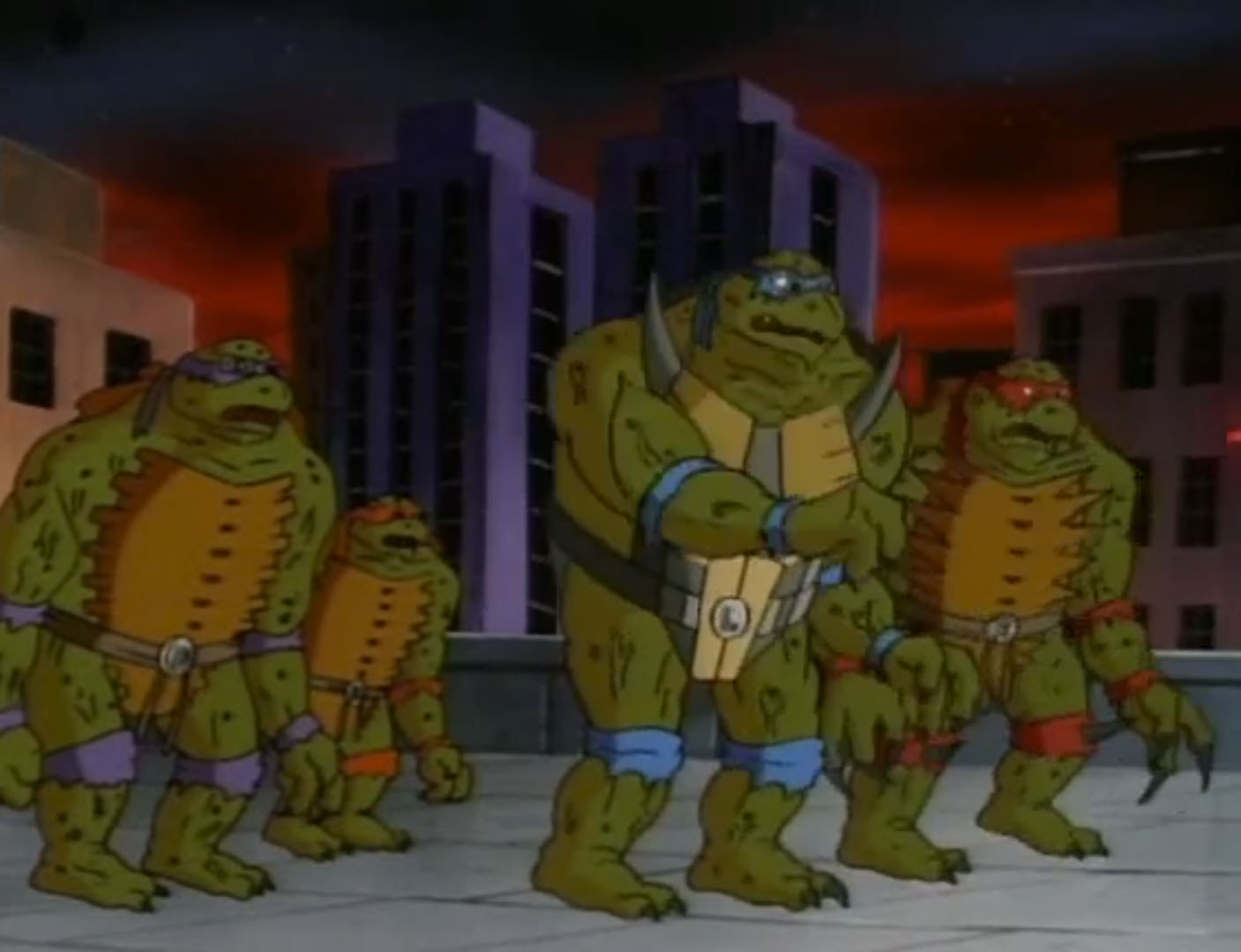 Les tortues partaient sur les toits retrouver leurs ennemis, qui les acculaient sur le bord. À deux doigts de tomber, les ninjas se transformaient pour la seconde fois en créatures colossales. La presse filmait leur mutation et s’arrêtait à leur apparence hideuse. Les tirs des extraterrestres étaient inoffensifs sur les quatre frères devenus quasiment indestructibles. Mais aussi très lourds et maladroits. Leonardo trébuchait, entraînant les tortues au sol. D’autres salves de tirs les contraignaient à battre en retraite. Ils s’enfuyaient par les égouts pour ressortir dans un parc, à l’abri de tous les regards.