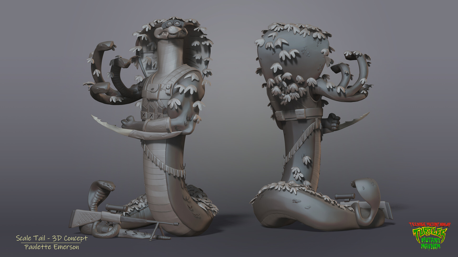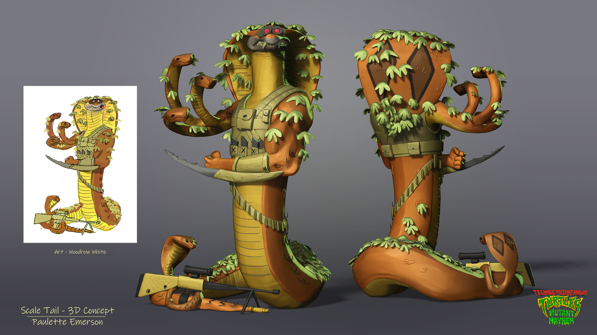 - Initialement, Scale Tail avait été pensé pour intégrer le film d’animation Teenage years. Il aurait été l’un des projets de super-mutants de Cynthia Utrom. La femme planifiait d’utiliser des serpents pour prendre leurs ennemis de revers. Ne parvenant pas à mettre au point des mutants, ces serpents n’ont pas dépassés le stade de projet.