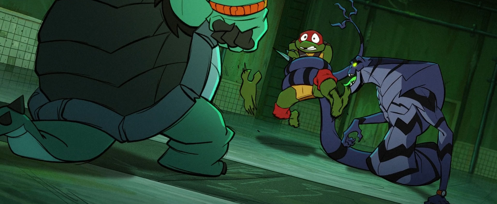 Scale Tail était un mutant de type serpent créé par Jordan Perry dans ses laboratoires. Grand admirateur du travail sur les mutants de Baxter Stockman, il voulut poursuivre ces recherches, vexé de ne pas avoir été crédité par son idole. Hélas pour lui, ses créations étaient instables et explosaient au bout de quelques heures. Il possédait ainsi de nombreux serpents, qu’il appelait Scale Tail. Lorsque l’un disparaissait, l’autre le remplaçait. À côté de la chambre de stase des mutants, se trouvait une petite pièce qui diffusait un message vidéo pré-enregistré par Rahzar. Cela permettait de donner toutes les informations essentielles aux mutants nouvellement libérés.