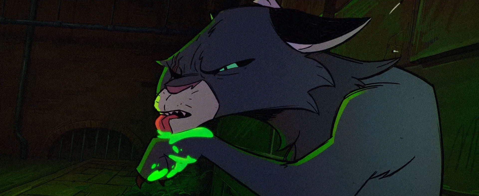 Il s’était attaqué à Splinter dans une allée avant de le retrouver dans les égouts. Là, il prit le rat contre une grille. Pour se défendre, ce dernier lui asséna un coup de griffes, le privant de son œil droit. Furieux, il n’abandonna pas et retrouva son ennemi plus tard en train de sortir les quatre tortues du mutagène. Les voyant se transformer, il prit peur et se cacha. Mais ses pattes avaient déjà été en contact avec la substance et se transforma à son tour (Le retour du ninja de la nuit, S2 E8).