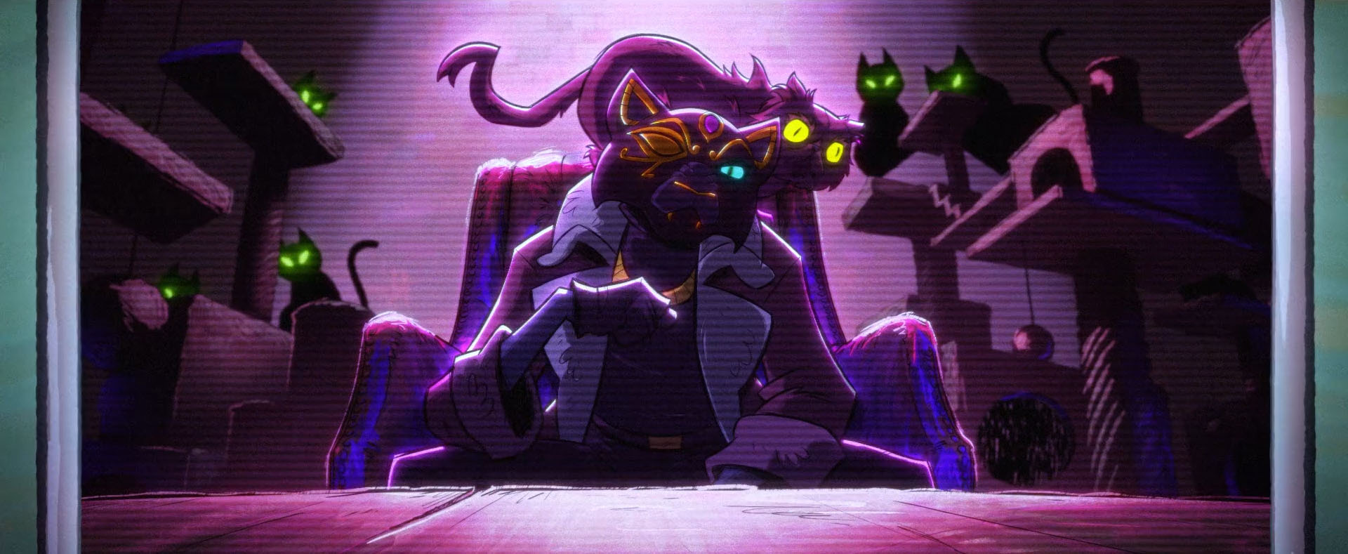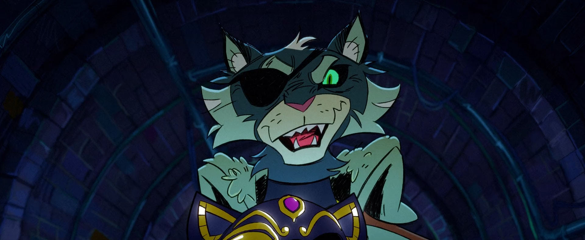 Quatorze années plus tard, le chat se lança dans une politique de terreur de la ville. Il s’allia à La Fleur, une trafiquante d’armes pour mener son plan à bien. Il enleva des chiens et utilisa des phéromones pour les rendre fous, afin qu’ils attaquent leurs maîtres. Les tortues, entendant ça, revêtirent leurs costumes de Ninjas de la nuit pour arrêter ces crimes. Ils se rendirent vite compte qu’il n’avait rien contre les chiens mais qu’il désirait s’attaquer directement à Splinter… (Le retour du ninja de la nuit, S2 E8). De retour au repaire, elles trouvèrent le chat en train de capturer Scumbug comme rançon. Le chat leur donnait rendez-vous au sommet de la plus haute tour de la ville pour le combat ultime.