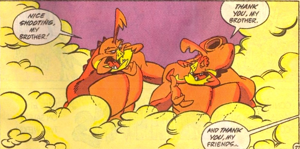 Les tortues capturées, les deux frères partirent avec Null pour le vaisseau de Maligna (Mighty Mutanimals Mini-series, part. 1). Hélas pour eux, ils n’étaient pas capable d’arrêter la révolte entamée par Kid Terra, qui avait libéré Raphael et Gecko, conduisant à la capture de la reine.