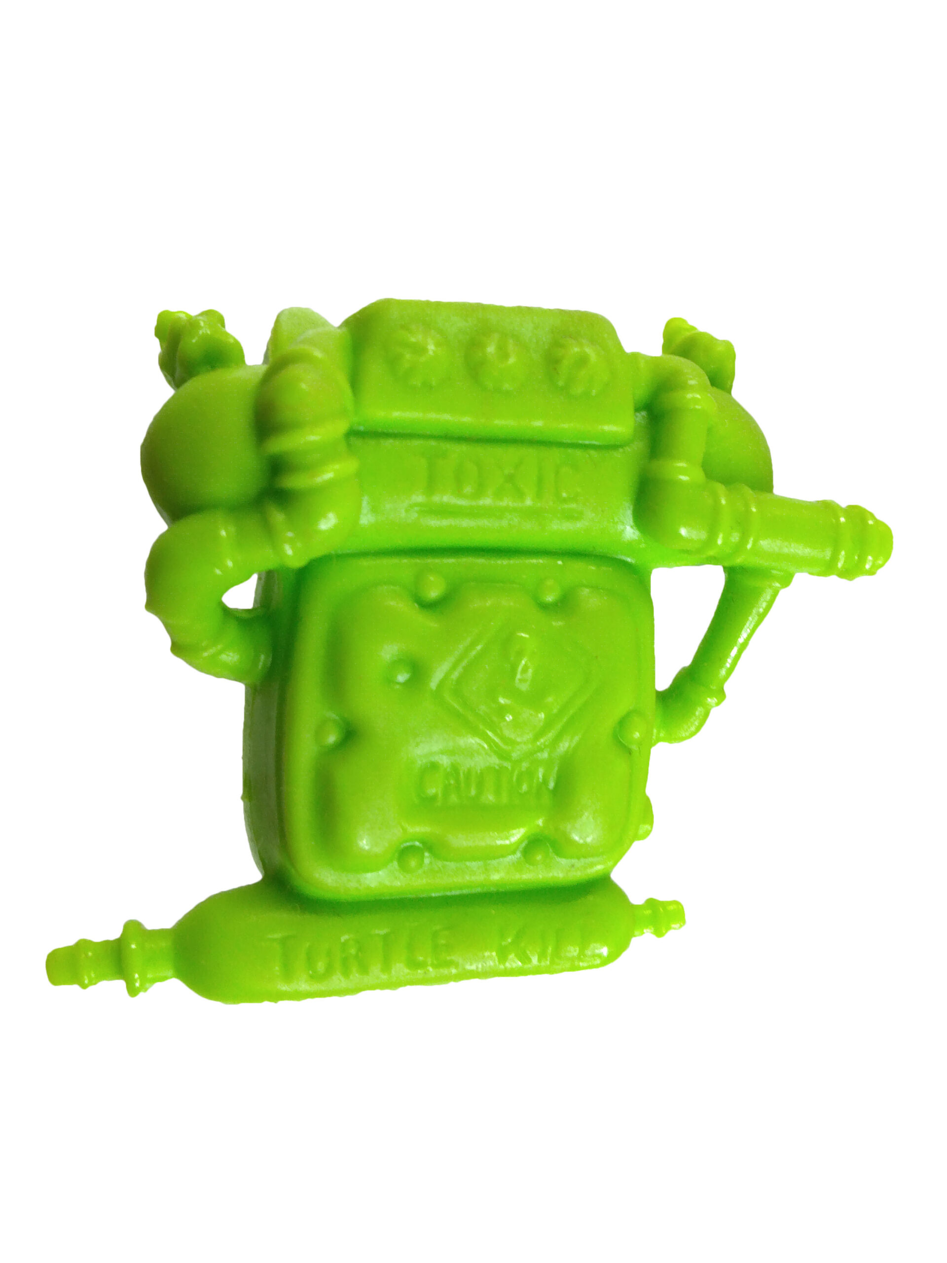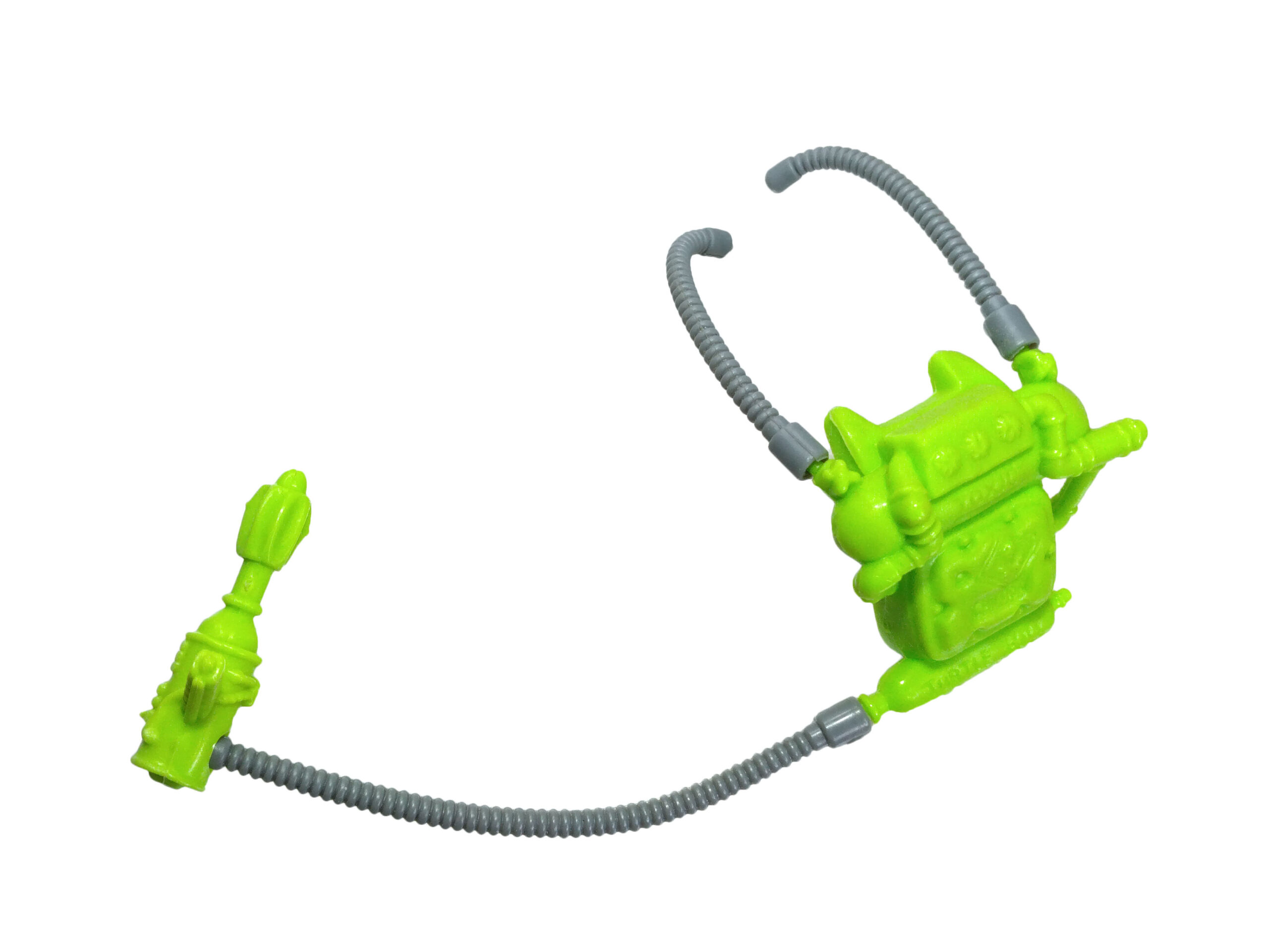 Le pack dorsal est superbe. S’il est laissé vert, comme son pistolet, sa sculpture mélange des éléments rigides, de métal, avec des tuyaux. Des éléments écrits, comme « Toxic », « Caution » et « Turtle kill ». Les quatre frères n’ont qu’à bien se tenir ! Nous retrouvons quatre pegs permettant de relier le pack à la figurine à travers les tuyaux. Les deux plus courts sont à fixer en partie supérieure du pack, sur la poitrine de Scumbug. Le plus long est à rattacher au pistolet sur le bas du pack. Vous avez le choix, soit à gauche (peg le plus long) soit à droite, en fonction de la main dans laquelle vous voulez placer l’arme. La manière conventionnelle est sur la main gauche. Mais j’ai une préférence pour la main humaine, à droite, pour laisser la pince insectoïde mieux visible.