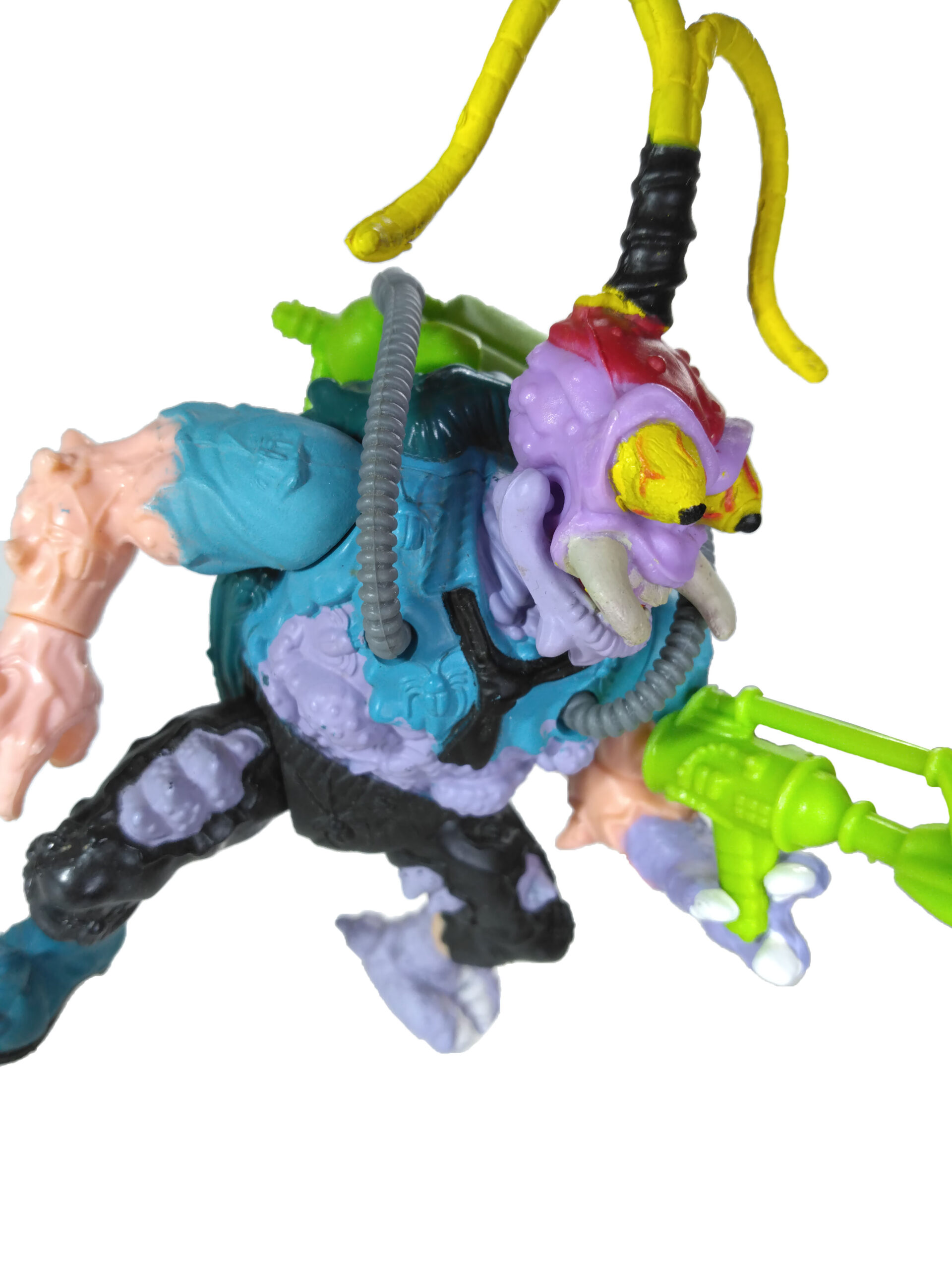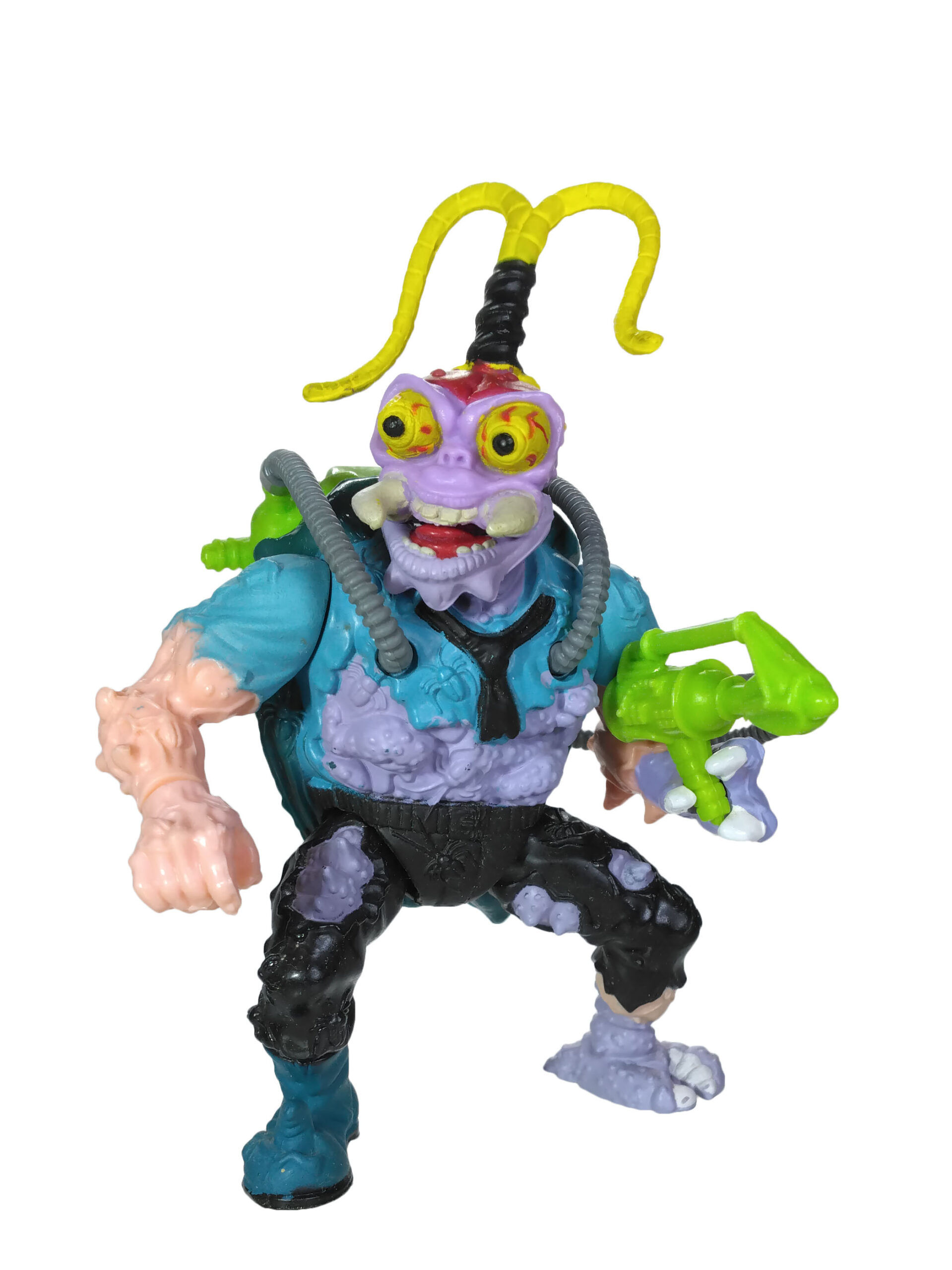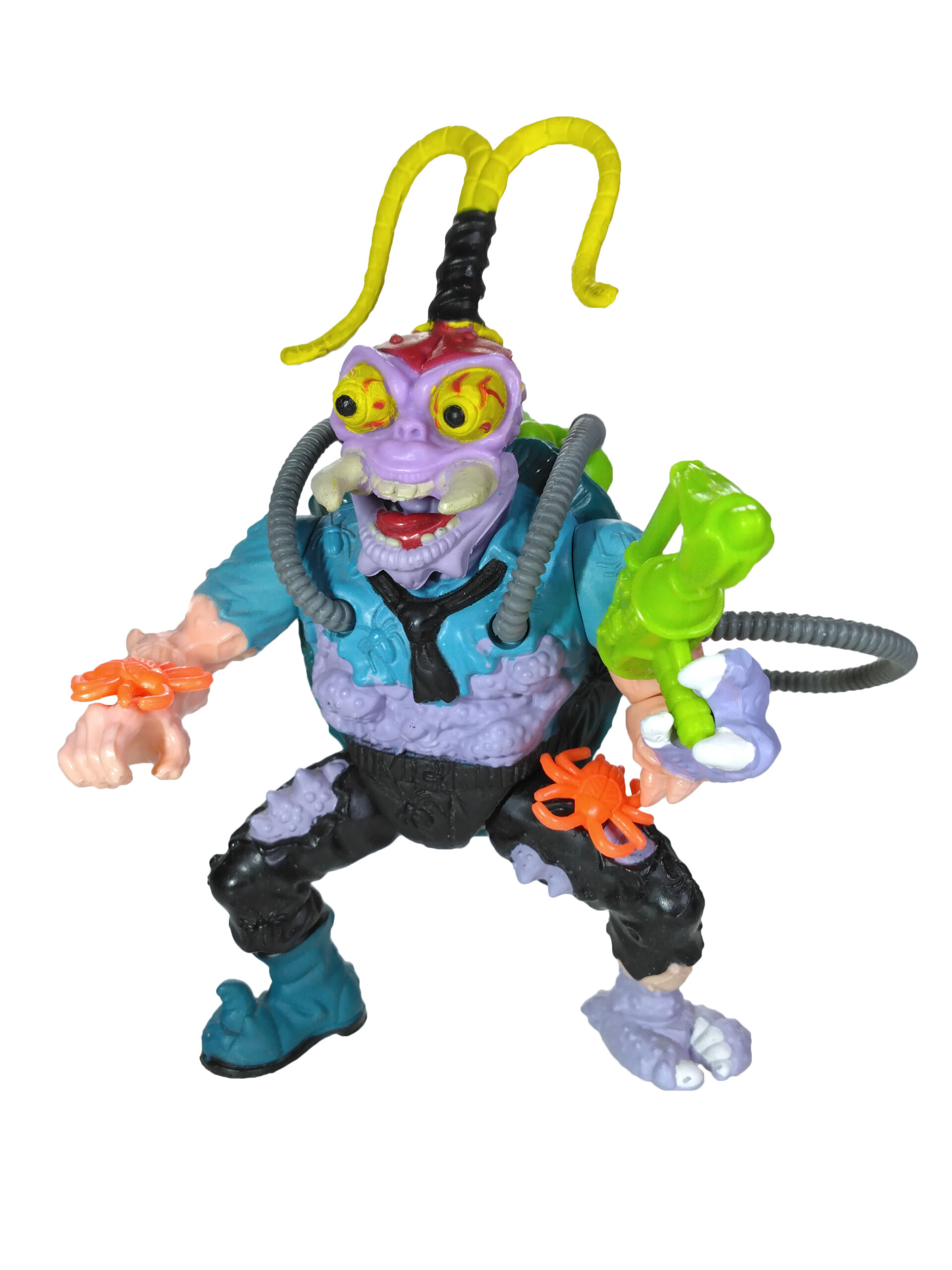 Sent to eliminate the bug problem in the Technodrome, a mild-mannered exterminator got accidentally oozed and mutated into the scampering, sickening Scumbug. Unable to face other customers, Scumbug saddled up with Shredder as his ace assassin.