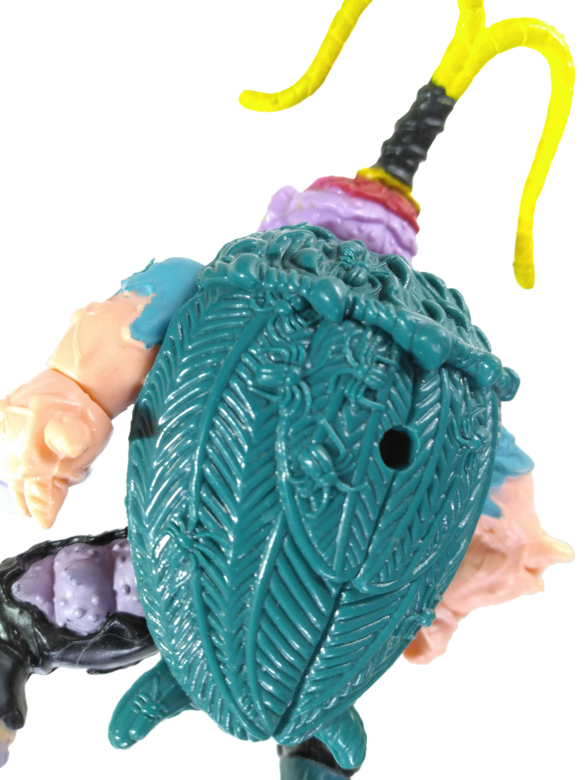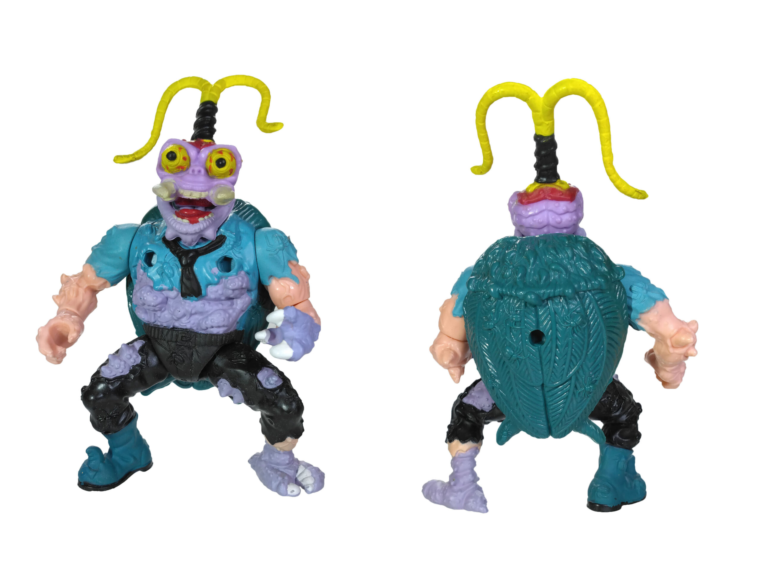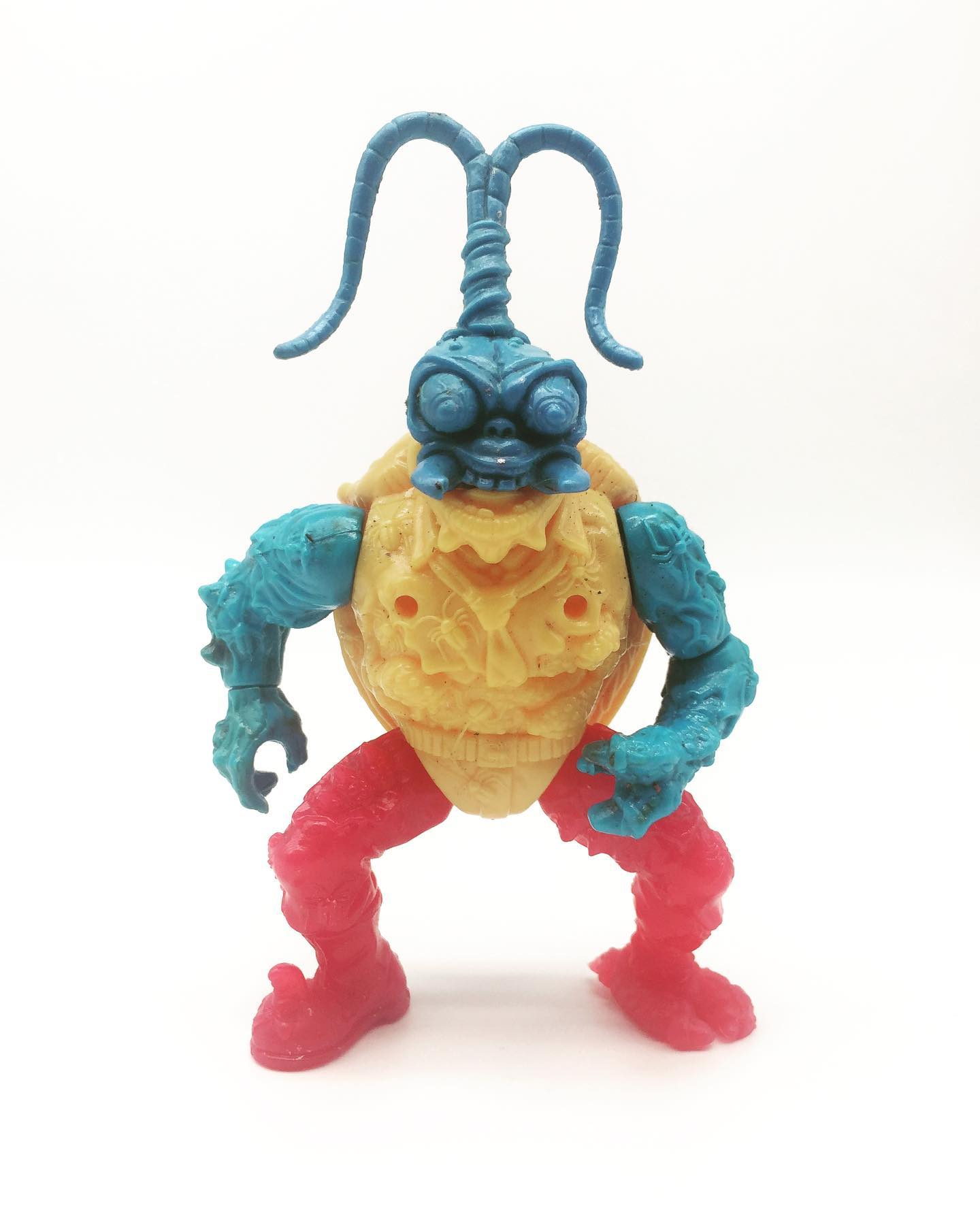 Pour le reste, Scumbug demeure une figurine géniale et symbolique de son époque. Le personnage n’est pas bien grand, mais très détaillé. Il possède ce style loufoque propre aux Tortues Ninja de la fin des années 80′, avec ces cafards qui parsèment son corps. Ces accessoires qui renvoient aussi bien à son histoire qu’à sa personnalité létale. L’ajout de l’articulation de la mandibule est excellente. Enfin, son visage est effrayant, avec ces yeux exorbités, ce visage d’insecte fou, ces antennes nouées…