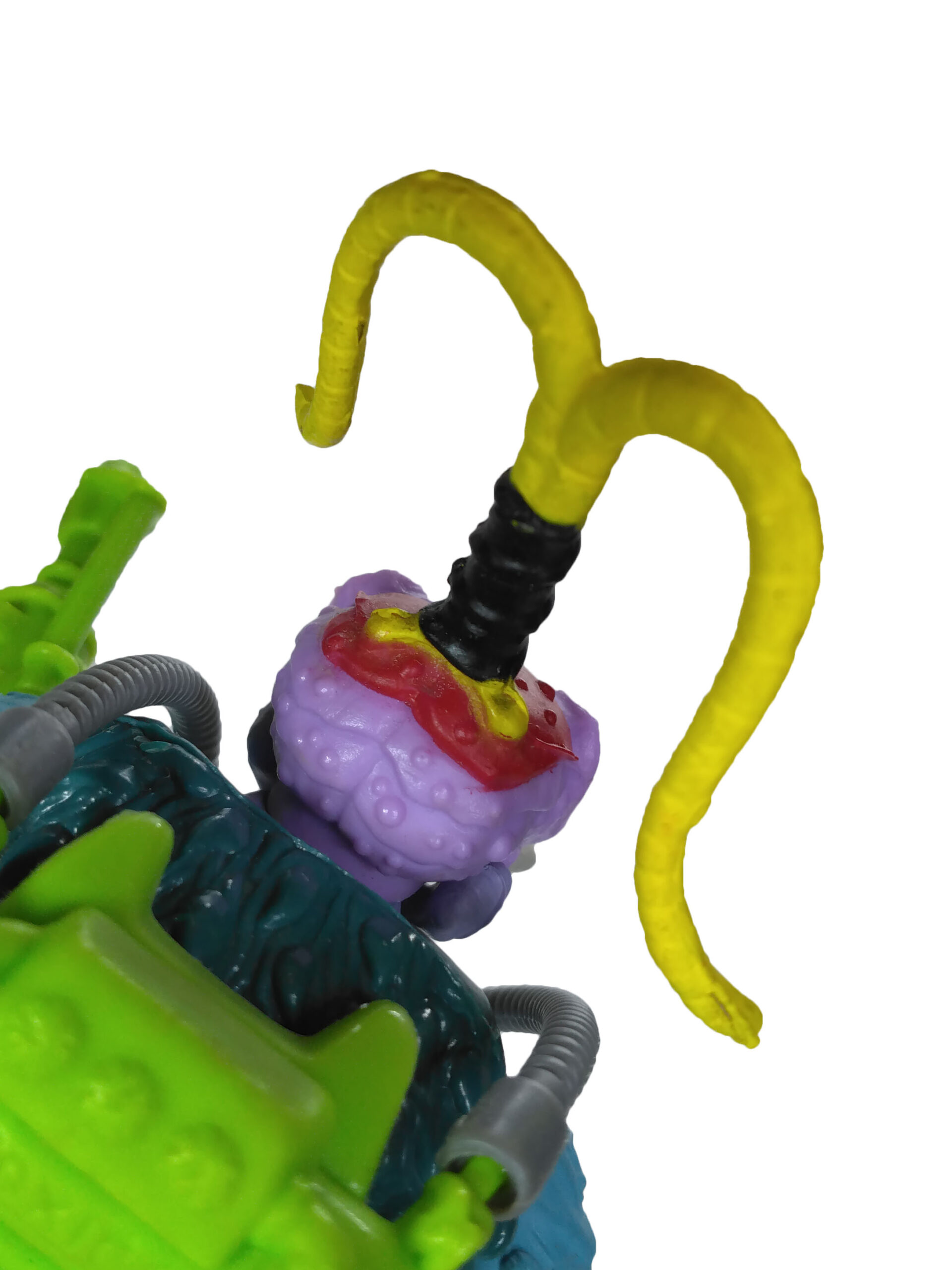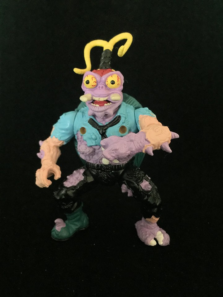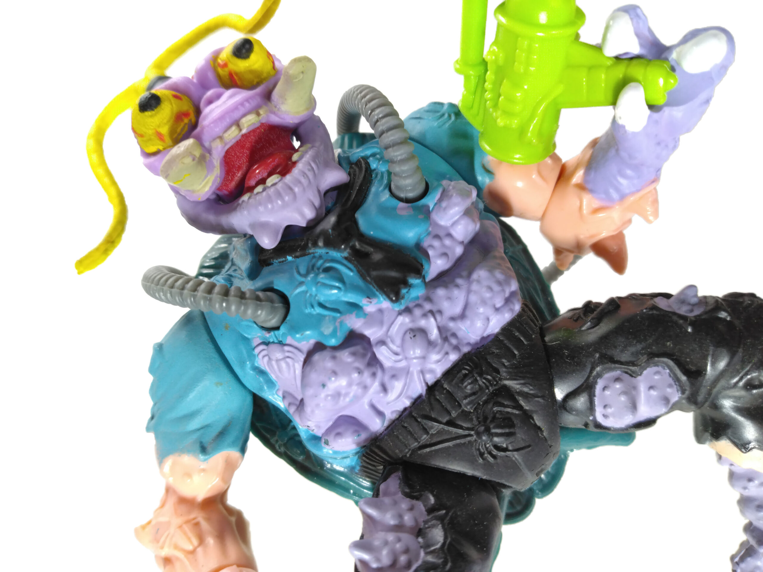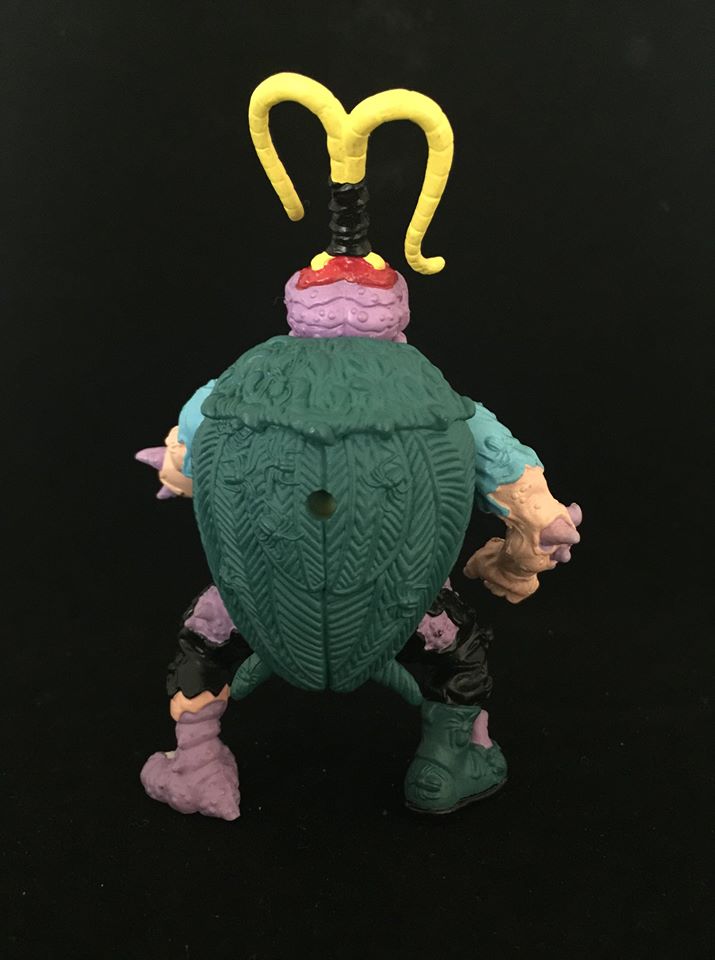 Pour le reste, Scumbug demeure une figurine géniale et symbolique de son époque. Le personnage n’est pas bien grand, mais très détaillé. Il possède ce style loufoque propre aux Tortues Ninja de la fin des années 80′, avec ces cafards qui parsèment son corps. Ces accessoires qui renvoient aussi bien à son histoire qu’à sa personnalité létale. L’ajout de l’articulation de la mandibule est excellente. Enfin, son visage est effrayant, avec ces yeux exorbités, ce visage d’insecte fou, ces antennes nouées…