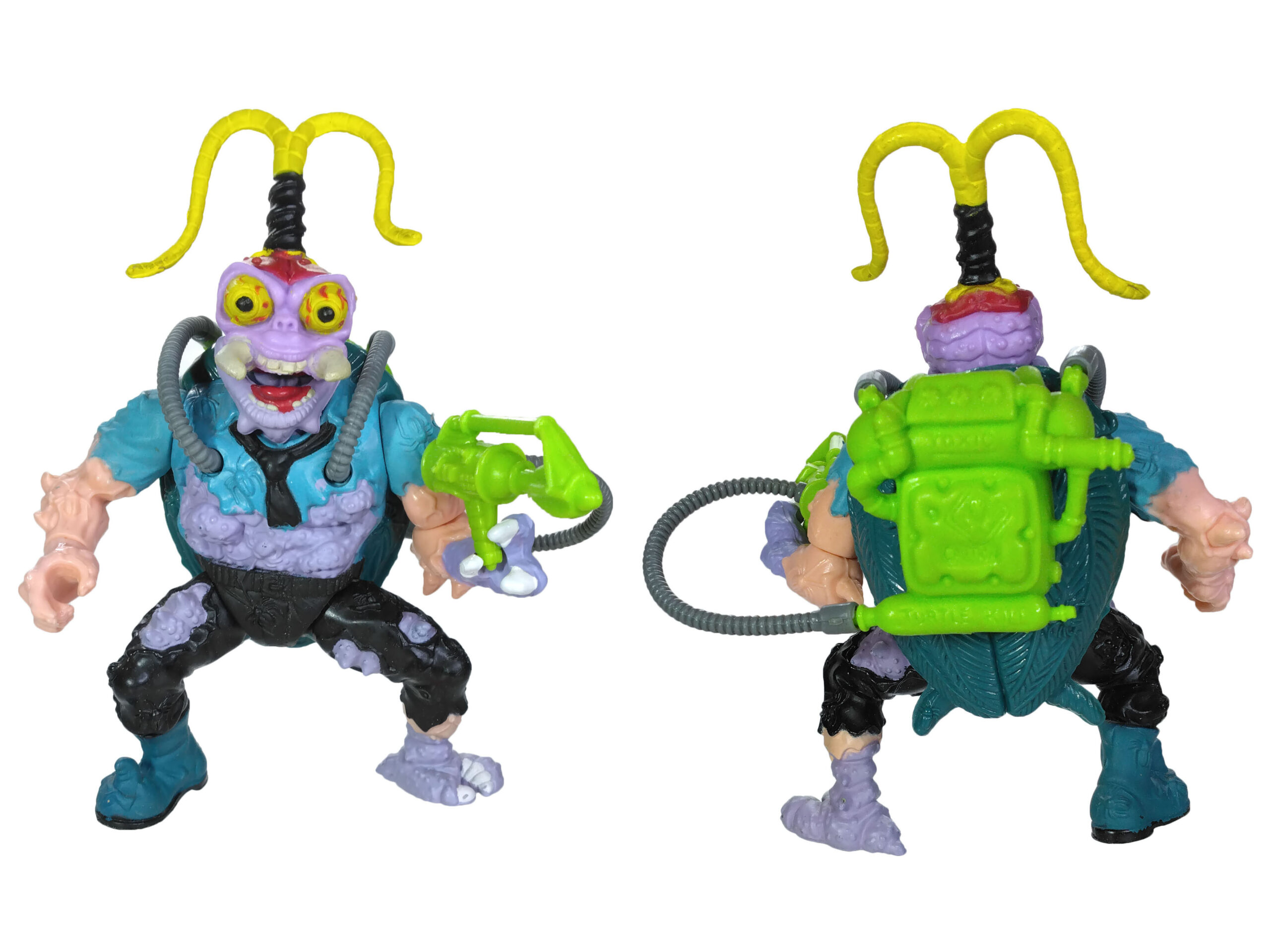 Armed with his poisonous pinchers and a tank full of Anti-Turtle Spray, this rude roach chews his way through almost anything. His power claw and bullet-proof shell make him a tough Turtlebustin’ bug. And when the going gets rough, this roach gets other bugs to rally ’round him. Using his super-sensitive antennae as a telepathic link to insidious insects, Scumbug’s the Pied Piper of the creepy and the crawly. You’ll know when you’re near his army – just listen for the crunch.