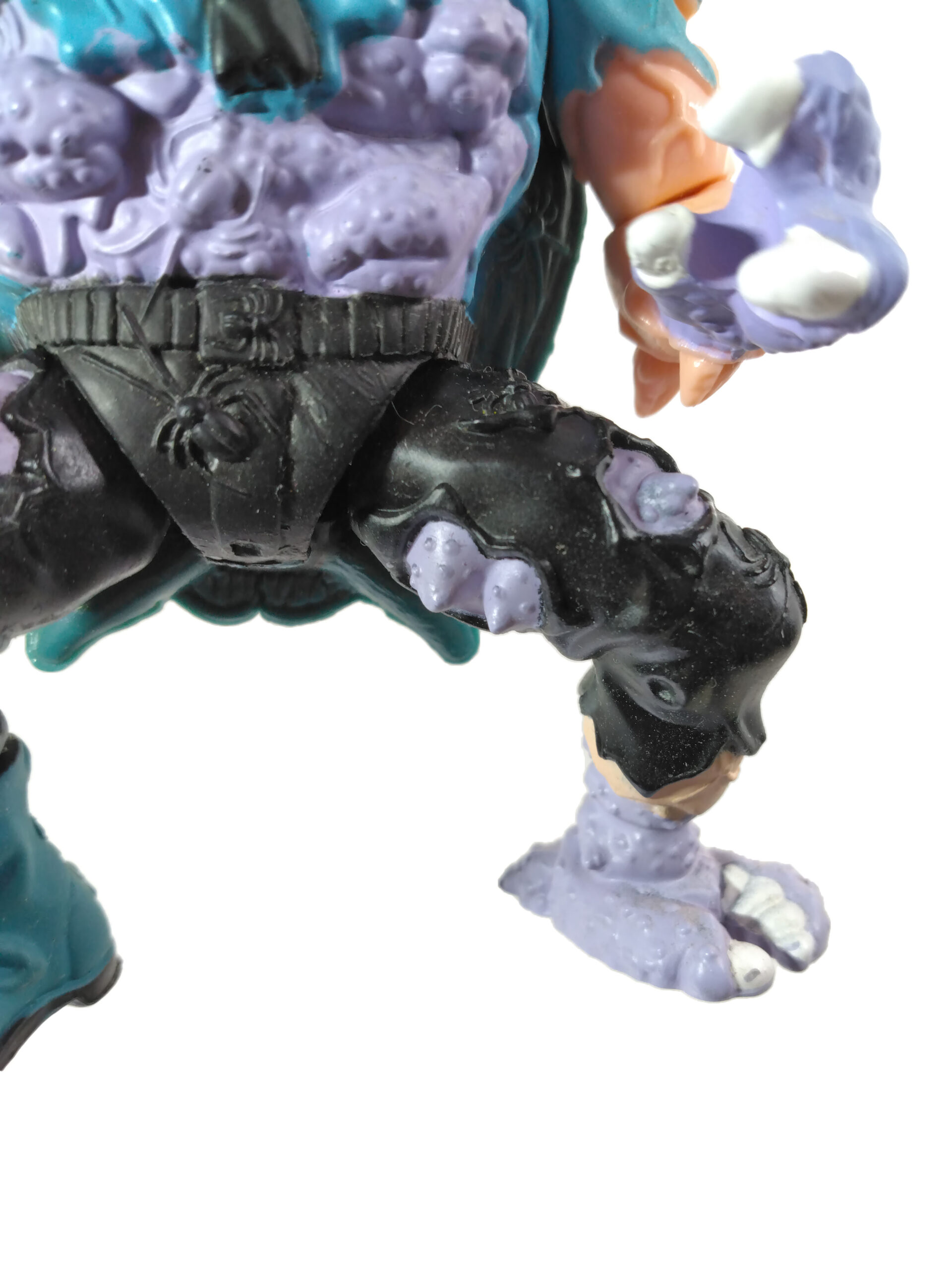 Dans le détail, les nombreuses teintes sont bien présentes. Sur le buste, la peau lilas de Scumbug se pose sur le plastique de base. Viennent ensuite les couleurs noires pour le pantalon et le bleu de son vêtement, comme le montrent les bavures. Malheureusement, ces quelques nuances sont loin de rendre honneur à la sculpture de Mosqueda. Si l’ensemble des éléments sont représentés, les détails passent aux oubliettes. Il s’agit notamment des cafards qui parsèment le corps de l’exterminateur. Et c’est assez dommage, car ils passent totalement aux oubliettes. Sur un personnage comme Muckman, ces détails ne sont pas peints, mais on prend plaisir à les chercher au travers de sa sculpture car le personnage est imposant. Scumbug est plutôt gringalet et les motifs sont répétitifs.