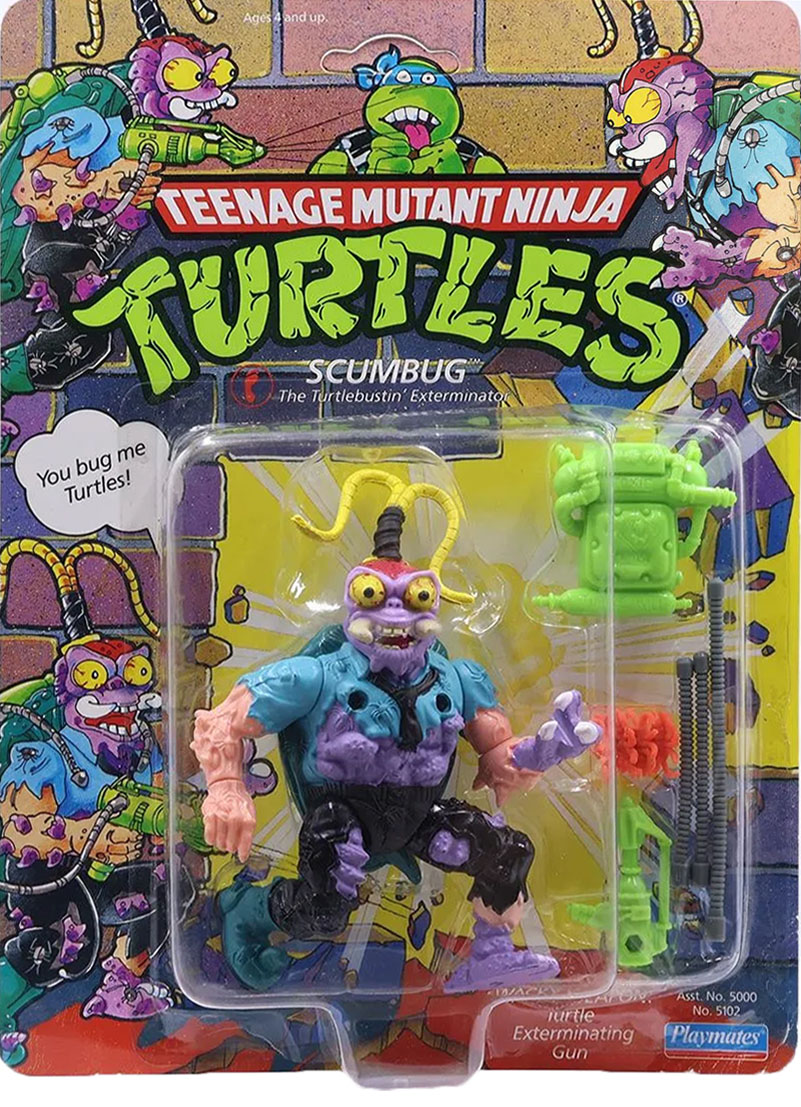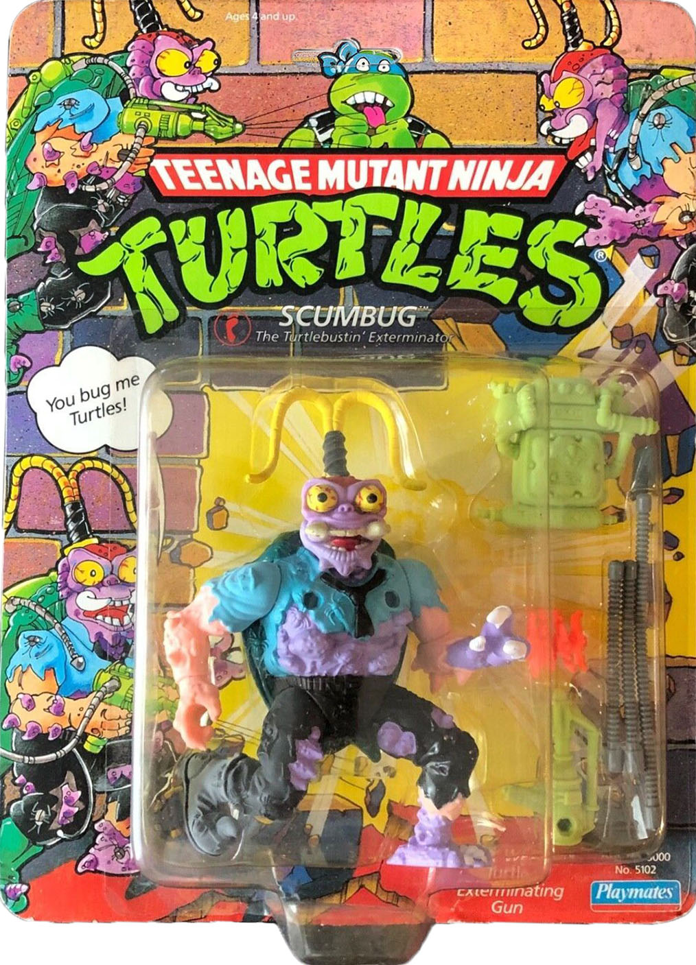 Scumbug est apparu pour la première fois dans le TMNT Adventures #10, en mai 1990. Son personnage était alors relativement différent de cette figurine. Il s’agissait d’un exterminateur de cafards engagé par Shredder pour nettoyer son repaire sur Terre. Tombé dans des barils de mutagène, il s’est changé en ce qu’il chassait. Puis part affronter Wyrm dans les égouts, dans un combat explosif. Du côté du dessin animé, il faudra attendre l’épisode La nuit des durs (S7 E6) pour voir l’insecte mutant faire son apparition, engagé par Shredder avec d’autres vilains, pour en finir avec ses ennemis à carapaces. À l’occasion, les tortues montrent connaître Scumbug, bien qu’il s’agisse de sa première et unique apparition dans la série.