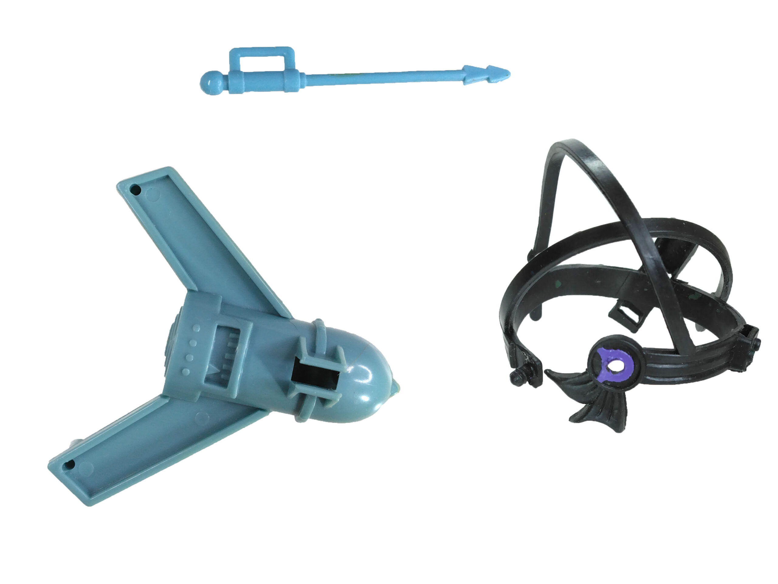 Le harpon est une pièce en plastique grise-bleutée, d’un matériau différent du jet aquatique. Un petit peu plus souple, vous pouvez soit le glisser dans l’encoche du jet par la poignée, soit le mettre dans la main de la tortue. Mais l’arme est bien petite et fait pâle figure. Le jet et le harpon ont été adaptés dans le dessin animé à travers l’épisode Les tortues font mouche (S3 E44).
