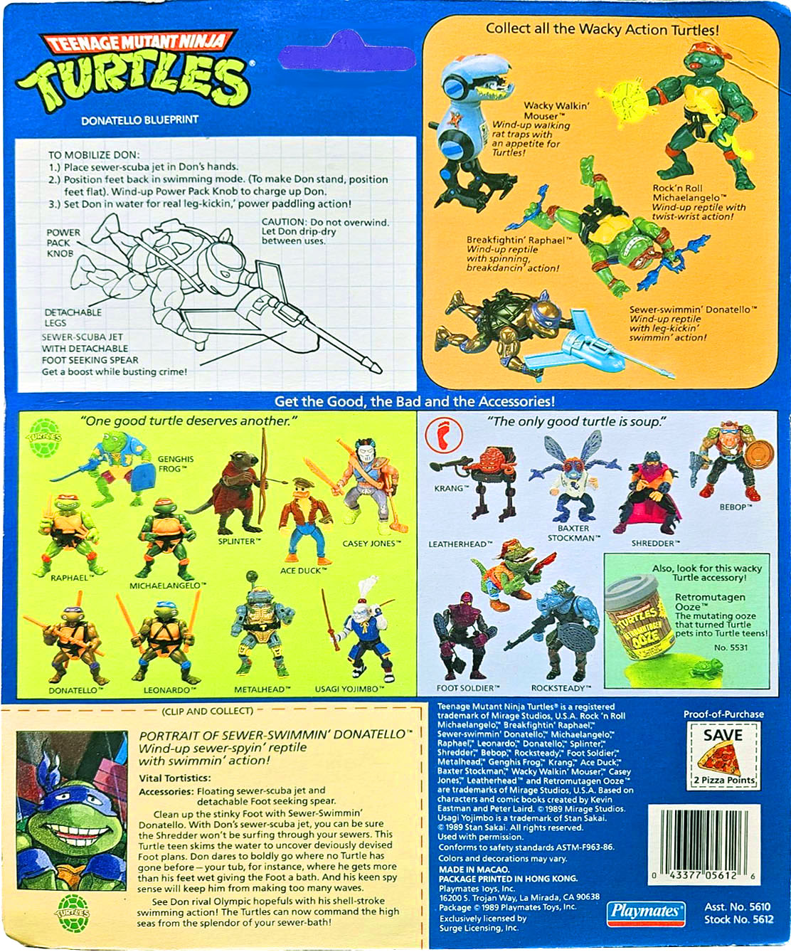 Playmates marque son premier changement dans les blisters avec ses figurines Wacky action. Exit le décor de briques, les blisters proposent une ambiance de rues, où chaque tortue évolue dans son élément. Donatello est présent sur deux illustrations en partie haute, affrontant un Bebop en fuite. Un encart est également présent à la gauche de la bulle de plastique, montrant la figurine avec son mécanisme personnel.