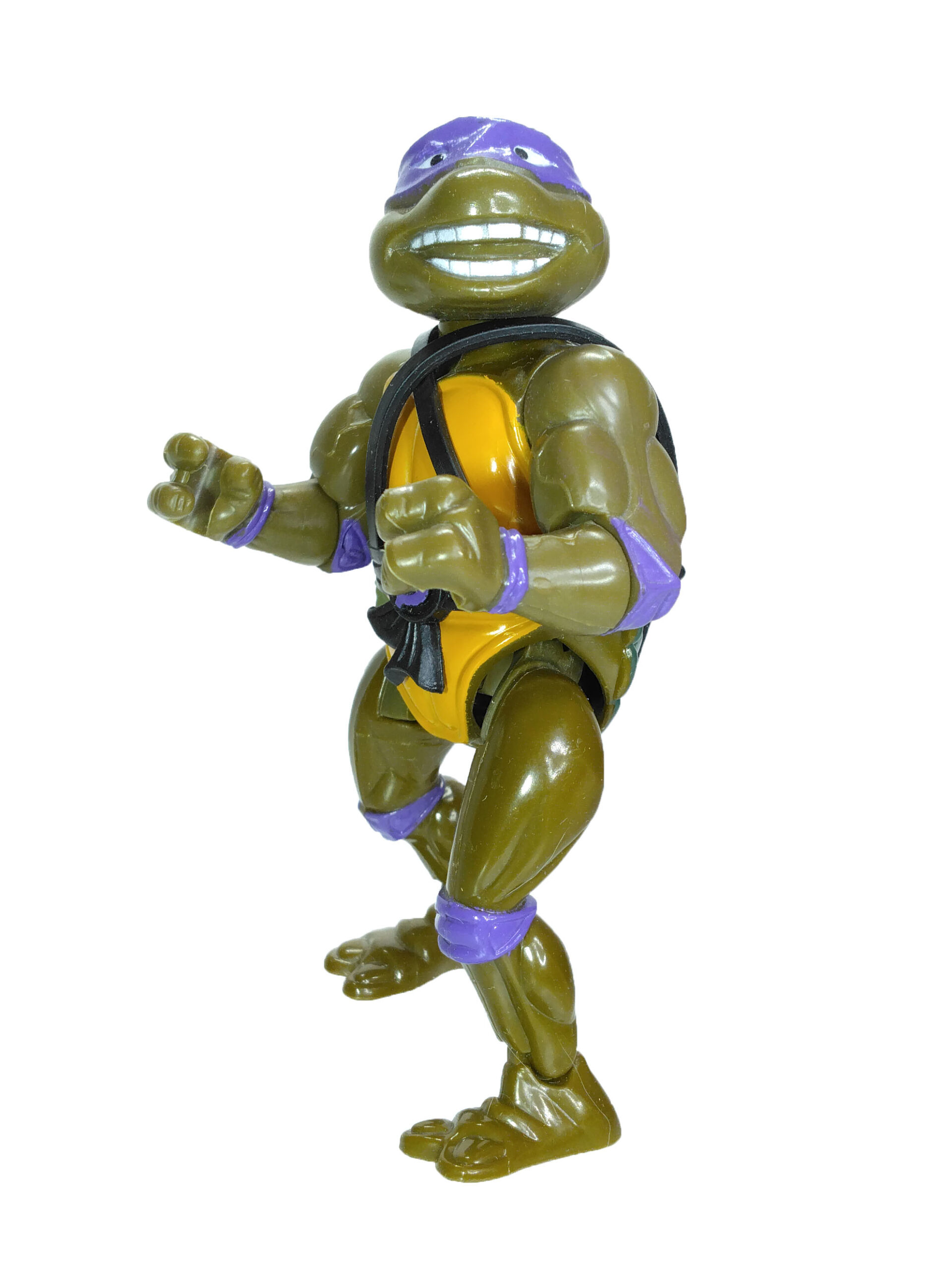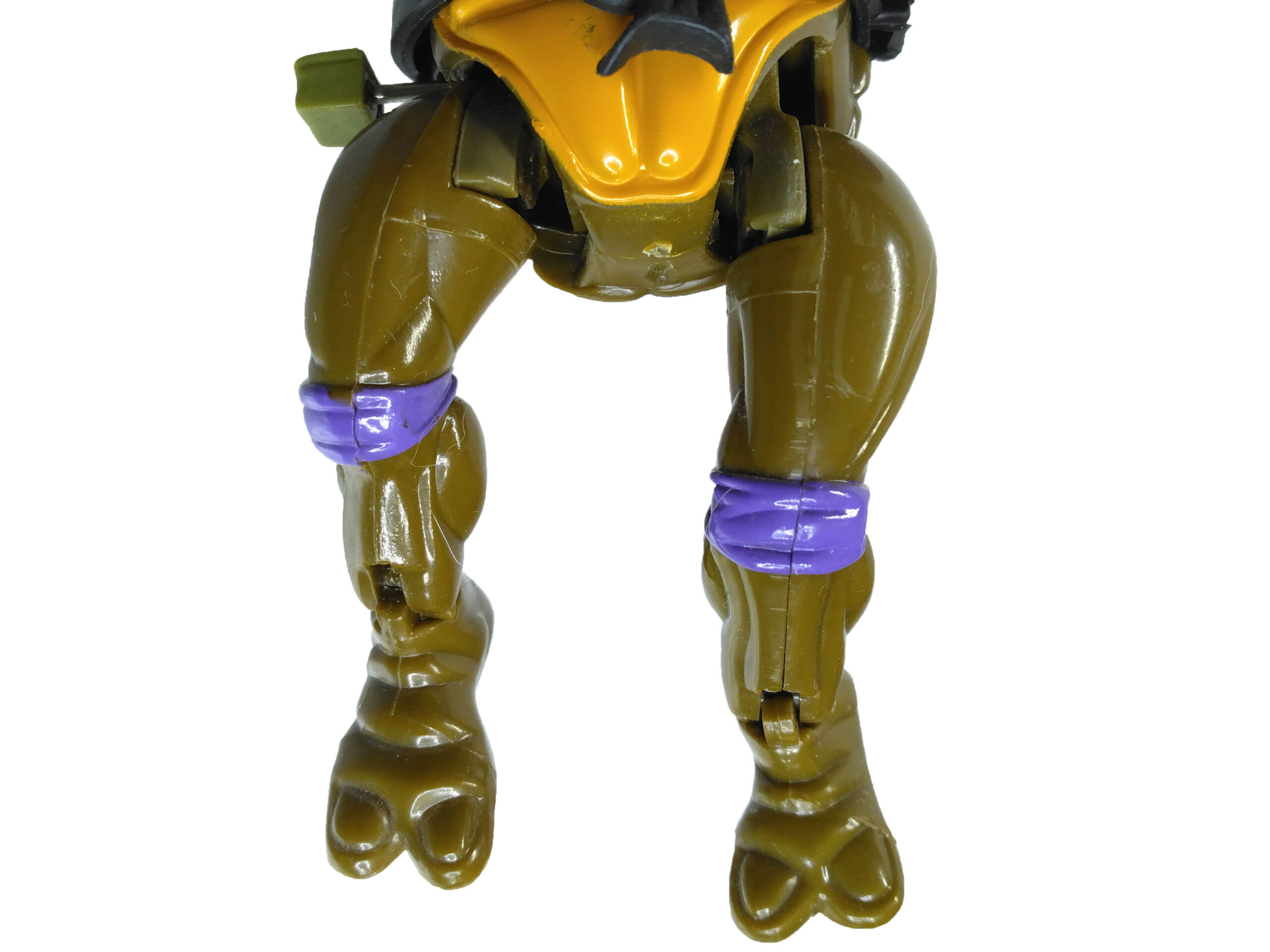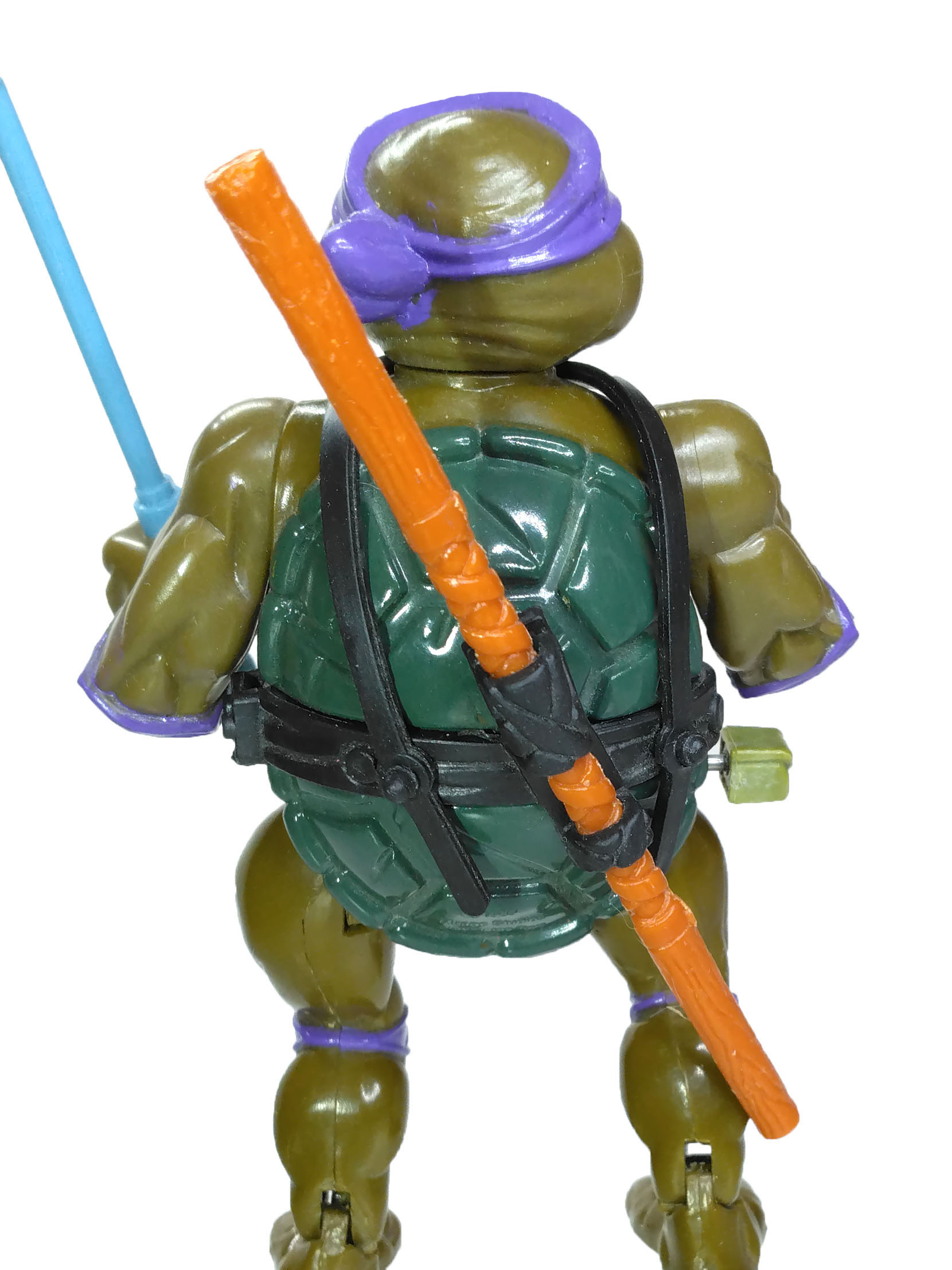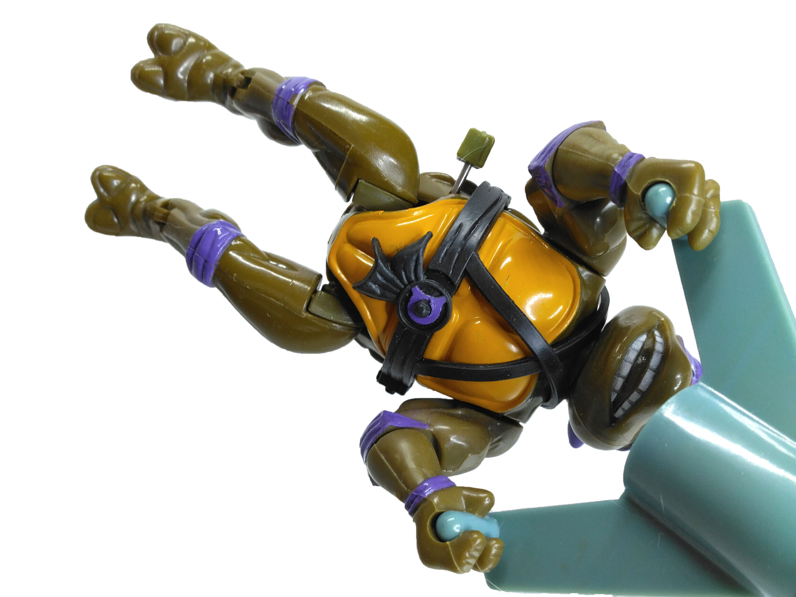 Cette figurine de Donatello est probablement la plus différente des quatre tortues Wacky action, par rapport à son modèle initial qu’est la figurine de 1988. Cela vient principalement des jambes, entièrement repensées pour faire fonctionner le mécanisme spécifique de la tortue. Du Donatello de 1988, il ne reste ici que la coque formée par la carapace et le plastron ainsi que les bras. Les mains sont légèrement retouchées, ce qui fait que la tortue peut tenir le bâton d’origine,mais difficilement à deux mains.