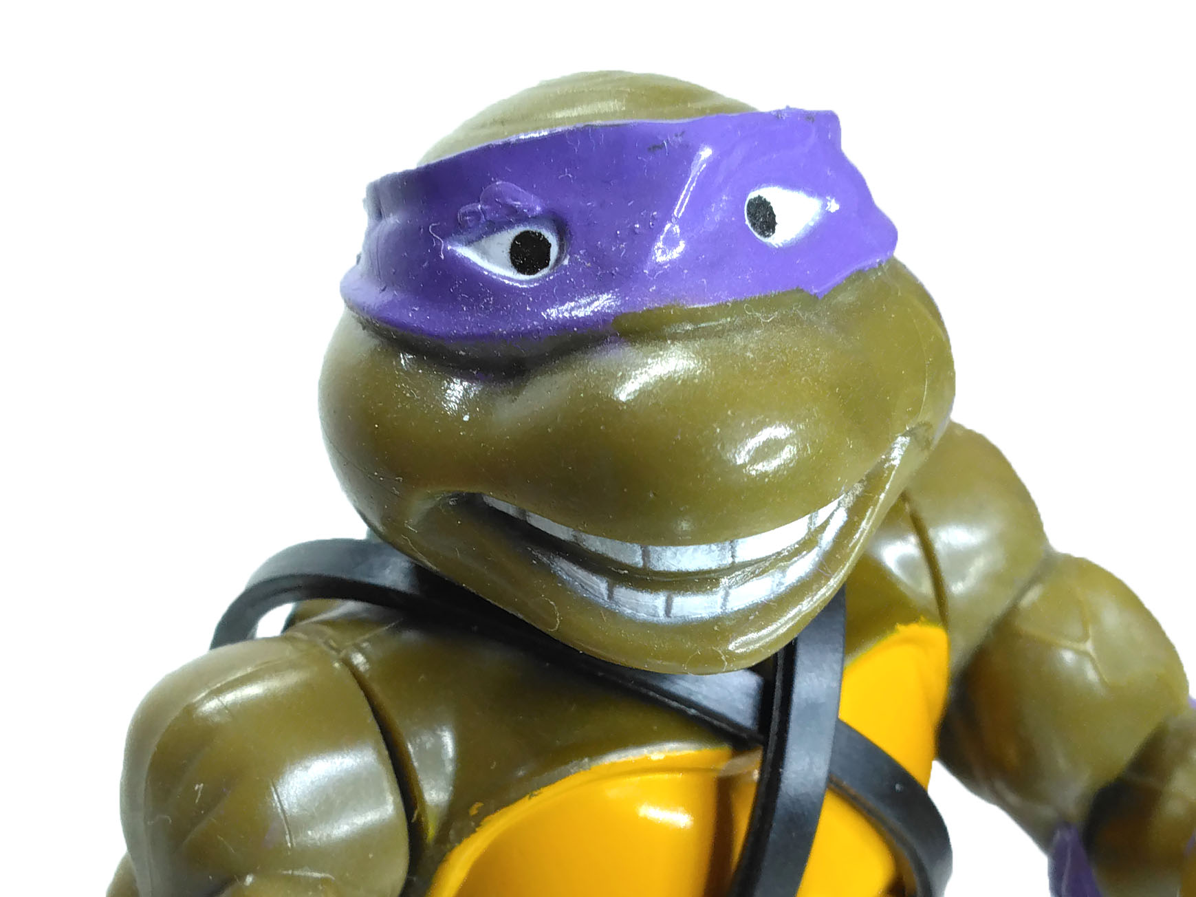 La tête, à l’instar des autres tortues Wacky action, est entièrement remodelée, plus large, mais aussi aux traits plus grossiers. Le rendu est loin d’être aussi fin que la version proposée par Varner Studios. Dans le catalogue de Playmates Toys pour le Toy Fair de 1989, le fabricant décrit ses figurines comme plus rigolotes. Ici, Donatello fait une grimace entre la surprise et la peur. On peut également la rapprocher de la tête qu’il fait lorsqu’il se jette à l’eau sur l’illustration du blister.