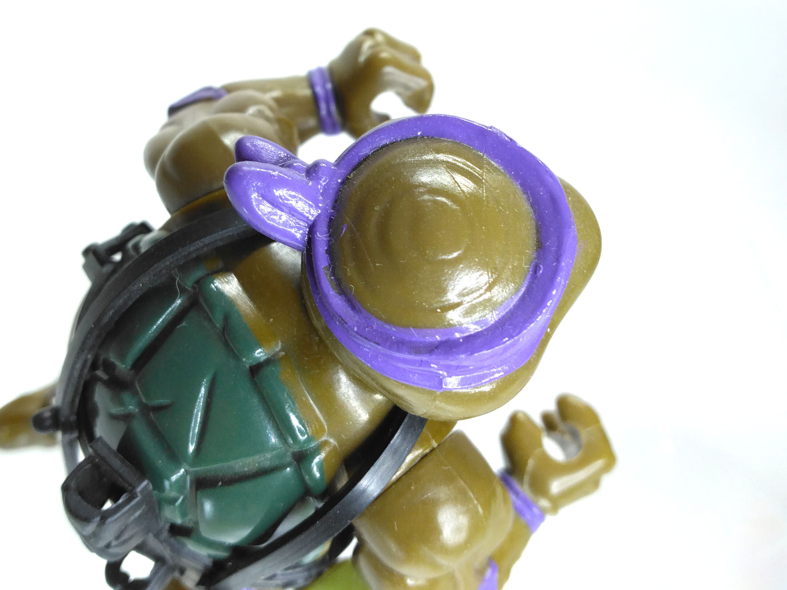 Enfin, la manière dont les couleurs sont apposées sur cette figurine, principalement au niveau du visage avec des peintures qui bavent ou sont grossièrement apposées, m’ont toujours donné une impression de qualité moindre par rapport aux figurines régulières. Il n’y a qu’à voir les photos de cette review ! Le violet du bandeau déborde sur le front de la tortue. L’intérieur de la bouche, visible à travers les mâchoires légèrement écartées, est laissé de la couleur du plastique.