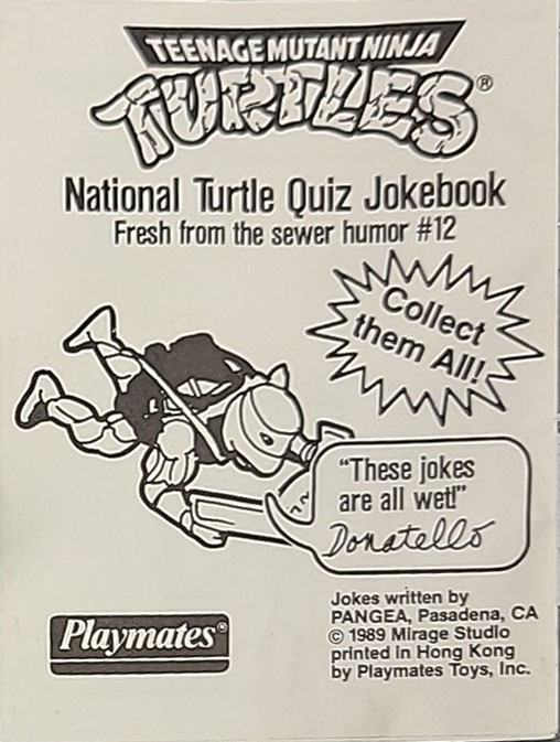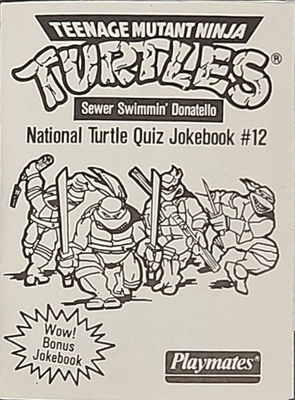 Ces nouvelles figurines étaient également accompagnées d’un livret de blagues. Il s’agissait d’un petit papier, vert pour les premières éditions, devenu blanc par la suite, avec quelques blagues et jeux de mots. Donatello possède le livret #12.