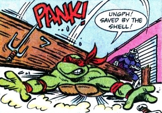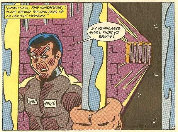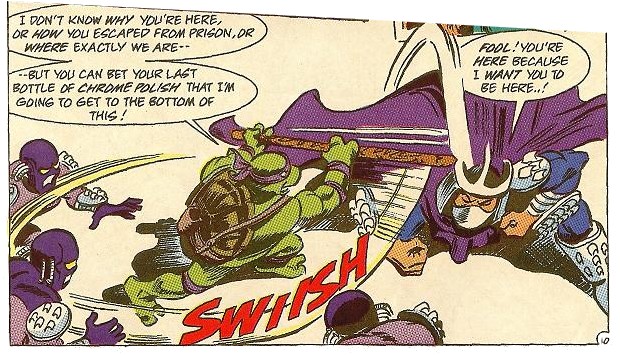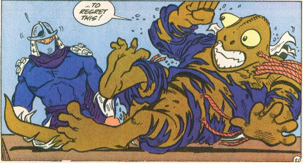 Les tortues affrontèrent un ennemi qui ne ressentait pas la douleur, mais qui était moins adroit qu’Oroku Saki. C’est finalement Raphael qui parvint à extraire l’extraterrestre de la tête de leur vieil ennemi, qui s’en alla remerciant les tortues. Il avait conscience de leur être redevable… (TMNT A. #25).