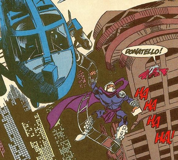 De retour à New York, les tortues durent affronter un Foot super soldier géant que Shredder avait construit avec les moyens découverts dans cette cachette. La machine fut finalement maîtrisée par l’esprit du guerrier Dragon (TMNT A. #20). Si cette défaite n’était pas forcément prévue, cela lui avait permis de retrouver la trace des tortues et de capturer Donatello (TMNT A. #21). Lorsque ses frères vinrent le sauver, il leur tendit un piège, déjoué par Raphael, qui venait de revenir en ville (TMNT A. #22).