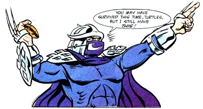 Un jour, il partit pour les égouts de la ville déverser du mutagène afin de contaminer son vieux rival et lui retirer ce qui lui restait de son humanité. Il créa ainsi Splinter et les tortues, sans savoir qu’elles lui poseraient tant de problèmes par la suite (Metamorphosis).