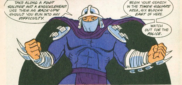 Une vague de vols frappa New York 15 années plus tard. L’affaire fut couverte par la journaliste April O’Neil, qui avait touché un point sensible et se retrouva menacée par les hommes de mains de Shredder. Elle fut sauvée par quatre tortues mutantes, formées par Hamato Yoshi, devenu un rat mutant à son tour. Les quatre ninjas mirent en déroute des robots Foot de Shredder et se lancèrent à sa poursuite. Splinter reconnut dans l’accoutrement de l’armée vaincue celui de son ancien clan. Lorsqu’ils partirent à la recherche du Technodrome, le rat se fit capturer (TMNT A. mini-series #1). Shredder s’était lui aussi entouré de mutants, Bebop et Rocksteady, deux voyous des rues. Stupides et brutaux, ils étaient incapables de venir à bout des tortues, venues sauver leur maître. Shredder décida par la suite de contacter le scientifique Baxter Stockman, puis les armées de Krang en Dimension X (TMNT A. mini-series #2). Ces deux tentatives furent de nouveaux échecs. L’homme accepta donc de construire son corps robotique à Krang. Cette opération se soldat également par un échec (TMNT A. mini-series #3).
