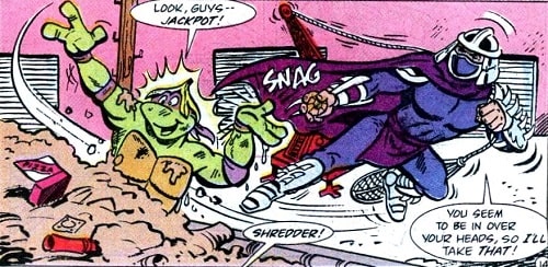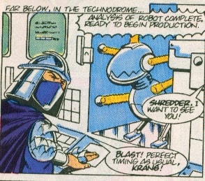 Shredder n’avait pas dit son dernier mot. Lorsque les tortues retrouvèrent sa trace, il se lança dans ce qui devait être son ultime combat. Malheureusement pour lui, Krang revint avec un vaisseau, échappé de Morbus, bien décidé à se venger de la traitrise de ses actes sur Hirobyl (TMNT A. #13). Avec l’aide de Bellybomb, il se fit greffer sur le corps de Shredder, pouvant ainsi contrôler son corps (TMNT A. #24).