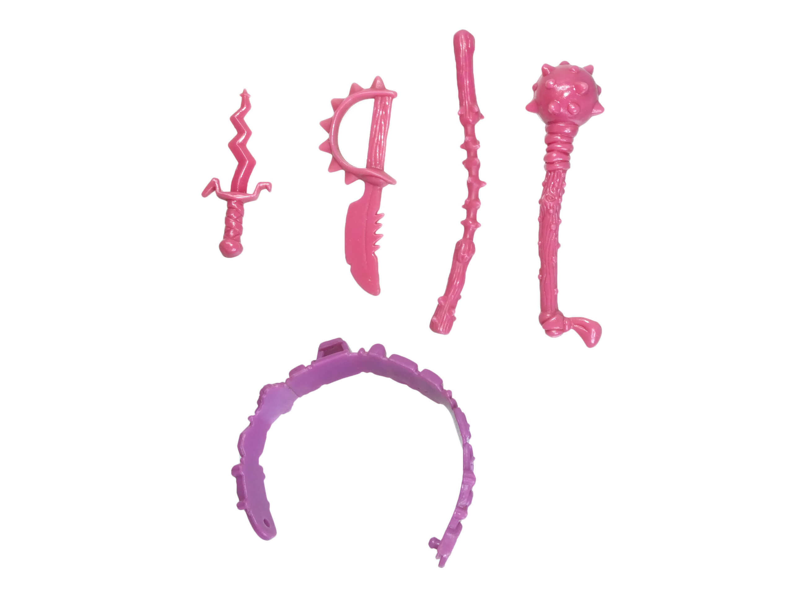 La réédition de la figurine en 1990 proposait ces quatre armes dans un plastique plus souple que d’ordinaire. La matière fait presque penser au plastique souple des épaulettes et des griffes. La composition de ce plastique tendait d’ailleurs à s’oxyder, devenant plus collant que le plastique classique et rigide.