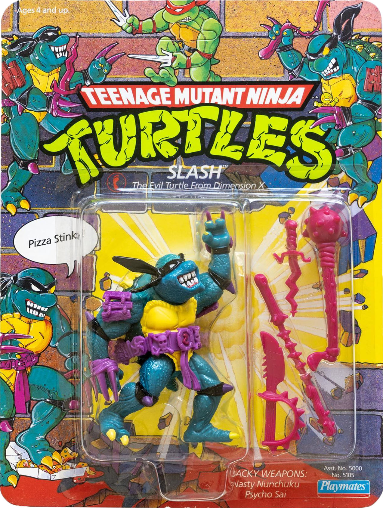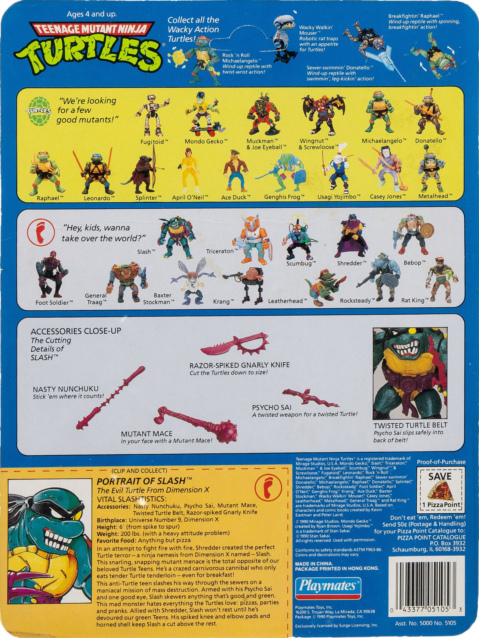 Contrairement aux idées reçues, Slash n’est probablement pas sorti lors de la wave 4 de Playmates Toys, au deuxième trimestre 1990, mais bien avant la wave 5 de la fin d’année. En premier lieu, nous observons un blister légèrement différent de celui des figurines déjà parues. Il s’agit du même style que celui de Mondo Gecko, réalisé lui plus tardivement mais bien sorti en wave 4. Toutefois, contrairement au Fugitoid, sorti en même temps, Slash possède comme le triceraton un point après la mention de provenance de Chine et/ou de Macao, ce qui indique une conception légèrement plus ancienne.