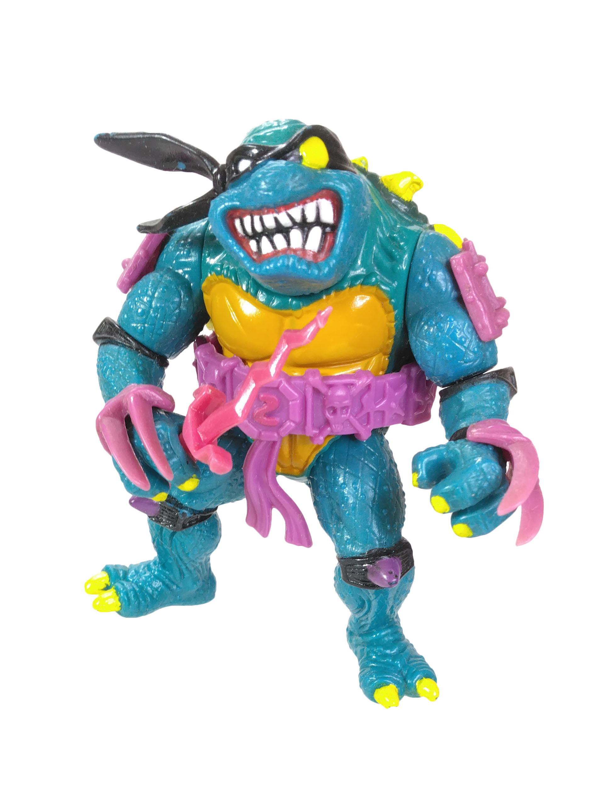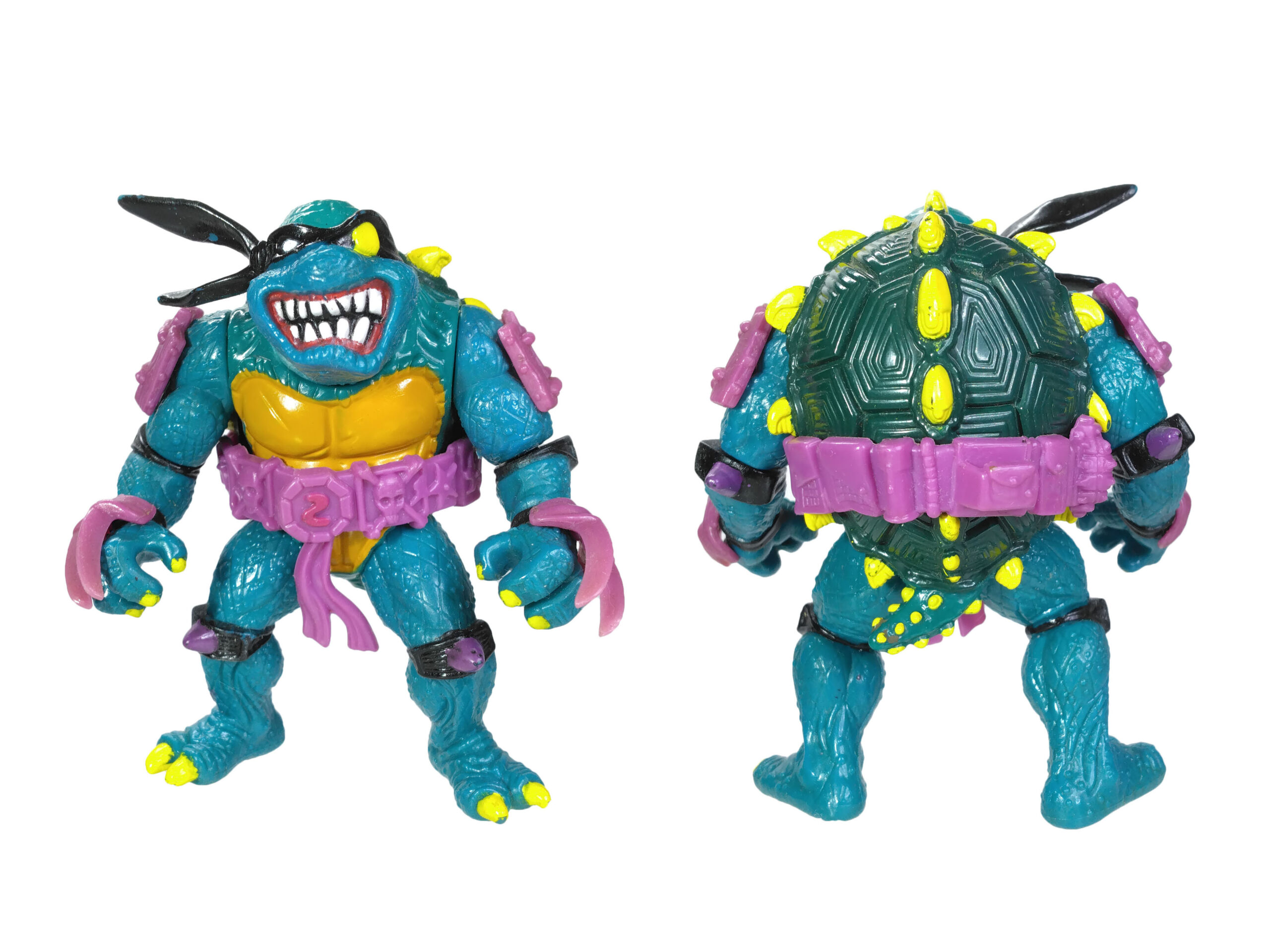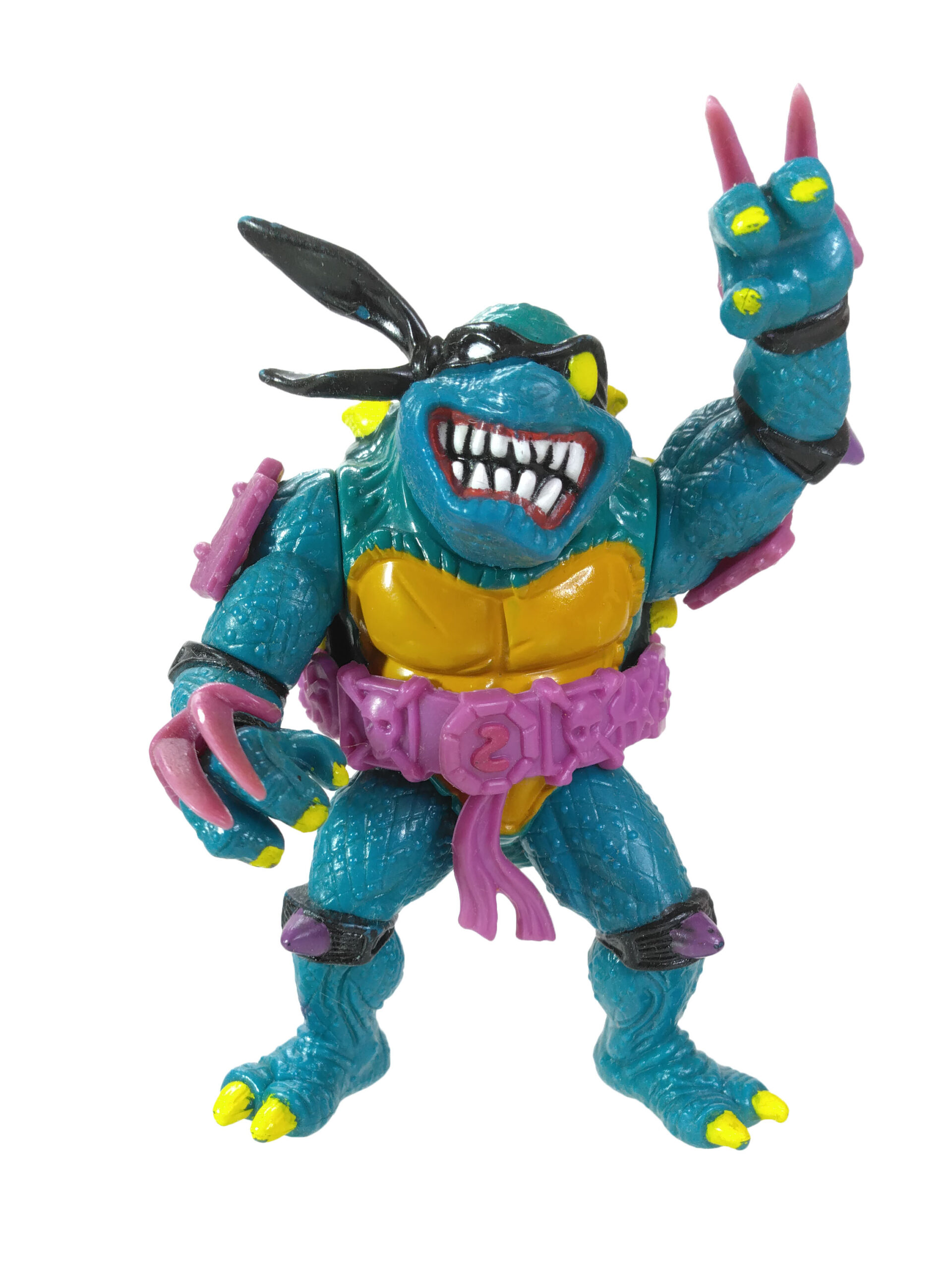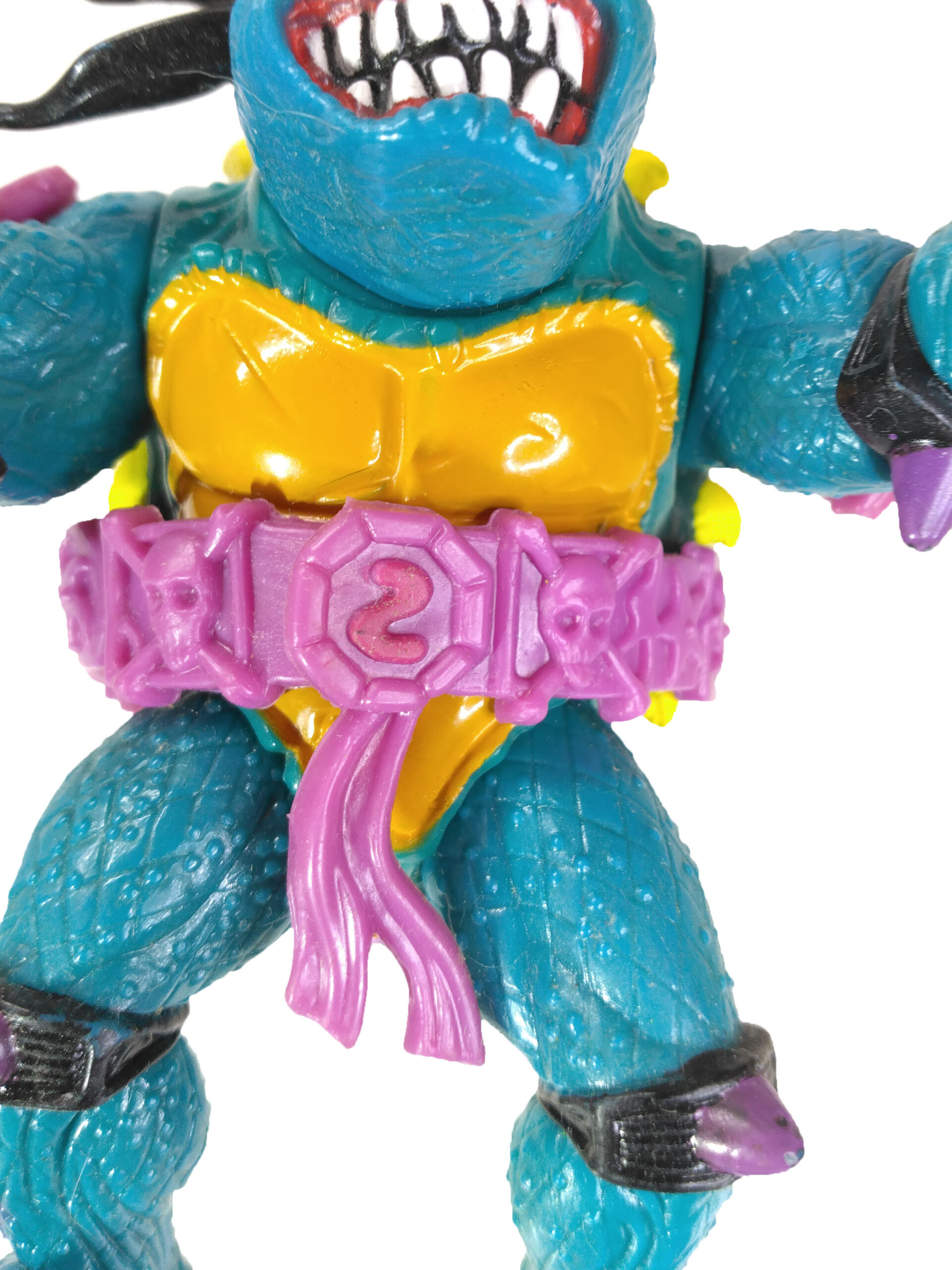 En réalité, l’étude des blisters (à retrouver en fin de review) a démontré que les ceintures mauves étaient bien les premières productions, avec un S rouge (la plus rare des figurines) ! L’on pouvait les retrouver aussi bien sur des Slash au ventre clair, qu’au ventre jaune moutarde. Cette différence de teinte pour le ventre n’est pas sans rappeler également les tortues, qui sur les premières éditions possédaient un ventre clair, avant de connaître une teinte plus foncée au gré des rééditions dès fin 1988.