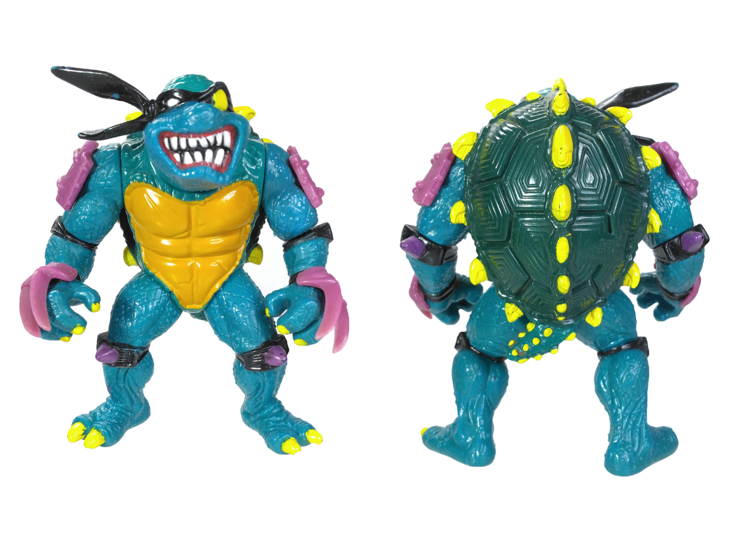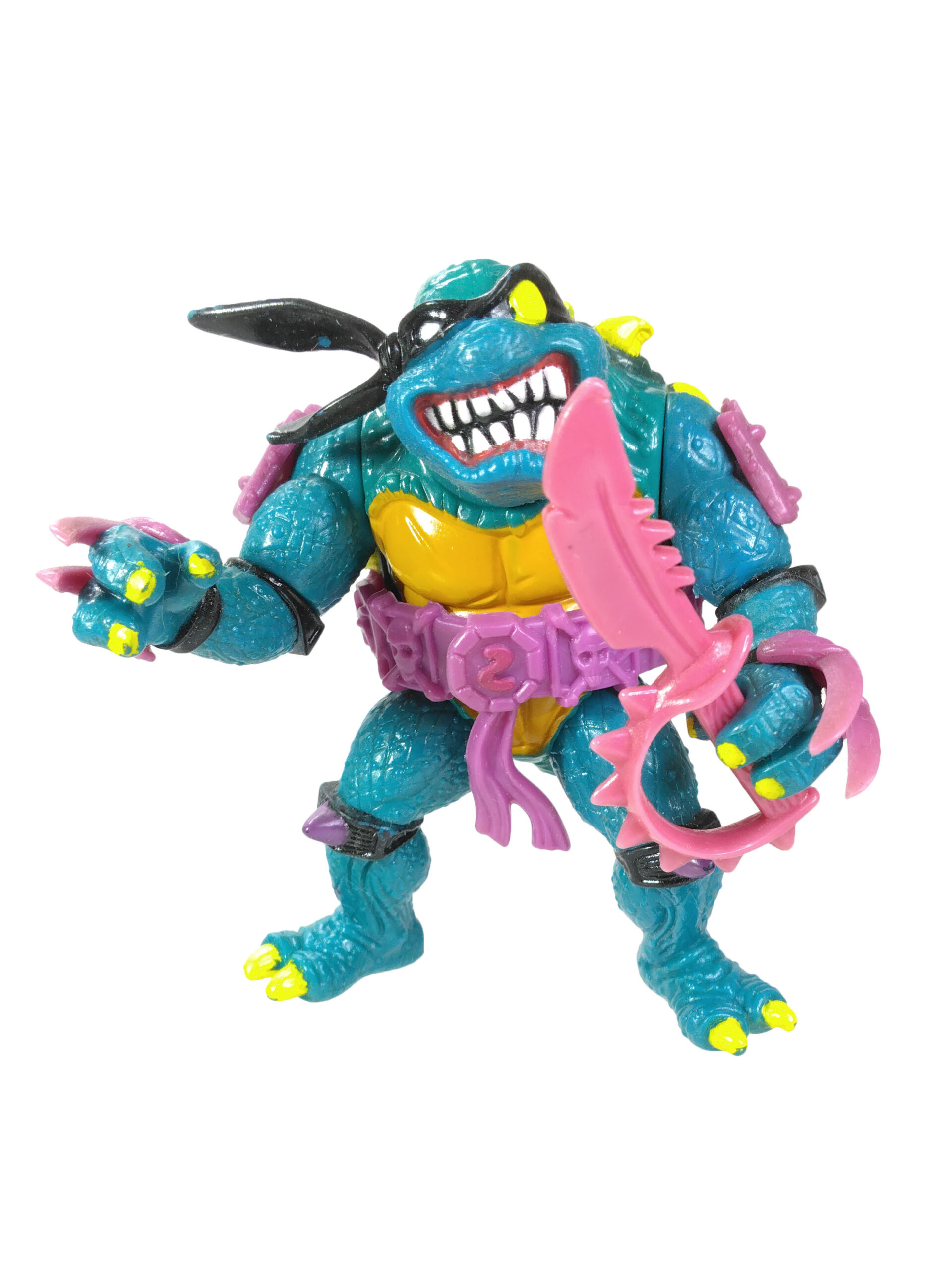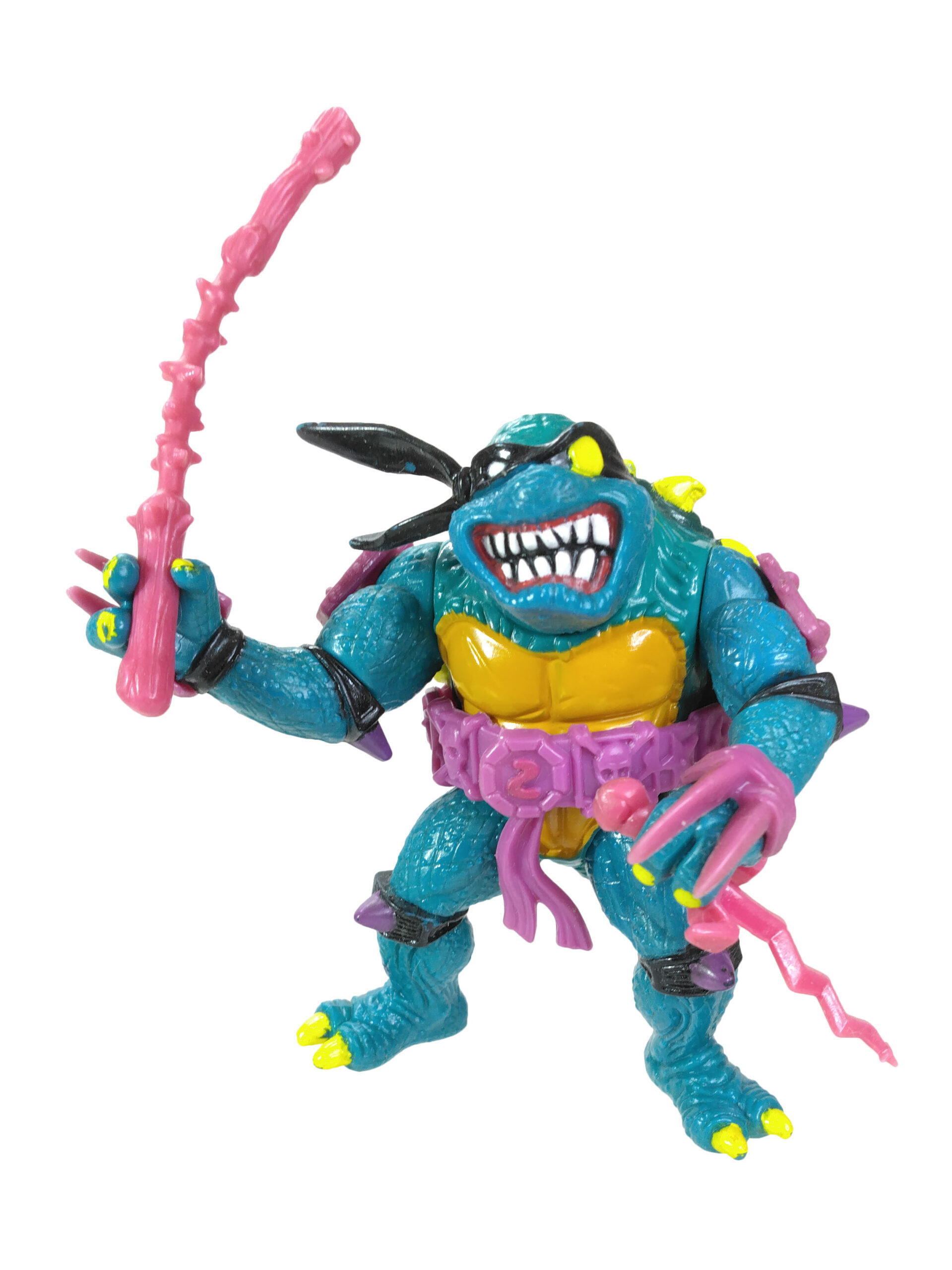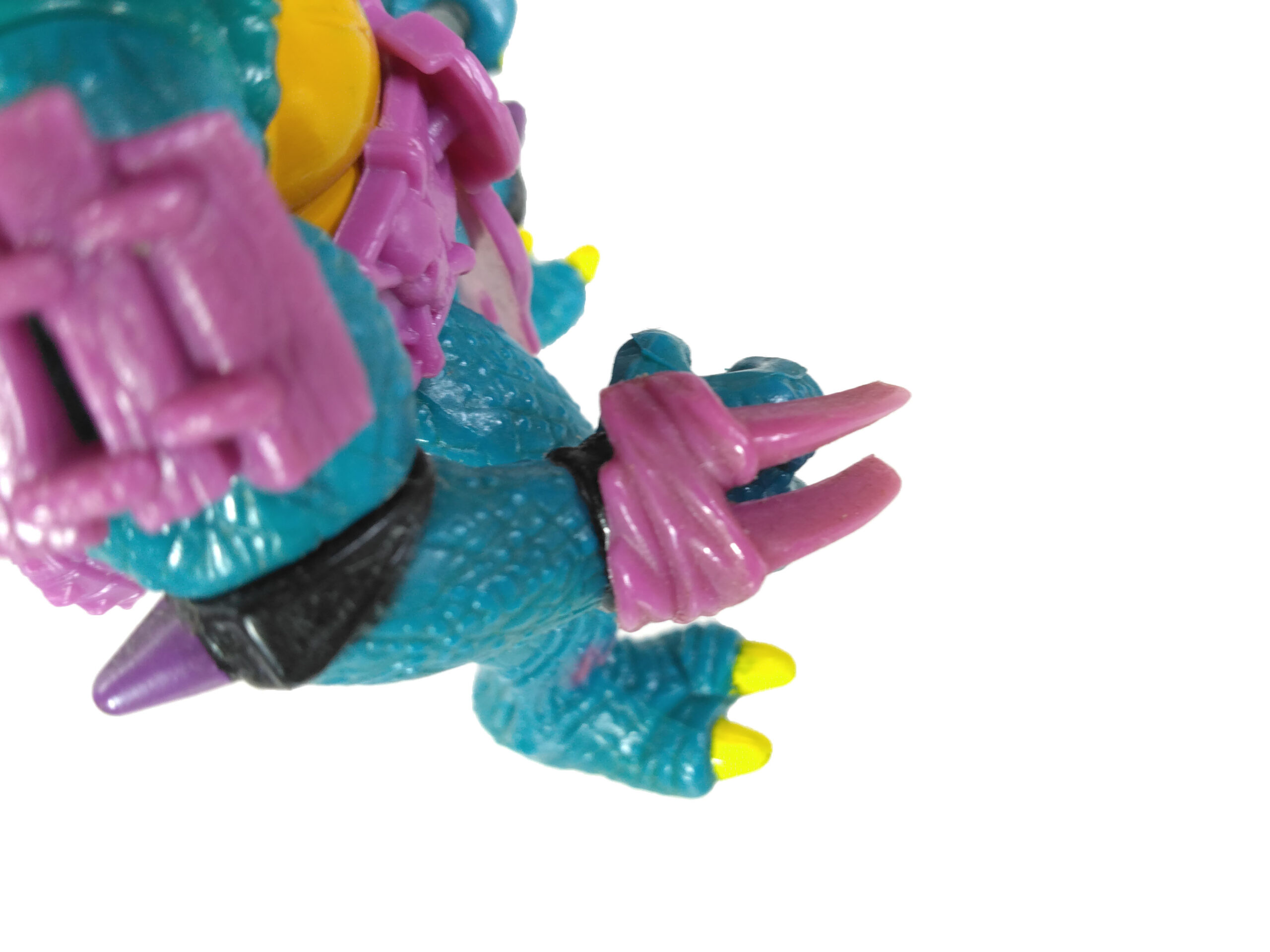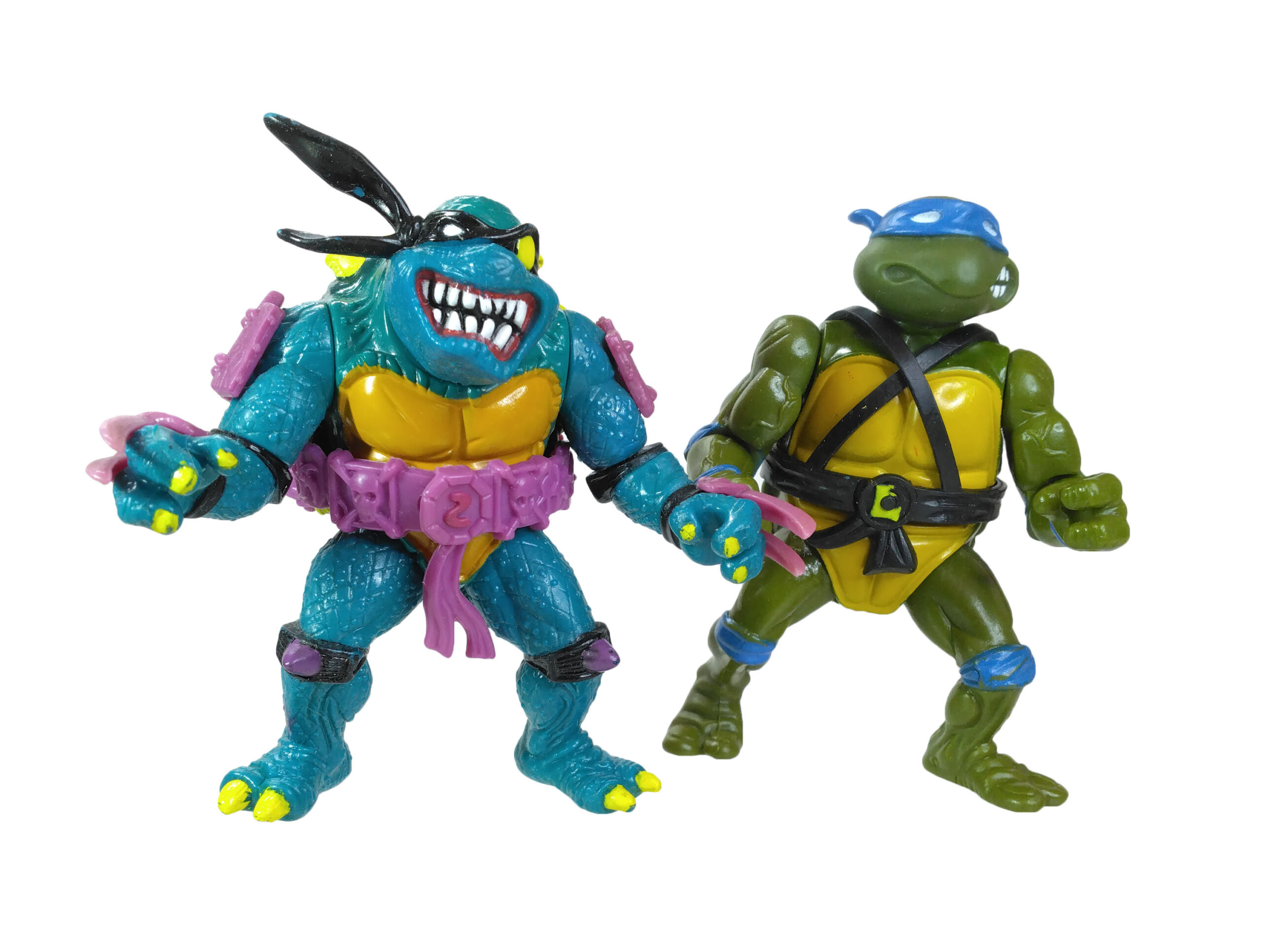 En réalité, l’étude des blisters (à retrouver en fin de review) a démontré que les ceintures mauves étaient bien les premières productions, avec un S rouge (la plus rare des figurines) ! L’on pouvait les retrouver aussi bien sur des Slash au ventre clair, qu’au ventre jaune moutarde. Cette différence de teinte pour le ventre n’est pas sans rappeler également les tortues, qui sur les premières éditions possédaient un ventre clair, avant de connaître une teinte plus foncée au gré des rééditions dès fin 1988.