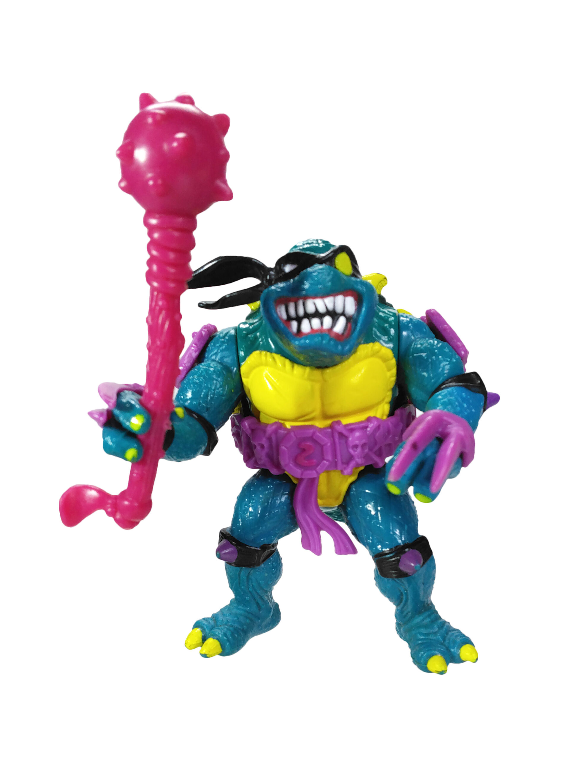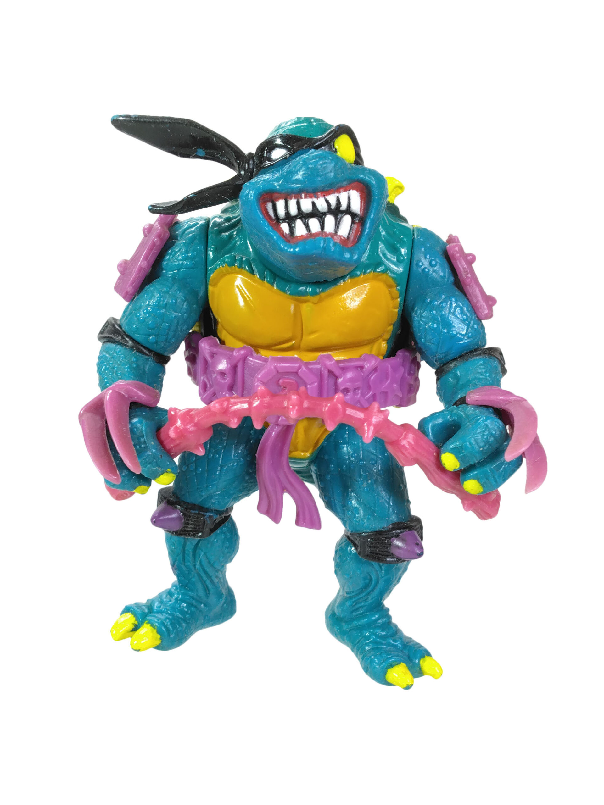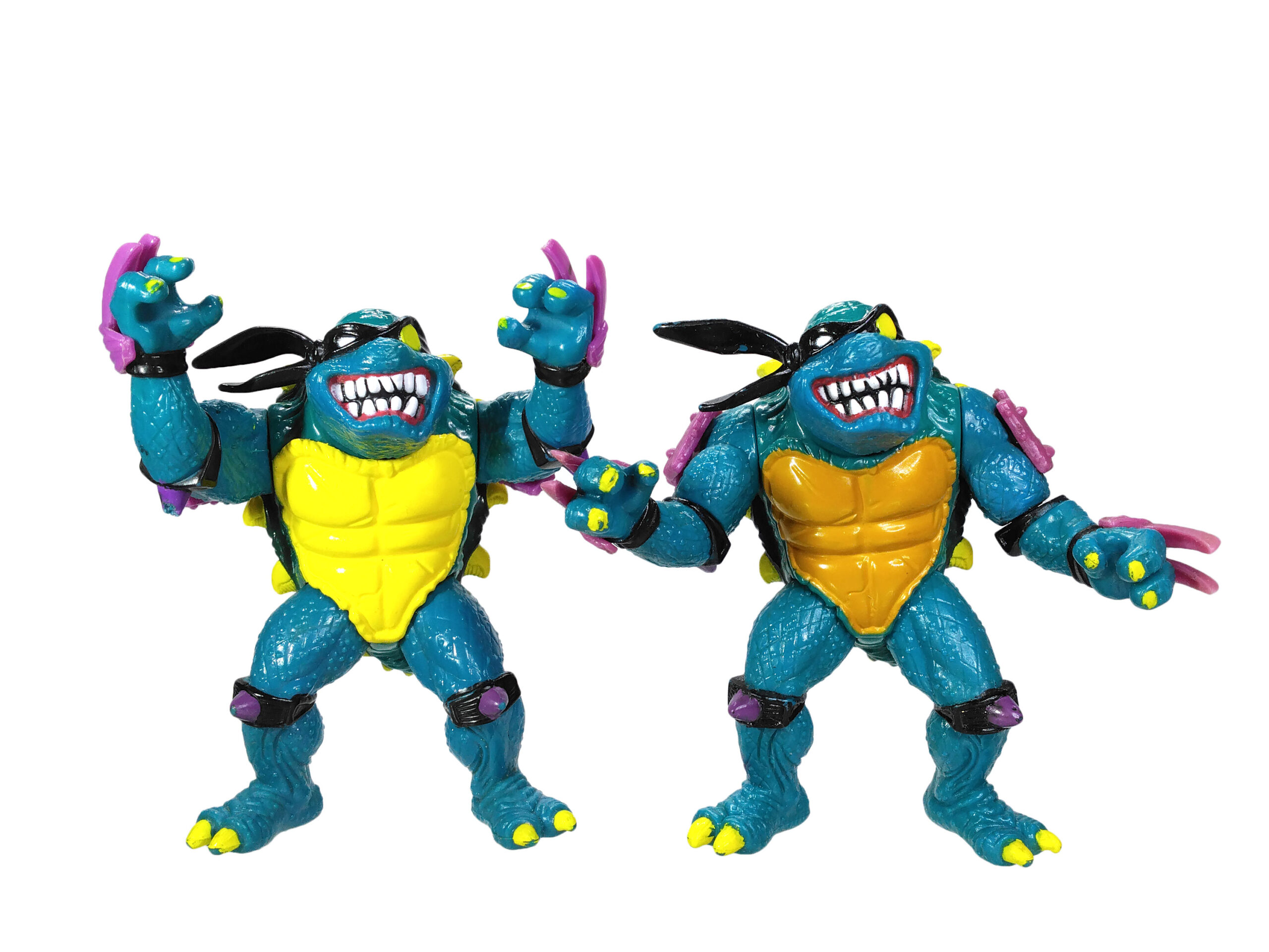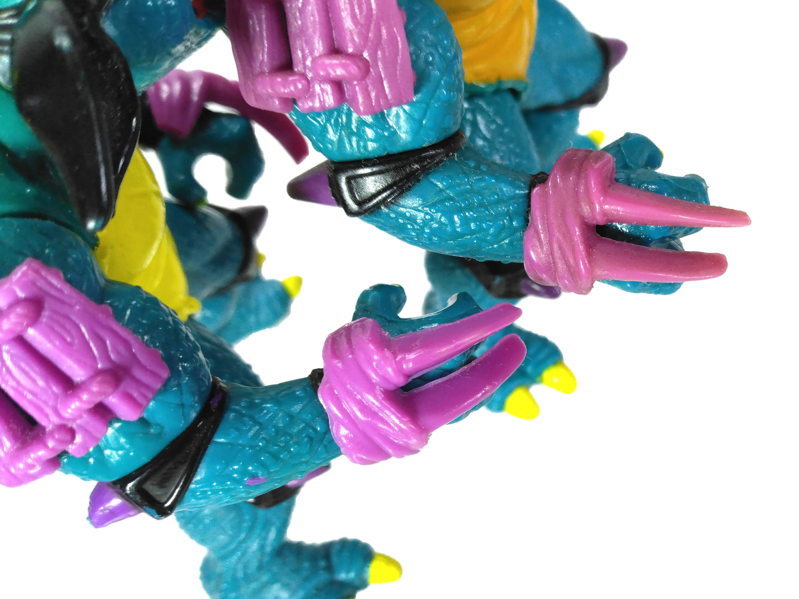 En réalité, l’étude des blisters (à retrouver en fin de review) a démontré que les ceintures mauves étaient bien les premières productions, avec un S rouge (la plus rare des figurines) ! L’on pouvait les retrouver aussi bien sur des Slash au ventre clair, qu’au ventre jaune moutarde. Cette différence de teinte pour le ventre n’est pas sans rappeler également les tortues, qui sur les premières éditions possédaient un ventre clair, avant de connaître une teinte plus foncée au gré des rééditions dès fin 1988.