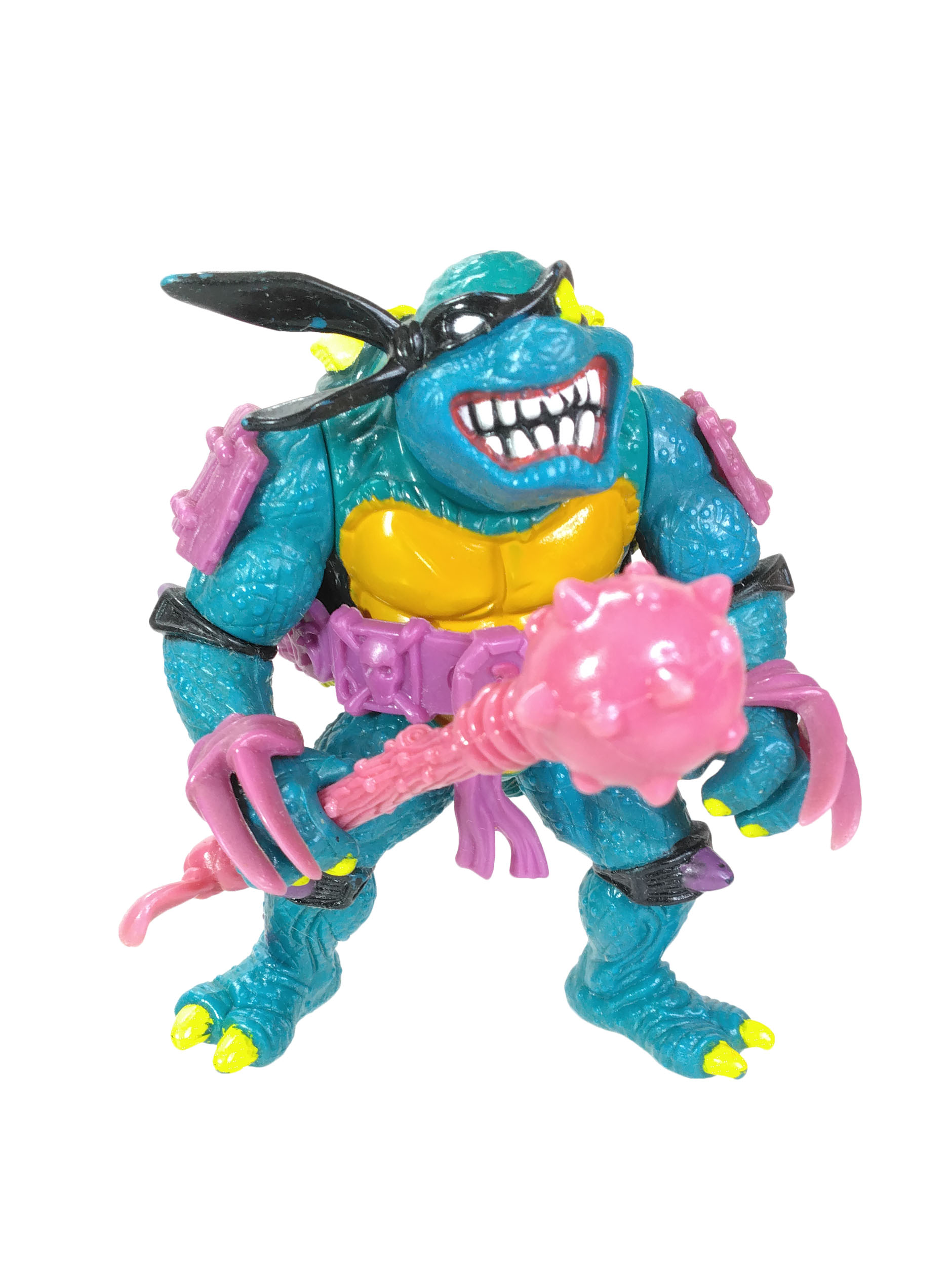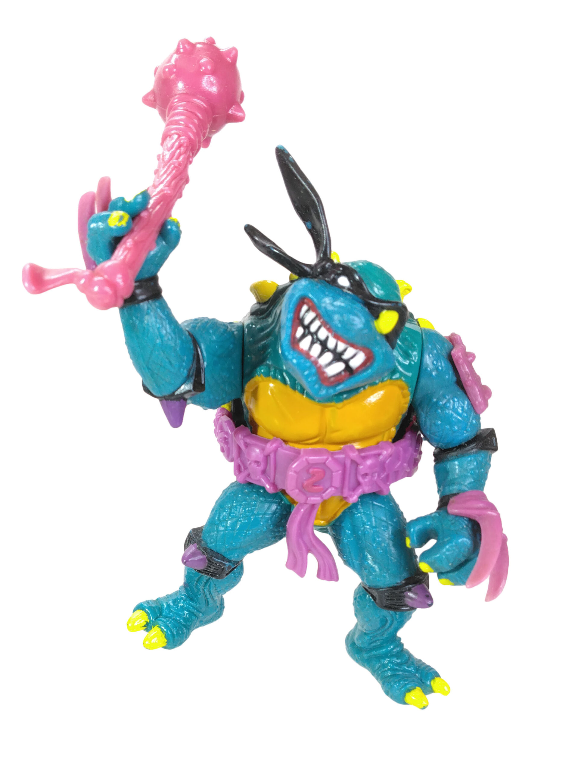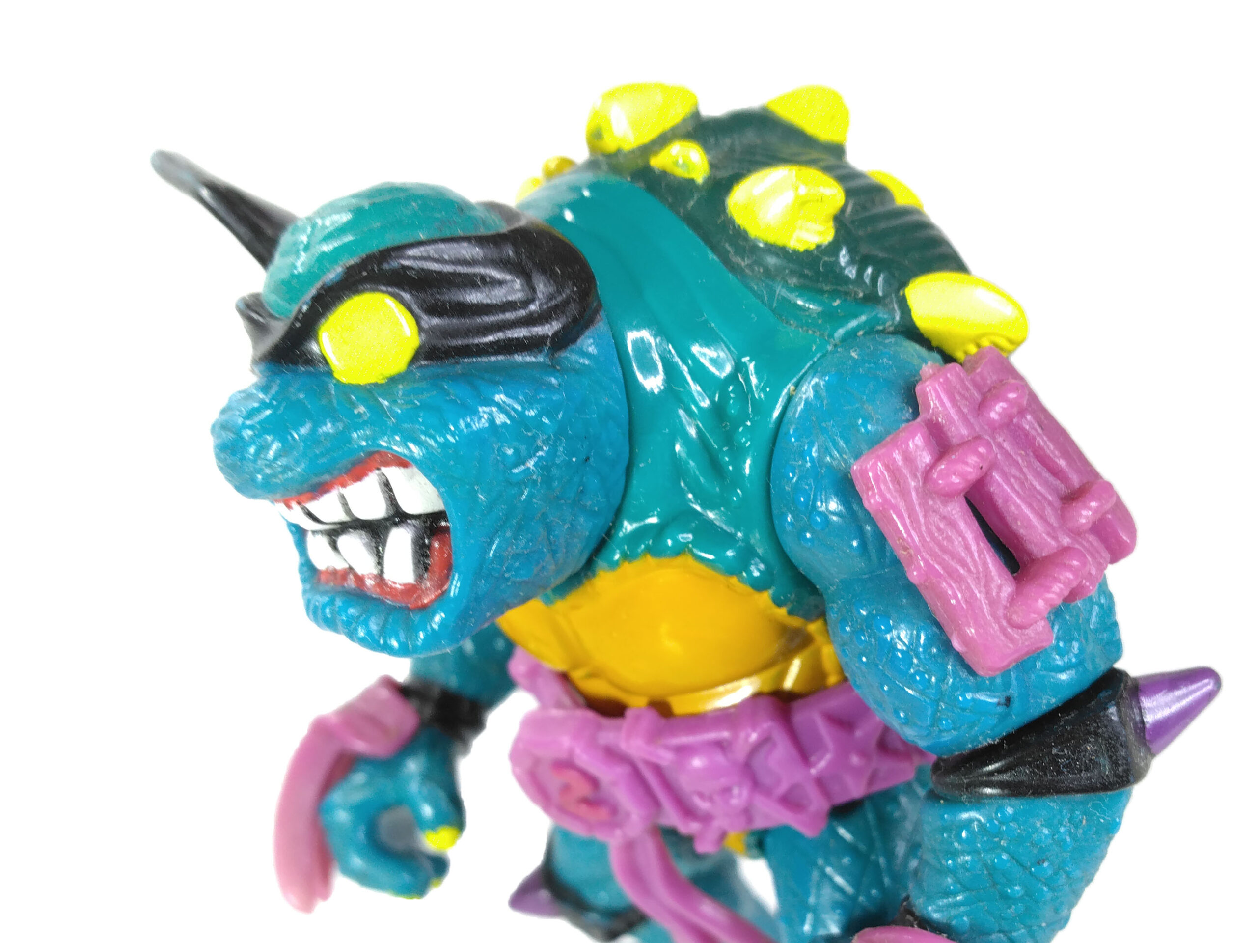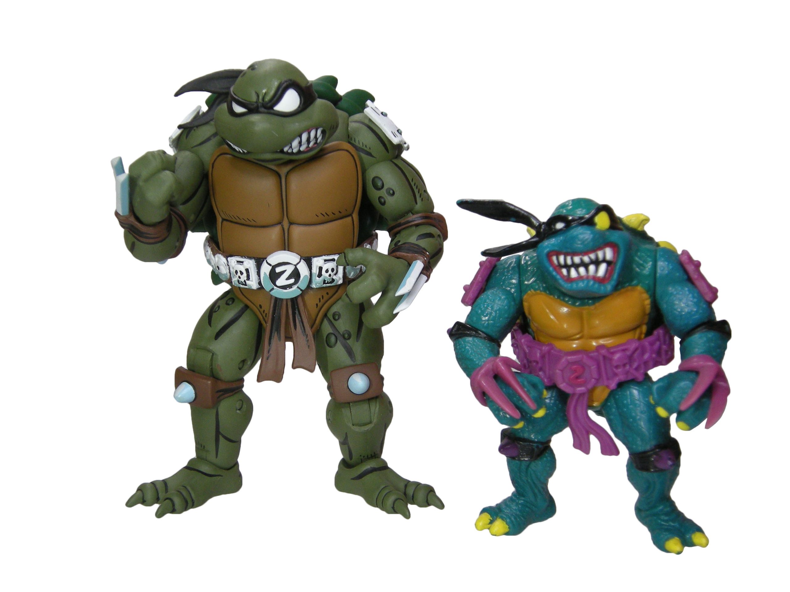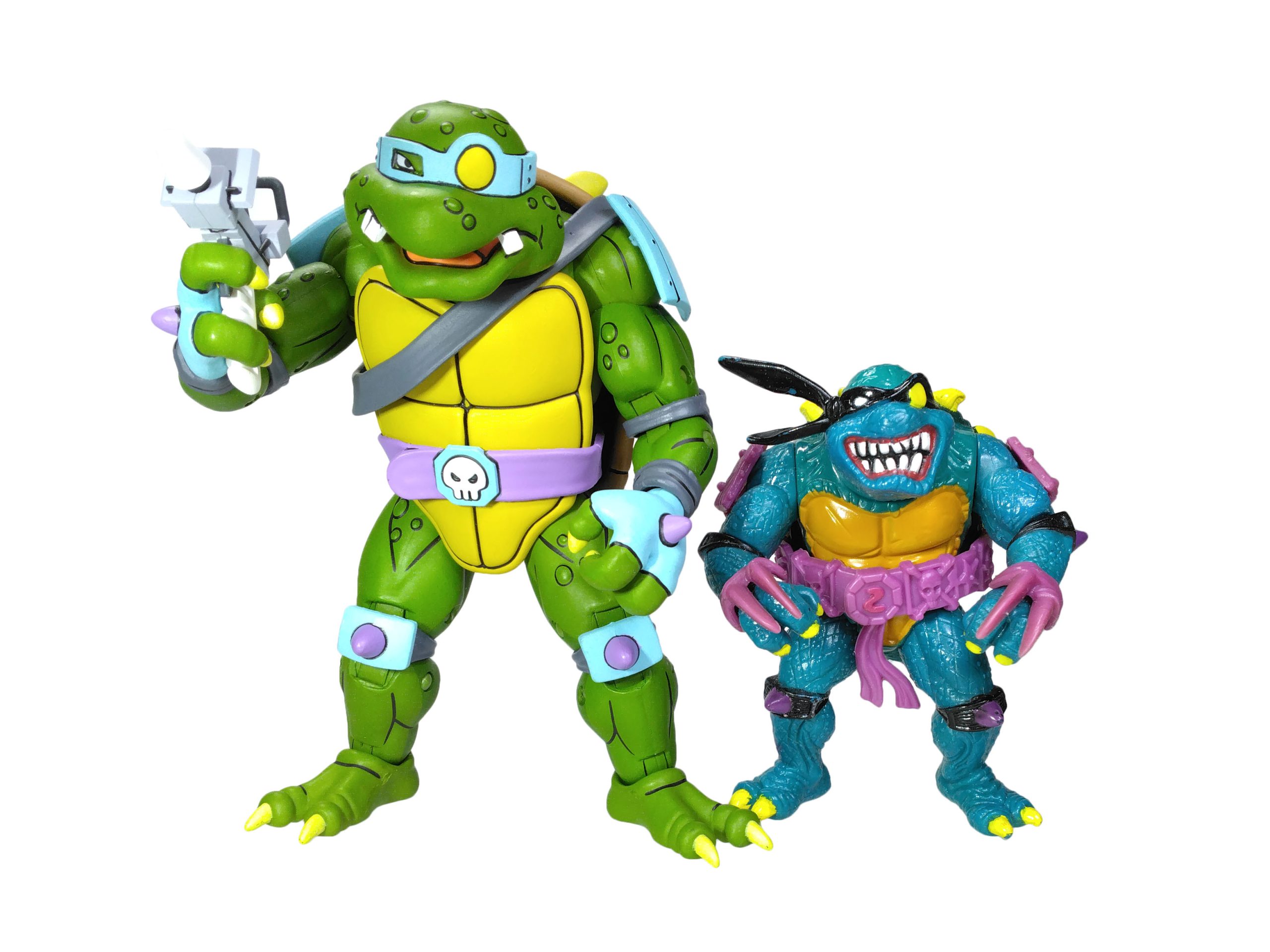 En réalité, l’étude des blisters (à retrouver en fin de review) a démontré que les ceintures mauves étaient bien les premières productions, avec un S rouge (la plus rare des figurines) ! L’on pouvait les retrouver aussi bien sur des Slash au ventre clair, qu’au ventre jaune moutarde. Cette différence de teinte pour le ventre n’est pas sans rappeler également les tortues, qui sur les premières éditions possédaient un ventre clair, avant de connaître une teinte plus foncée au gré des rééditions dès fin 1988.