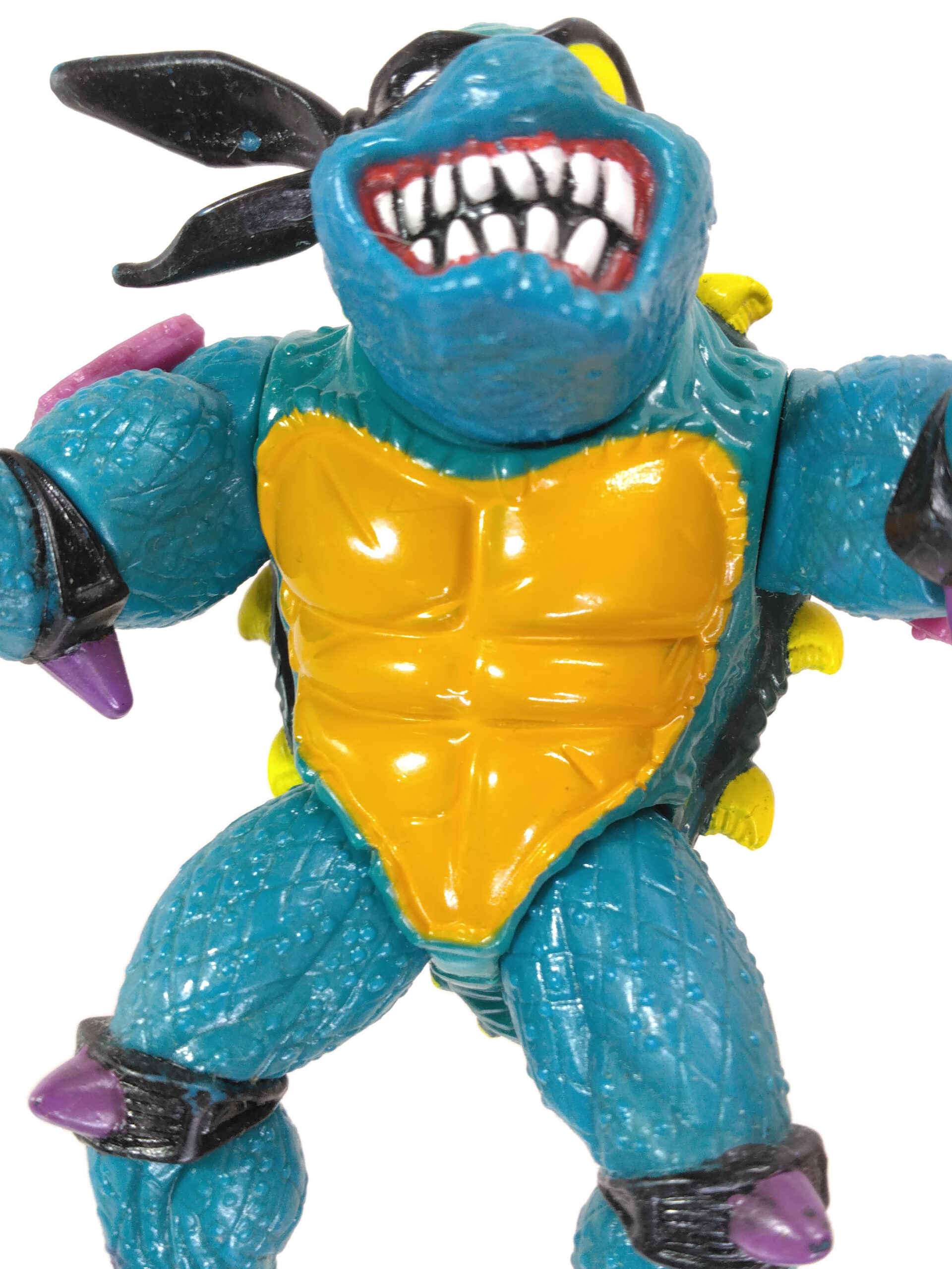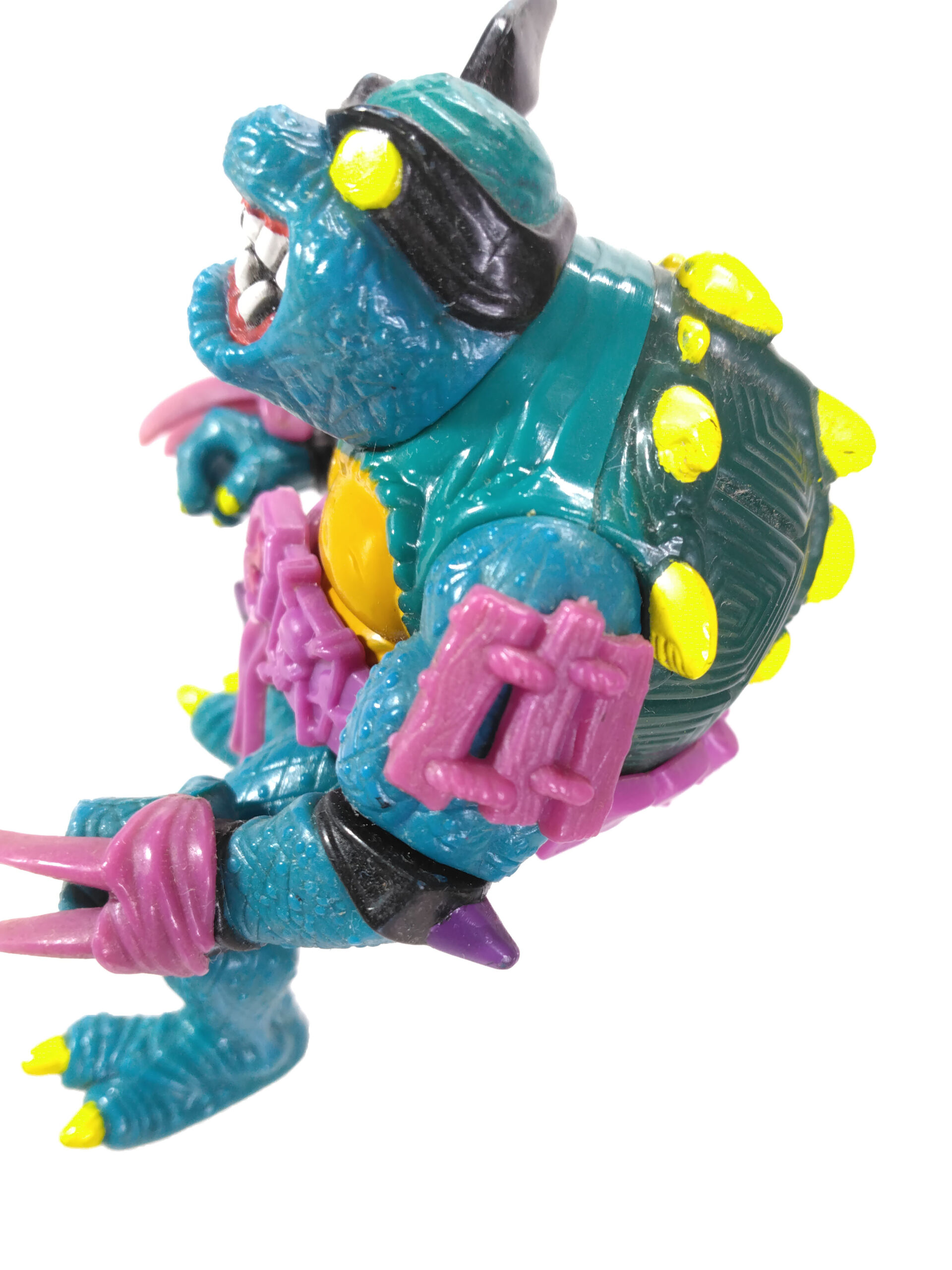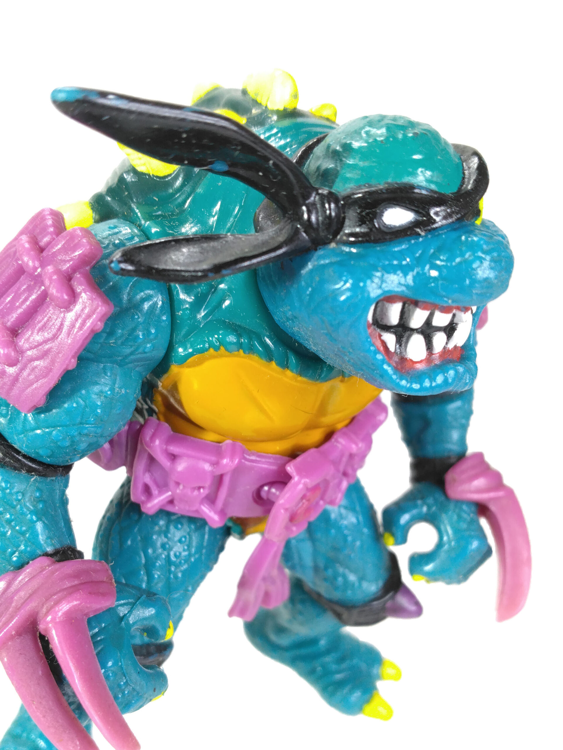 La figurine de Slash propose un schéma de peinture similaire aux tortues, avec une peau verte émeraude claire et un ventre jaune. La carapace est d’un vert plus foncé, et ravivée par les pics, peints de jaune. Le visage de Slash est très détaillé, avec un bandeau noir, un œil blanc et l’autre jaune. Les dents sont toutes peintes de blanc et même les gencives sont représentées ! Enfin, détail très appréciable, l’intérieur de la bouche est également peint de noir. Il n’est plus question de simplement laisser la couleur du plastique à nu, comme cela avait été le cas pour les tortues de 1988.