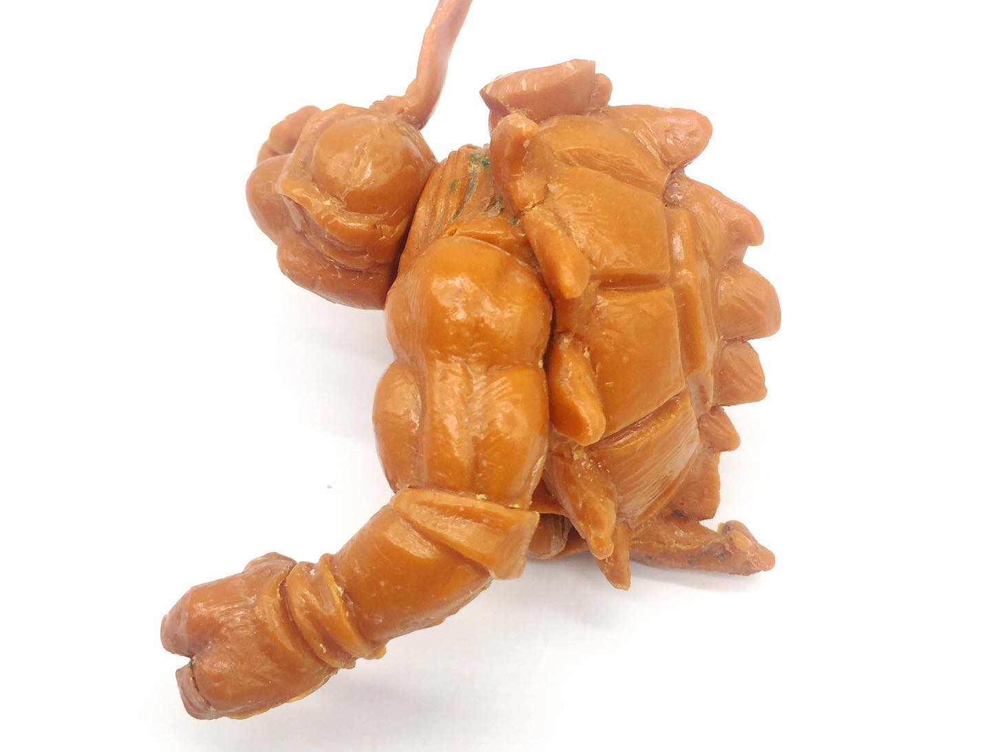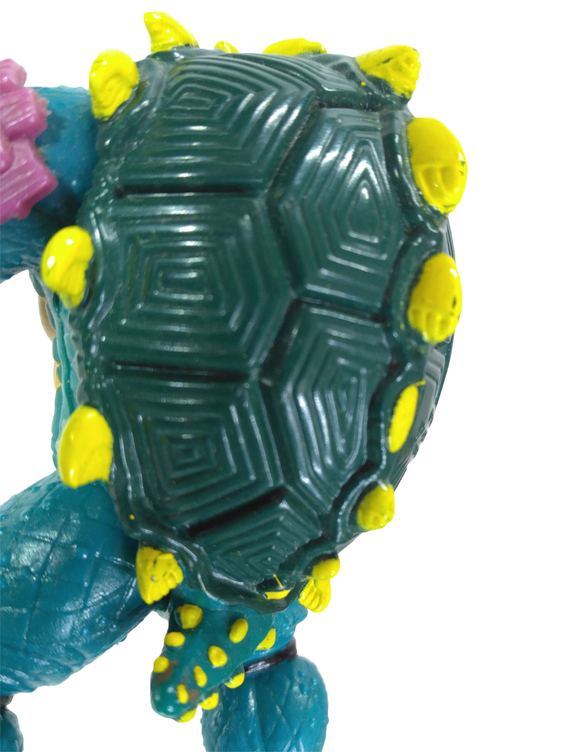 La peau se retrouve texturée à coups d’incisions et de pustules. Des pics parsèment la carapace, elle-même bien plus détaillée. Slash s’est retrouvé raccourci, mais non moins embelli !Lorsque l’on s’attarde sur la hard copy finale de la cinquième tortue, nous découvrons quelques détails très peu visibles sur le jouet. Notamment des craquelures au niveau du bas de son plastron, très bien mises en avant sur ce modèle. Hélas, tels des copies de photocopie, ces détails se sont retrouvés amoindris sur le jouet.