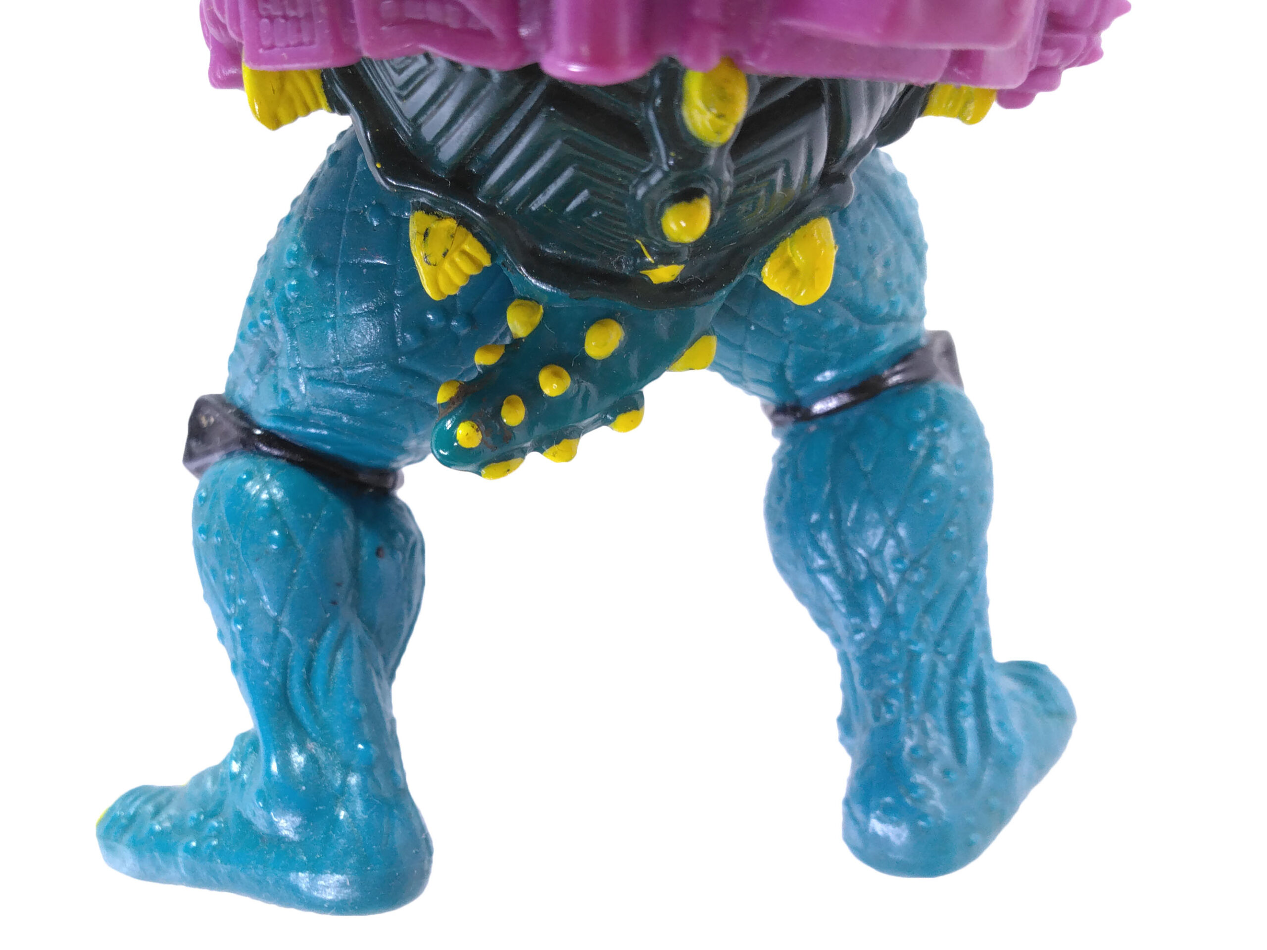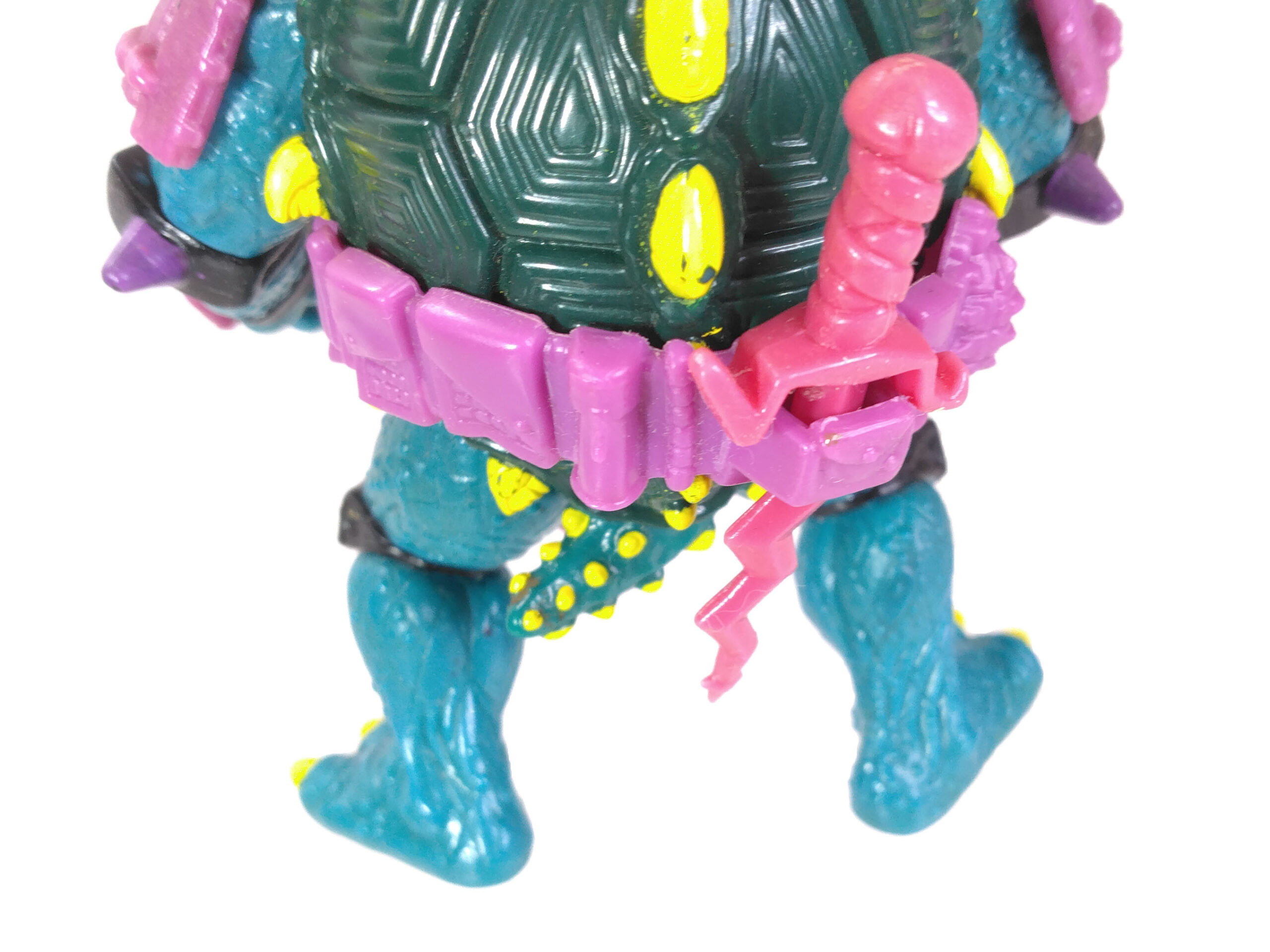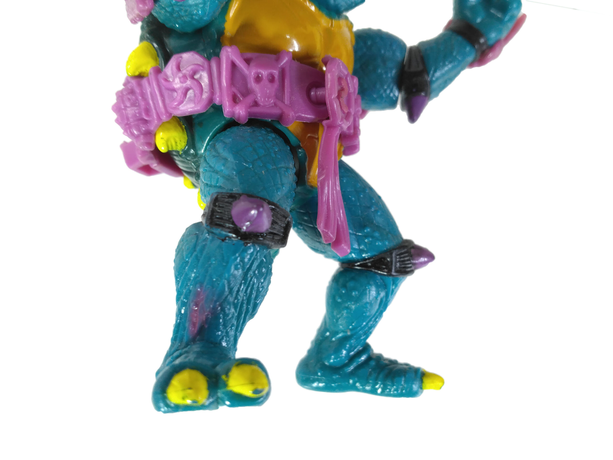 Mais à y regarder de plus près, on se rend compte que cette figurine grouille de détails. Sa peau est ciselée pour donner une imitation d’écailles. À celle-ci se rajoutent également une nuée de petites pustules qui parsèment les jambes et les bras. On pourrait se demander si ce n’était pas une volonté de Varner Studios de proposer un aspect « tortuesque » au toucher du personnage, point mieux élaboré par la suite pour les tortues Movie star produites l’année suivante.